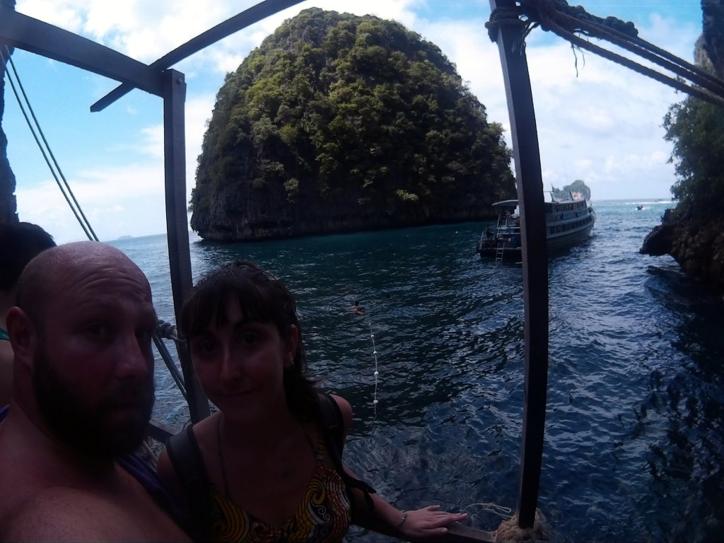 El tour, de 8:30 a 16:00, nos cuesta 1150 bahts por persona (algo menos de 30 euross), y parece que hayamos conseguido un precio imbatible. Viajamos 39 personas en una lancha, un poco apretaditos, y hacemos nuestro primer desembarco en Maya Beach, la famosa playa donde se rodó la película de La playa, con Leonardo DiCaprio. El enclave es, sin lugar a dudas, impresionante. Pero hay tal cantidad de gente pululando y haciéndose fotos (hacemos cálculos y creemos que habría más de 1000 personas) que casi prefiero irme ya de allí.