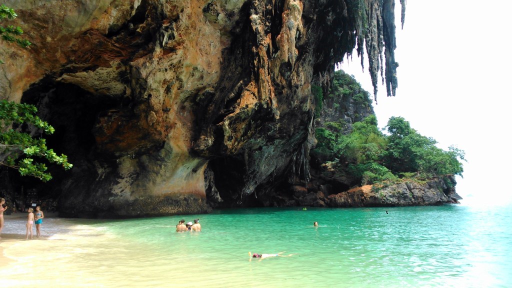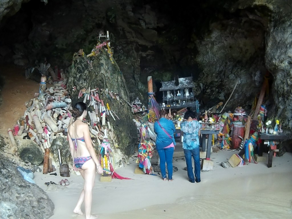 En un extremo hay una cueva llena de penes de madera de todos los colores y tamaños. Es curiosa la estampa. Hay un templete con inciensos y la gente se acerca a rezar, supongo que a algún tipo de dios de la fertilidad. Esa misma roca inmensa forma otra cueva sobre el agua, verde esmeralda, y al nadar te das cuenta de que desde muy arriba, algún manantial, las plantas o la propia tierra te están regalando unas gotas de agua dulce que caen como en cámara lenta hasta el mar en que te estás bañando. Por un momento parece que se para el tiempo. ¿Dónde estoy?