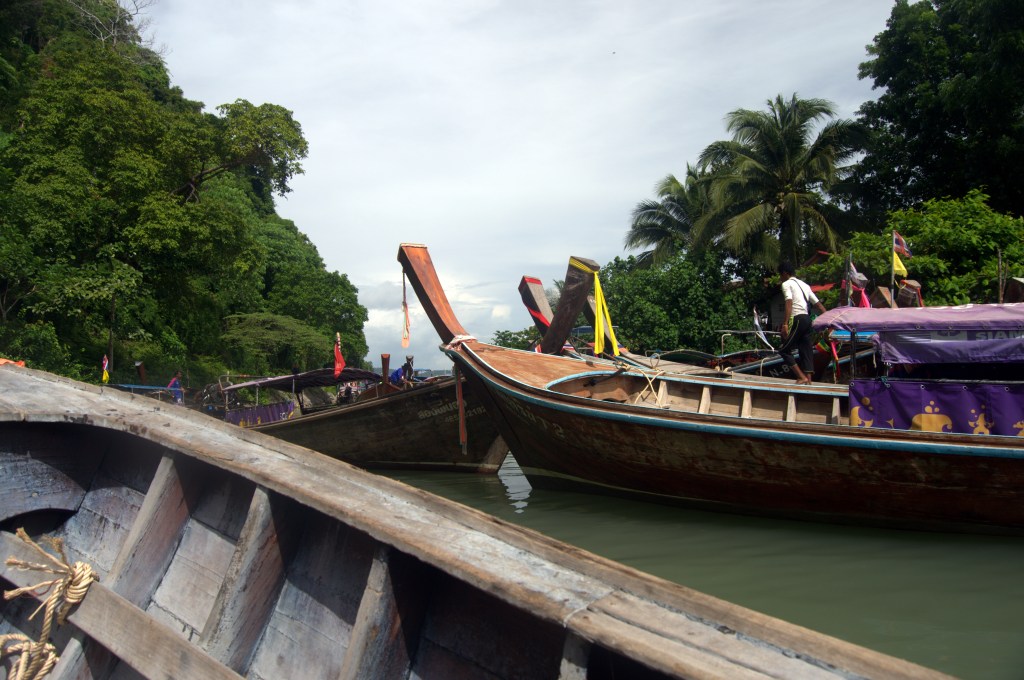 Delante mismo de nuestro hotel hay una parada de Long tails (esos típicos botes de madera con una proa alargada) que por 100 baht, unos 2,5€, te dejan en Railay en 15 minutos. Los botes circulan durante todo el día hasta las seis de la tarde pero no tienen un horario fijo, salen cada vez que se llenan.