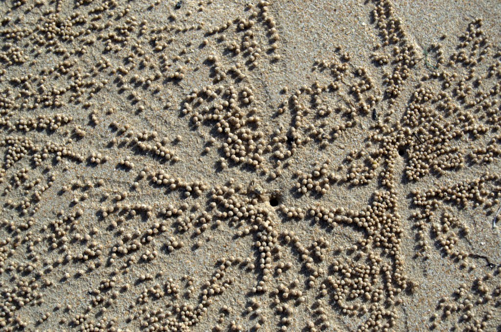 Después de comer cambiamos a la playa oeste, ahora con la marea baja. Nos entretenemos observando el arte improvisado e inconsciente de los cangrejos peleles, que, buscando comida entre la arena, crean unos fascinantes dibujos circulares con las bolitas de arena.
