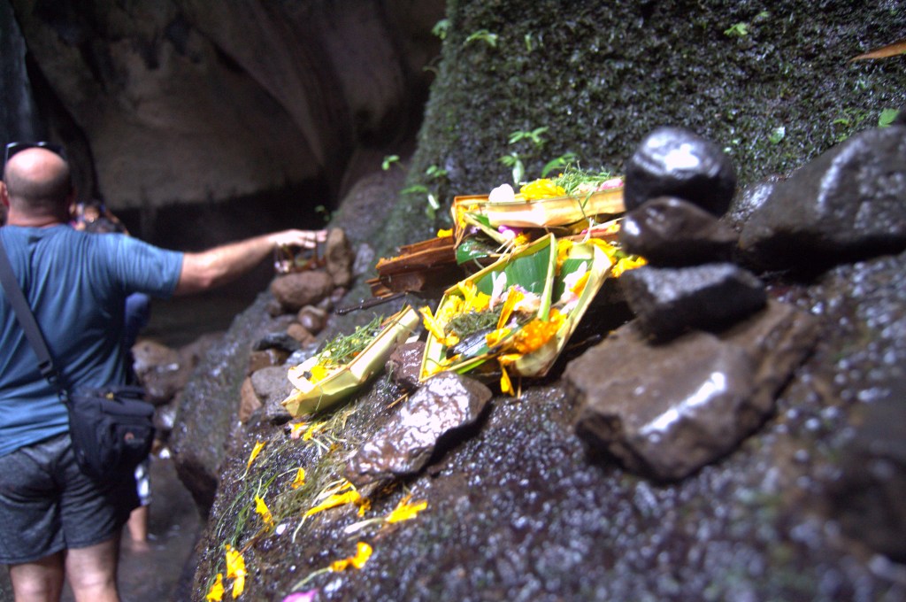 De nuevo toca pagar por entrar a un enclave natural. Un euro. Claro, tampoco te pueden cobrar mucho más… Como siempre, el río y su cascada están allí donde termina el escarpado valle de jungla. Así que todas las escaleras que ahora bajamos, luego costará subirlas… Un enclave para el que hay que pagar entrada es, obviamente, muy turístico. No resulta agobiante, pero nos cruzamos con bastante gente por el camino (en su mayoría familias de indonesios pasando el día de fiesta) y al llegar a la cascada hay, cómo no en esta era de Instagram, fila para hacerse una foto bajo el agua que cae de la roca hacia el interior de la gruta en que nos encontramos.