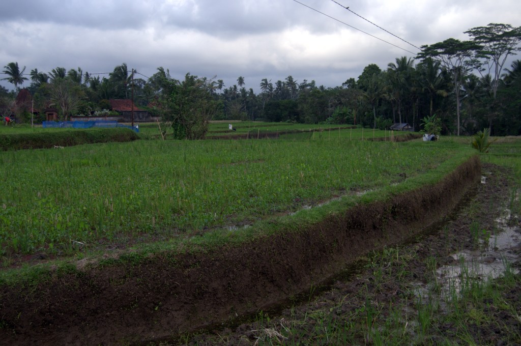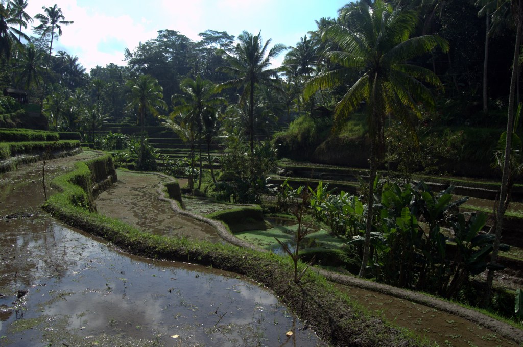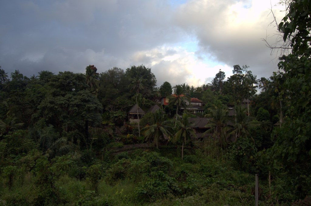 Esto es, por cierto, algo impresionante de Ubud. Te mueves por calles atestadas de tráfico con paupérrimas aceras rodeadas de tiendas, casas, restaurantes y hoteles. Excepto algunos callejones que se abren a los lados no ves nada más detrás de las casas. De repente, el patio de algún restaurante o bar te descubre que, nada más ahí mismo, se extienden la selva o los arrozales. Y uno que pensaba estar en un lugar estrecho…
