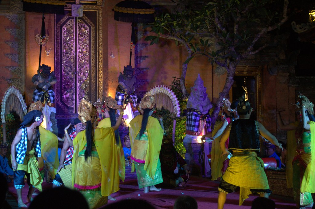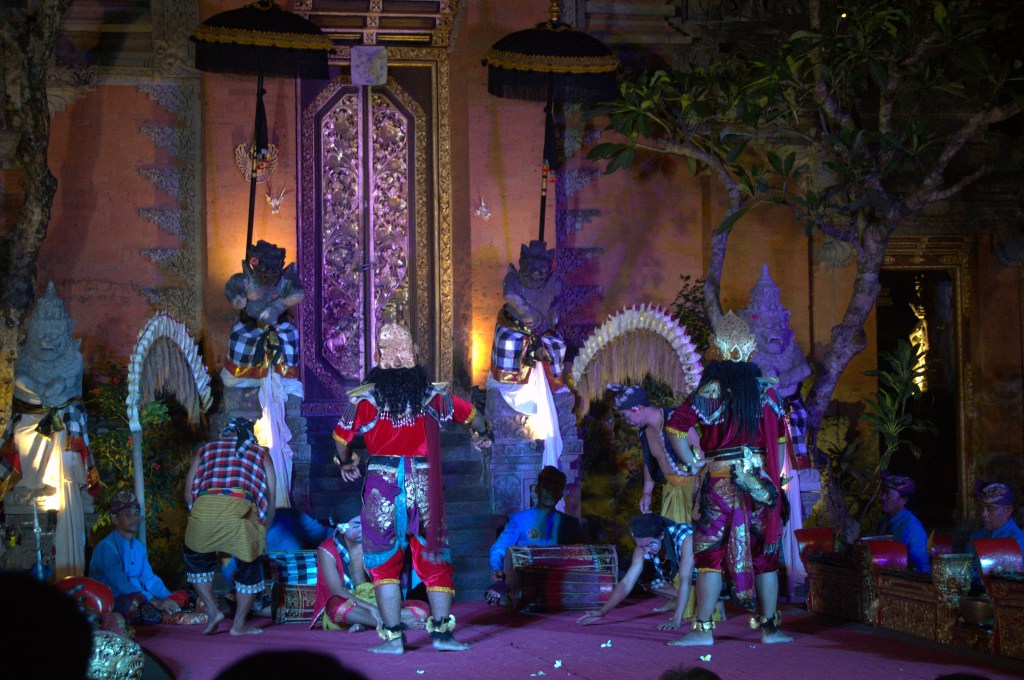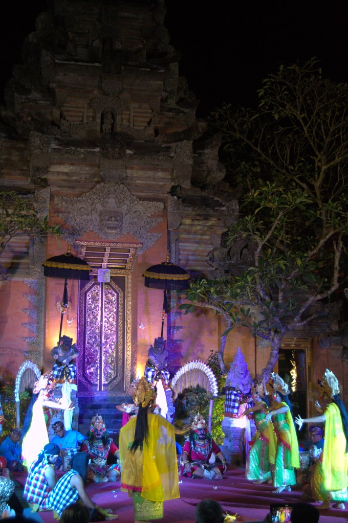 Se ha hecho de noche y, casi una hora antes de que empiece el espectáculo, ya estamos en el Palacio de Ubud, porque nos han avisado al vendernos el ticket de que fuéramos un rato antes para coger buen sitio. Y sin embargo… Los buenos sitios ya están llenos de gente. Nos sentamos en tercera fila y la verdad es que vemos bastante mal. Tanto que al final del espectáculo nos ponemos de pie en un costado y se ve mucho mejor. La organización, pésima. Y ya sabéis, la gente siempre se vuelve loca y egoísta cuando quiere conseguir el mejor sitio o la mejor foto. No importan nacionalidades ni edad. Quizás haya sitios mejores para ver uno de estos espectáculos tradicionales de la isla. Sin embargo, tener por escenario el palacio añade belleza al espectáculo.