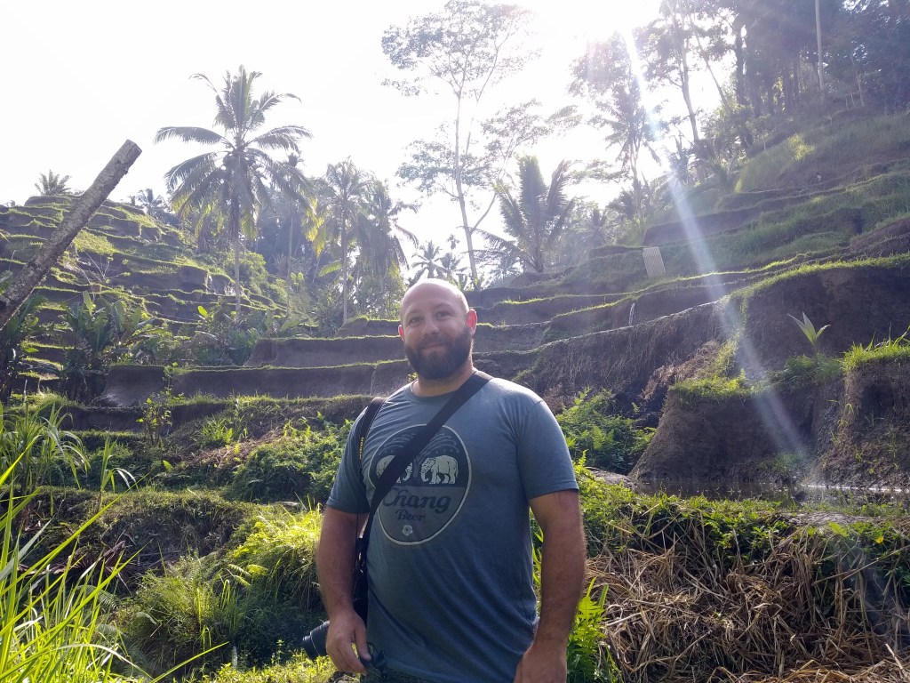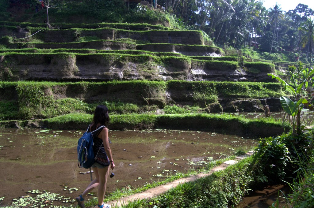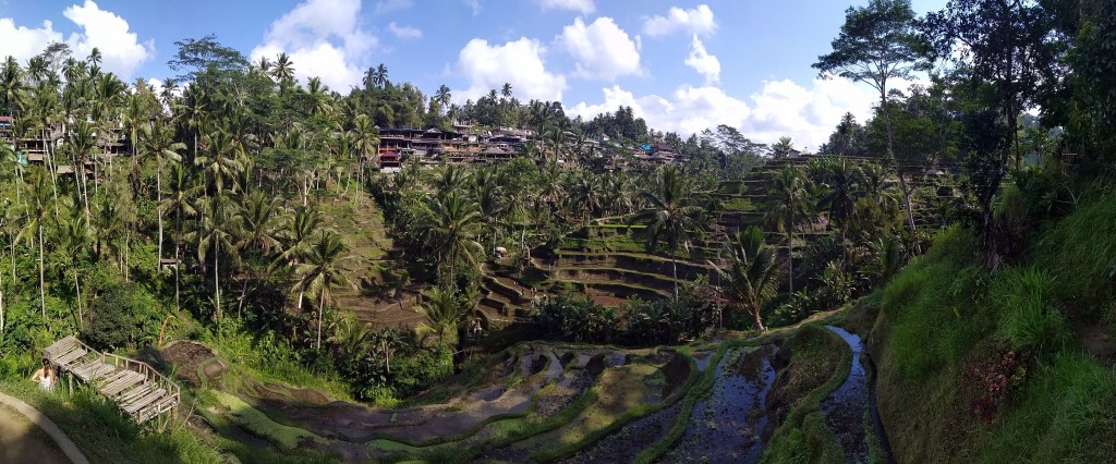 El paisaje es espectacular, similar al valle que nos encontramos en el templo de Gunung. Los arrozales parten la selva y el monte, haciéndolo bajar hasta el fondo del valle en escalones de verde y agua. Simplemente precioso. Aunque hay que decir que puedes ver otros rincones preciosos de selva y arrozales a lo largo de la isla. Aquí te encuentras con un pequeño bar de madera con preciosas vistas a cada 20 metros y con los famosos columpios de Bali, que te balancean sobre el paisaje, pagando un precio, por supuesto, para los que la gente hasta está haciendo fila.