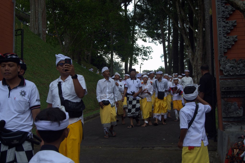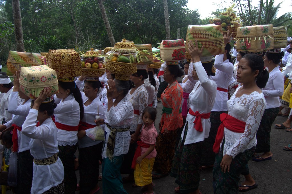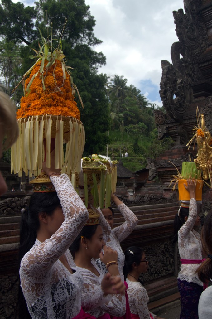 Apenas hemos entrado al templo cuando escuchamos bajar por una cuesta la música de la procesión. De repente entran cientos de personas, vestidas con los trajes tradicionales y las mujeres con las cestas de bambú de las ofrendas sobre sus cabezas. Precioso. Les seguimos y observamos cómo se colocan una vez dentro: las mujeres depositan las ofrendas sobre unas grandes mesas, ofrendas que tras el rezo y la bendición irán colocando en los diversos altares. Los hombres han entrado por otra puerta pero, al final, todos se sientan de rodillas en el suelo en la parte central. Silencio. Alguien hace unas oraciones en voz alta. Al mismo tiempo, en ciertos puntos de la oración, todos se ponen una flor en el pelo o detrás de las orejas. De nuevo silencio, rezo otra vez y flor. Después varios hombres se pasean entre la multitud arrodillada para bendecirles con un salpicón de agua.