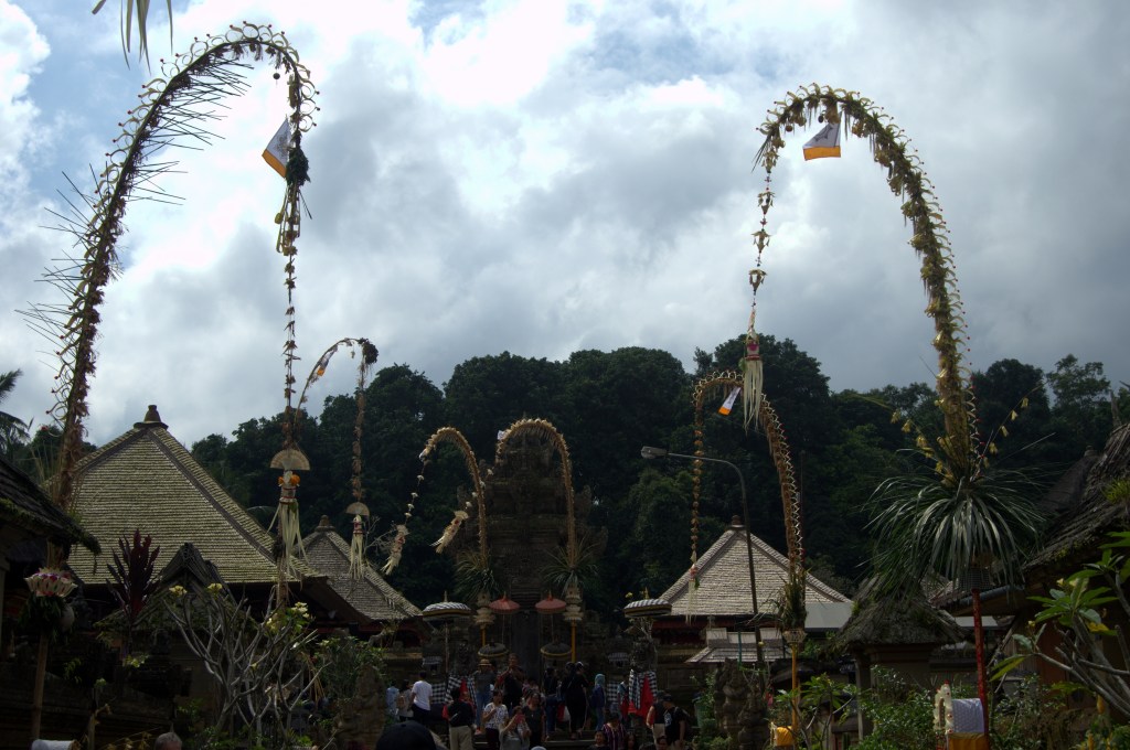 Putu, por el camino, nos cuenta que mañana empieza en Bali una ceremonia hindú que dura varios días. Nos cuenta que es la religión predominante en Bali y que prácticamente todo el mundo la celebra, primero con una ceremonia en sus casas y luego en los templos. Todas las casas tienen ya sus coloridas y largas palmas decorando la entrada, para proteger y ofrecer tributo. Es la ceremonia para celebrar que el bien vence sobre el mal, nos cuenta Putu, que se celebra cada seis meses.