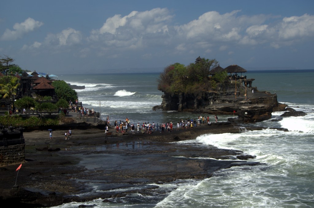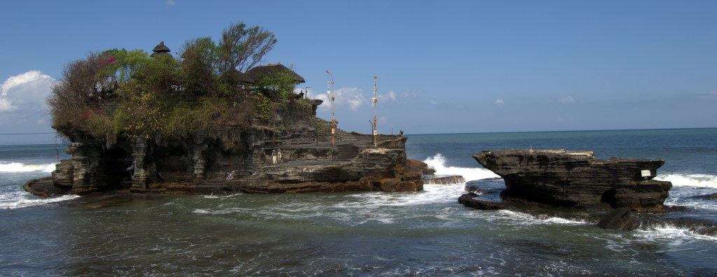 El templo de Tanah Lote, tras atravesar varias calles de tiendas de recuerdos, te sorprenderá sobre las rocas y el mar. En realidad, un poco como siempre, consta de diversos templos, que se extienden por un paseo sobre el mar, con el templo principal sobre unas rocas que se alzan por encima del mar. Ahora la marea está alta y no se puede acceder, al quedar el paso cortado por esas olas que siempre te pillan desprevenido aquí en Bali.