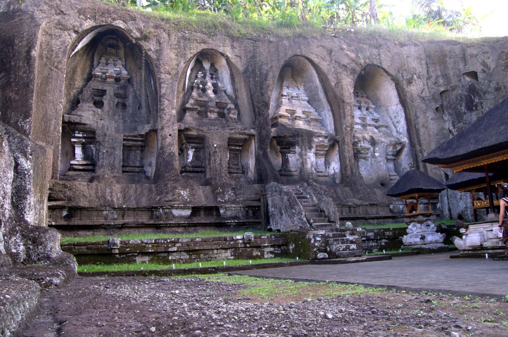 De hecho, una impresión similar nos asalta en nuestra última visita de hoy al templo Gunung Kawi. Podríamos decir que es el templo que más nos ha gustado de Indonesia. Primero, porque no es tan famoso y no tienes altas expectativas. Segundo, porque ni por asomo te esperas encontrarte con un lugar así tras pasar una puerta de un callejón cualquiera. Tercero, porque apenas hay turistas y puedes disfrutar de la calma, del ruido del agua del río y de los grillos. Y podría seguir… En definitiva, tras pagar la entrada comienzas a descender unas escaleras que a la subida se te harán infinitas. Nada más empezar, si te asomas un poco, verás que de repente la jungla se ha abierto a tus pies. Verás que los bancales de arroz se precipitan al valle por el que pasa un río, allá abajo donde después encontrarás los antiguos templos excavados en la roca, verás a unos niños bañándose allá más a la izquierda en las aguas limpias de un canal y verás senderos que se pierden a izquierda y derecha para que explores más a tu gusto, encontrando rincones con agua y templetes. Es un rincón para saborear.