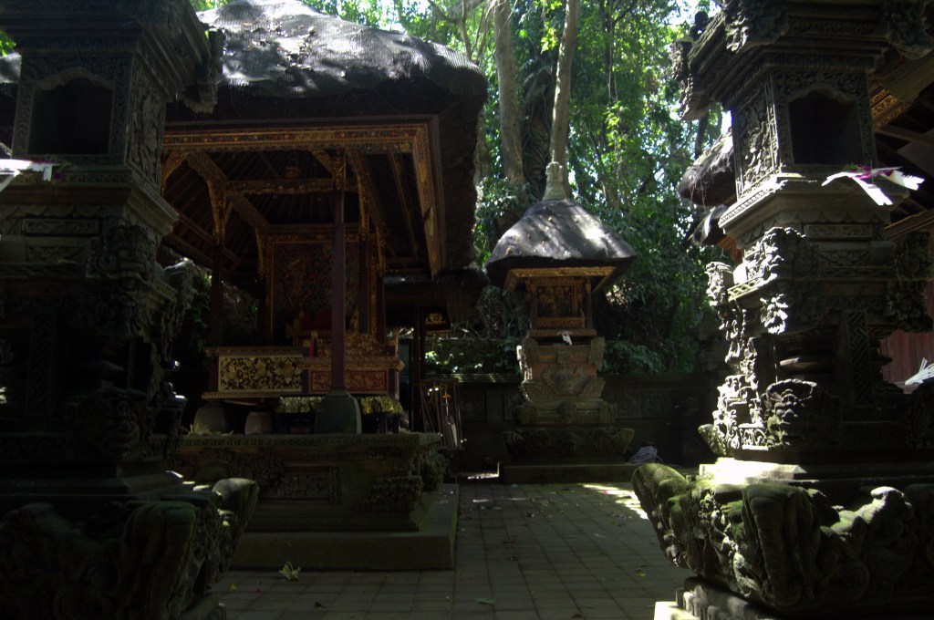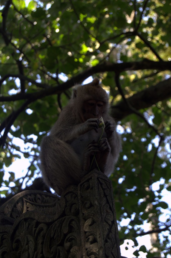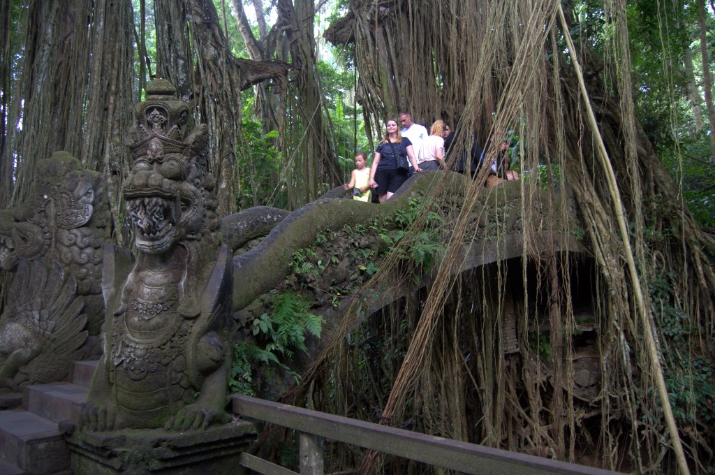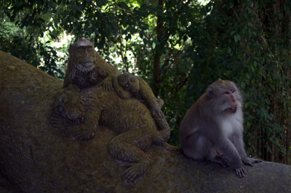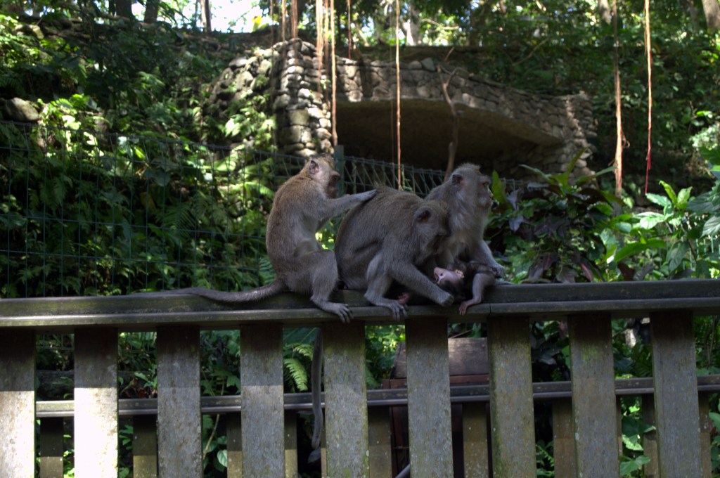 Comenzamos visitando el Monkey Forest. Se trata de un santuario donde viven cientos de monos en libertad. La entrada cuesta 5 €. Allí les alimentan, pero los monos son libres de entrar y salir del recinto a su antojo. Dentro del santuario hay también templos y lo suyo es darse un paseo para divertirse viendo a estos animalitos tan entrañables. Eso sí, cuidadín, cuidadín con los bichejos tan monos… Como ya hemos explicado antes, hay que tener cuidado de que no te roben cosas y es que aquí hay tantos monos que no ves ni por dónde te vienen los ladronzuelos. Bueno, en realidad, si estás alerta sí que los ves. Se te acercan, calculando el ángulo para saltar sobre tu mochila… Cuando lo hagan, tú estarás un tanto rígido e indefenso, con el mono sobre tu espalda, y tus compañeros estarán a tope haciéndote fotos o un vídeo. Entre tanto… El monito te abrirá la cremallera (sí, sí, saben hacerlo, que lo hemos visto) y cogerá lo que pille para salir corriendo con su botín.