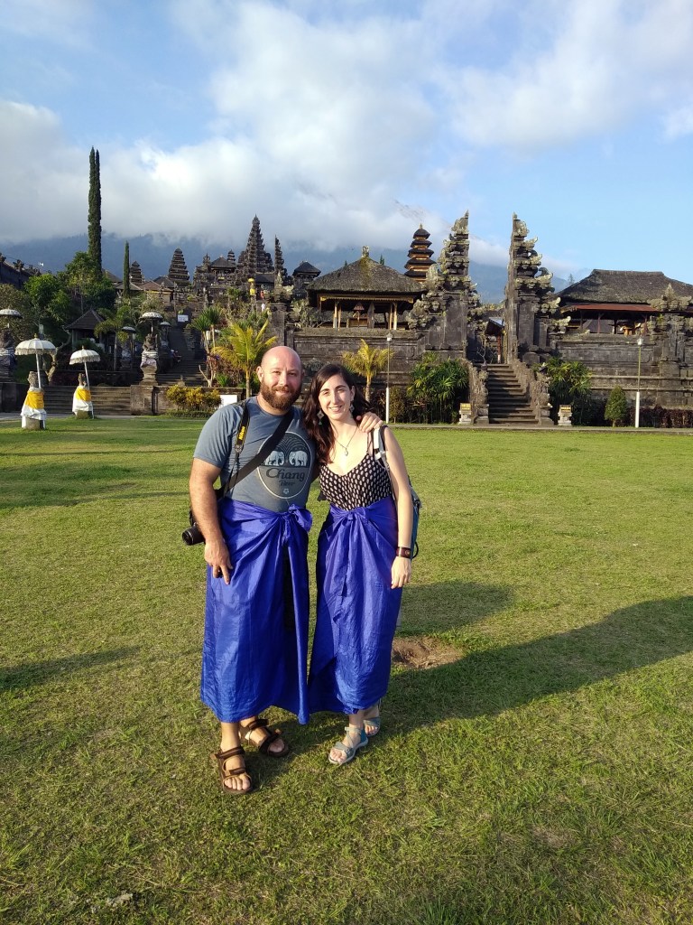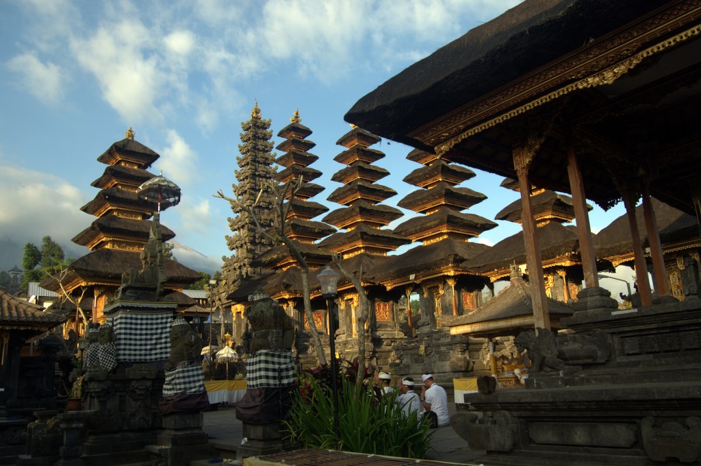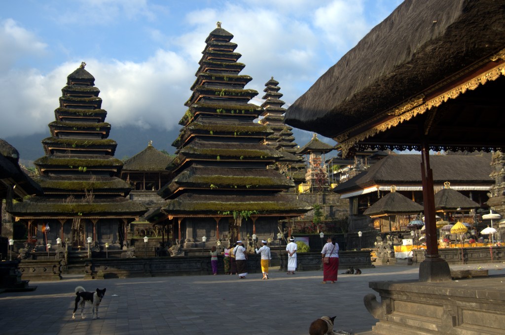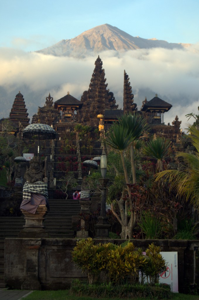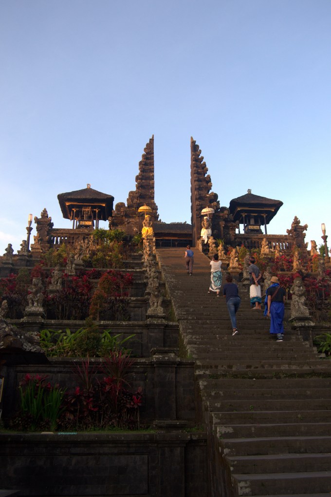 Nuestra última parada de la jornada es la más impresionante. El templo Besakih, «el templo madre» . Este, según nos cuenta un guía del templo nada más llegar, es el templo más importante de Bali. Es hinduista y tiene varias ceremonias muy importantes que se celebran cada mucho tiempo, una de ellas, cada doscientos o trescientos años; otra, una vez al año, en marzo o abril, con la luna llena del año nuevo hindú. Hacen desde allí una peregrinación andando hasta el mar que dura tres días. Tras ella vuelven, celebran un día de descanso en el que, según nos cuenta más tarde Darta, todo el mundo se encierra en sus casas y en las calles por fin no se oyen los coches. Y, finalmente, regresan al templo al día siguiente para orar.