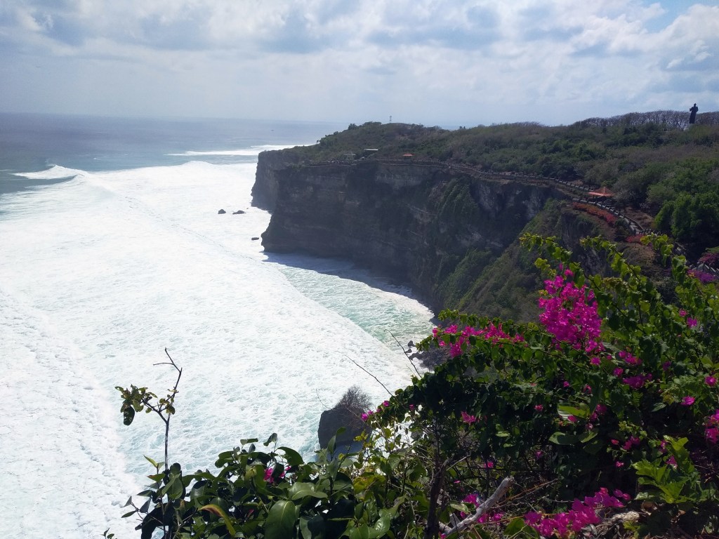 Por la mañana visitamos, lo primero, el templo de Uluwatu, parcialmente cerrado porque muchas zonas están reservadas sólo para las ceremonias. Pero puede verse por entre las rejas de las puertas y a lo lejos desde los acantilados vecinos. El templo está construido sobre un acantilado impresionante sobre el mar. Ya conforme nos acercábamos oíamos el bramido de las olas, tsunámicas, que no dejan de impresionarnos durante todo el día. Los acantilados y los alrededores del templo se cubren de flores de colores, lo cual, junto a los colores blancos del templo, las rocas y el azul del cielo y del mar, dan una paleta de colores magnífica. Por el recinto, lo más divertido de todo: ¡monos! Aquí tenemos nuestro primer encuentro con monos en estado salvaje. Hay un montón de familias de monitos viviendo por el templo. Puedes acercarte a ellos todo lo que quieras pero… No intentes tocarlos y cuidado con tus gafas de sol o cualquier otra cosa que puedan arrancarte de encima, ya que debe de ser bastante habitual. Nos avisan de ello al comprar la entrada y, efectivamente, el bosquecillo por donde viven los simpáticos ladrones está lleno de gafas rotas….
