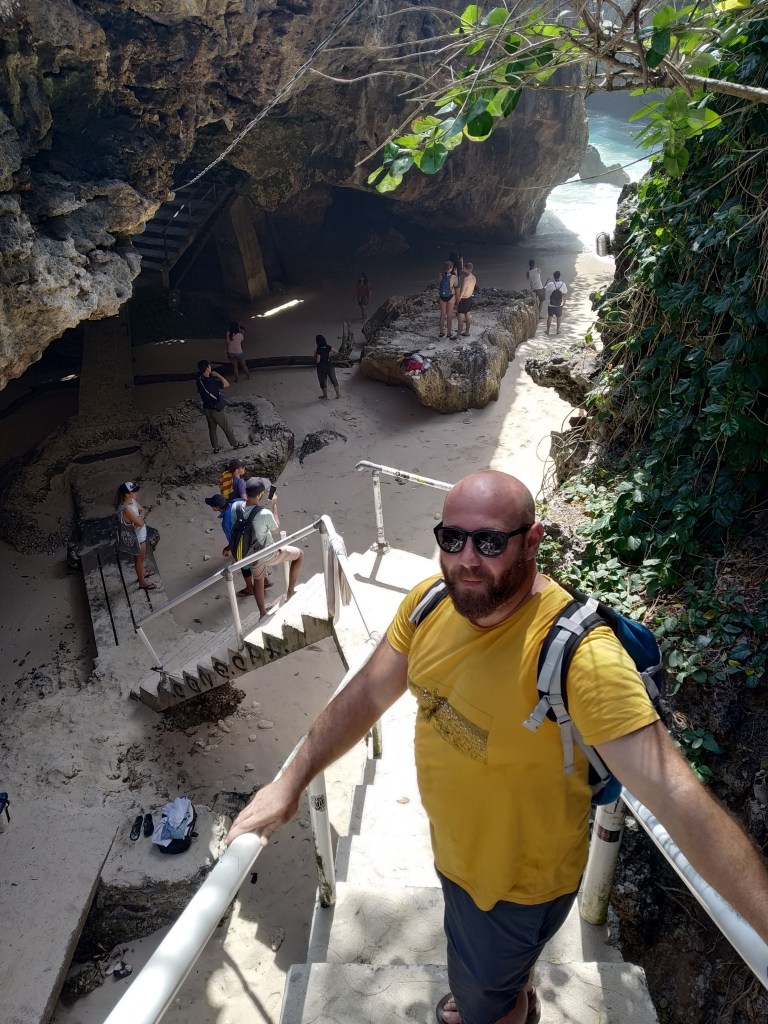 ¡Es hora de conocer la playa indonesia! Nos dirigimos a la playa de Suluban, para la que hay que bajar un buen tramo de escaleras. Al final llegas a un pequeño hueco de arena, entre rocas, casi como una gruta, playa a la que entran unas olas chocantes que impiden cualquier acercamiento al baño… De hecho, las olas nos dan alguna sorpresa y acabamos calados. Divertido y bonito es un rato, pero no te puedes bañar. Encaramados en la roca de la derecha hay varios bares y muchas tiendas de recuerdos.