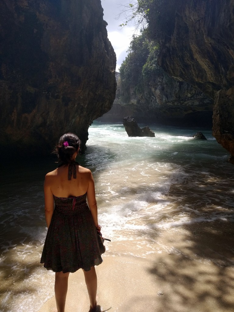 Para movernos pensábamos alquilar una moto, pero en el momento nos da un mal pálpito y finalmente decidimos que mejor ya lo haremos en otra isla con menos tráfico, aunque aquí todo el mundo se alquila una moto. Realmente, si la coges sin miedo, es el mejor medio de transporte. Sin embargo, nosotros acabamos desplazándonos con los «taxis» de Grab y nos sale prácticamente por el mismo precio, ya que son súper baratos (los taxis normales valen como cuatro veces más por aquí). Así que tener Internet y descargarse la aplicación aquí puede ser de mucha ayuda. Eso sí, este día nos debimos de quedar sin datos y no nos funcionaba la aplicación por momentos, así que tuvimos que hacer algunos tramos del camino andando, lo cual no es muy buena idea porque la mayor parte del rato vas por carreteruchas sin un ápice de arcén y es peligroso. Sin embargo, gracias a ir así, acabamos metiéndonos por un camino que nos sacó a un acantilado con unas vistas espectaculares del mar y las playas colindantes con su propia playa vacía y de virgen arena blanca, y allá que bajamos a disfrutarla un rato.