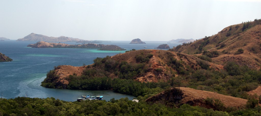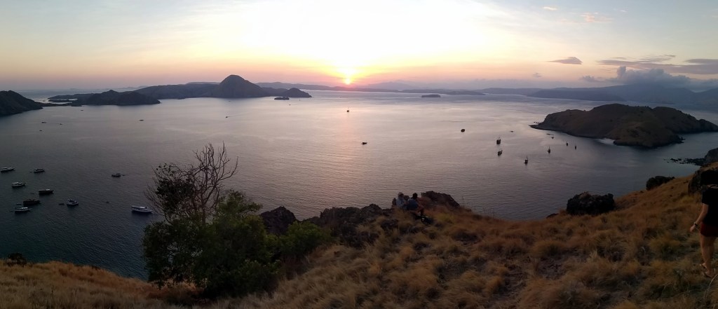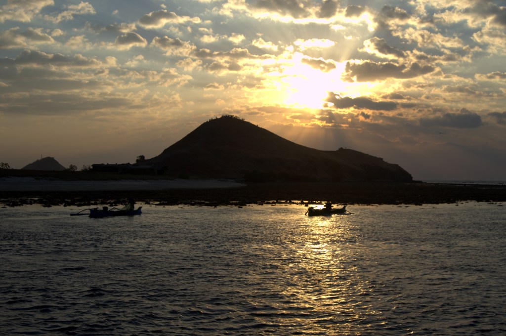 El viaje, en la dirección en que lo hacemos nosotros, comienza muy lento, ya que el primer día salimos del puerto de Gili Air a las 7:30, llegamos a Lombok, donde nos recogen a todos y nos suben en unos minibuses que nos llevan primero a un punto de encuentro (allí nos dan un café y unos aperitivos y nos tienen un buen ratazo haciéndole el check-in a todo el mundo) y luego nos conducen hasta el otro lado de la isla para coger allí el barco. Finalmente, zarpamos a eso de las 14:00. El viaje aún no ha empezado y ya se hace eterno. Ese primer día de viaje te hacen una parada para ver el atardecer desde la isla de Kenawa, que es casi un peñón de suaves laderas ocres y naranjas.