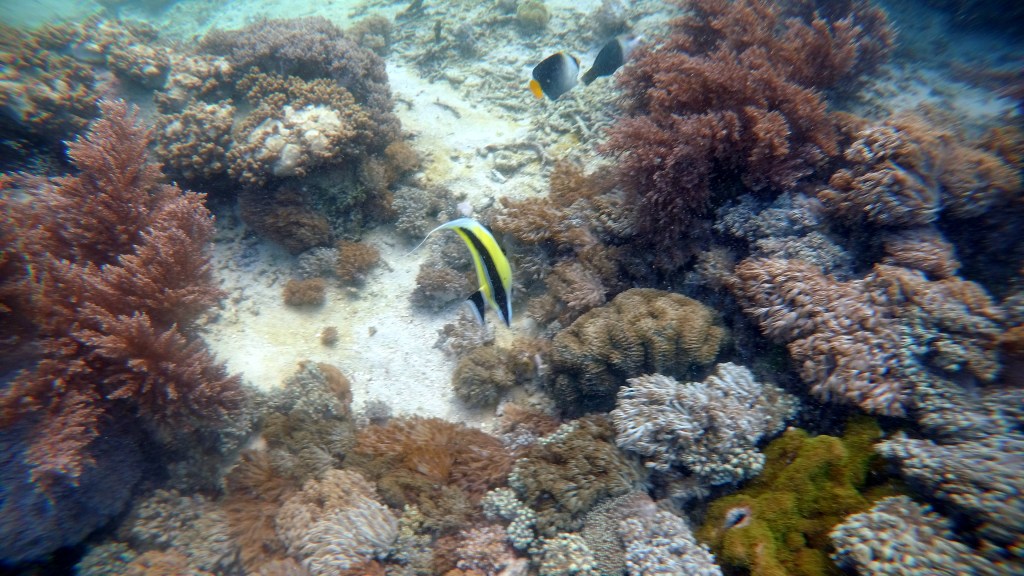 Entonces, en un punto rodeado de islas, nuestra tripulación nos dice: «¡Manta point , manta point!» Nos hacen ponernos las gafas de bucear a toda prisa y, en cuanto vislumbran que hay mantas cerca… «Jump!» Durante un rato buceamos en grupo buscando mantas. Algunos afortunados consiguen disfrutar del espectáculo y ven hasta 6 o 7 de ellas, entre ellos, Jorge. Otros, como yo, que no nos manejamos tan bien en el agua, luchamos por seguir al grupo, sacarnos el agua de las gafas y no gastar todas nuestras fuerza luchando contra las olas y la fuerte corriente. Finalmente, vemos que el bote de nuestro barco ha venido a recoger a los rezagados y, sin dudarlo un instante, somos unos cuantos los que trepamos a él desesperados y les decimos bye, bye a las mantas… Una lástima.