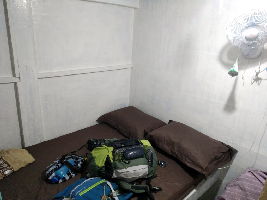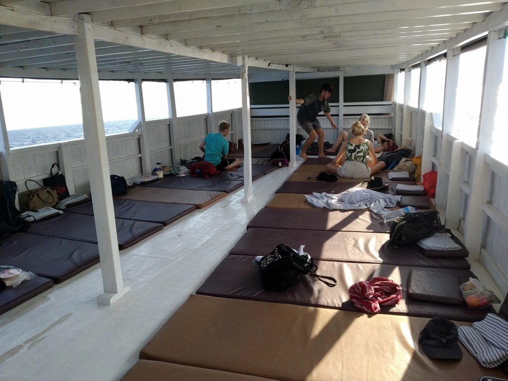Hay varias compañías que hacen este viaje, nosotros lo hacemos con Wanua Adventures. El billete es caro, pero te incluye el alojamiento con pensión completa durante tres noches, el viaje en sí y la entrada al parque natural de Komodo. Si echas cuentas, al final no es para tanto, pero soltar de golpe unos 200 € por cabeza duele un poco. También puedes pagar un poco menos y dormir en la cubierta, sobre una esterilla y con otras 20 personas, codo con codo. Pero nosotros, igual es que estamos mayores ya, sabemos que si hacemos eso no pegaremos ojo, así que cogemos un camarote. Tampoco es que sea un lujo el camarote, apenas es el espacio que ocupa una cama de… ¿quizás 1 metro 20? Pero al menos puedes cerrarte bien del aire del mar y tienes tu pequeño rincón de intimidad.
