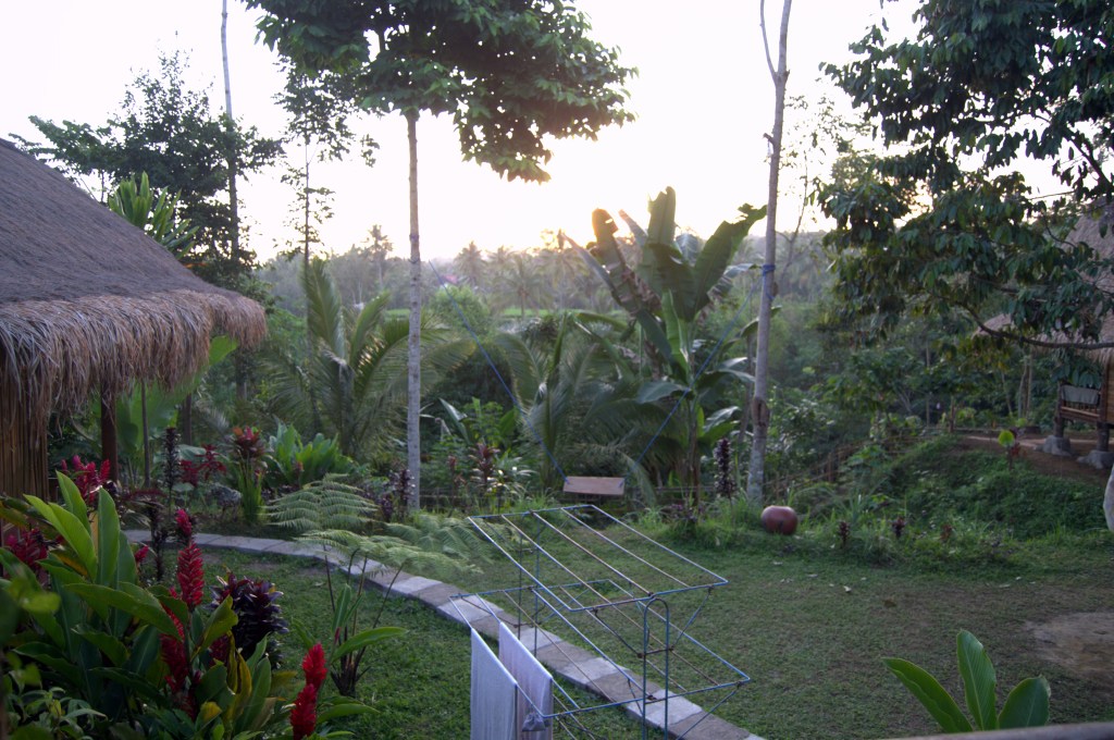 Nos alojamos en un hotel de bungalows al que se accede por un sendero y está entre selva y arrozales. El enclave y el alojamiento en sí es, sin duda, precioso, una maravilla. Los colores en toda la zona son brillantes, con el verde y el rojo de las flores predominando.