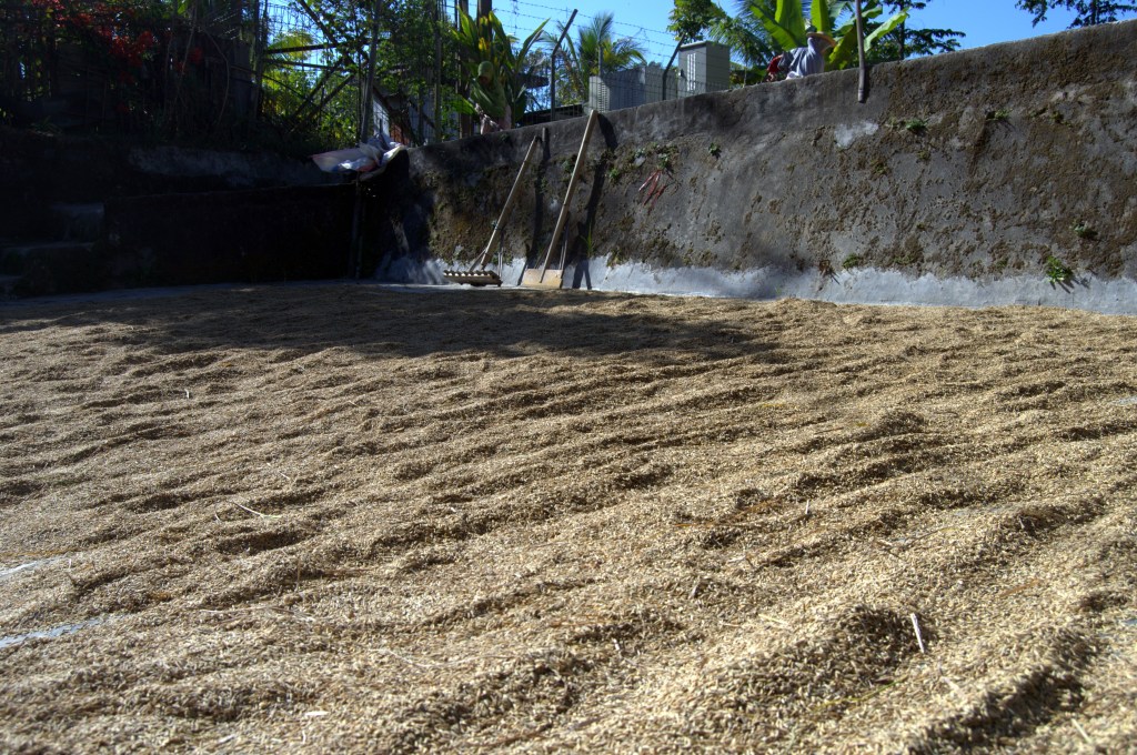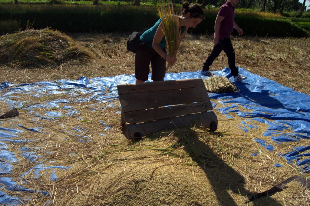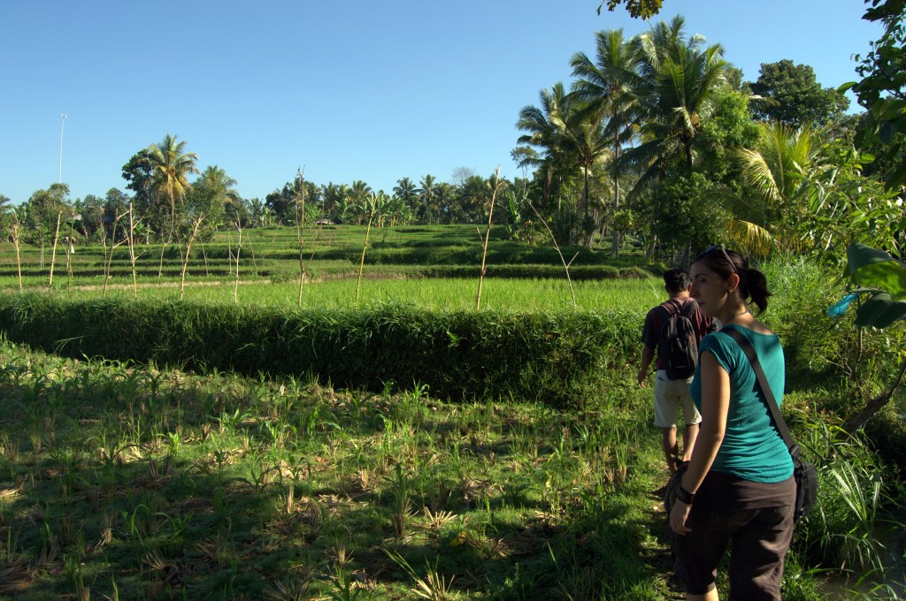 El camino a veces se pone complicado: puentes de bambú inestables o que se rompen, escalones muy altos, senderos muy estrechos, barro, piedras, agua, subes mucho, bajas mucho… El verde reluce a tu alrededor y cuando estás en campo abierto puedes ver el Rinjani al fondo. Palmeras, flores, arroz, maíz, tomates, cocos, perros, gallos, polluelos, gatos, arañas, lagartos, agua… Por los campos vemos a gente trabajando. Todo el mundo conoce a Jonny. Unos hombres están sacudiendo el grano de arroz y nos dejan probar a hacerlo nosotros. Pasamos por las casas de los campesinos (a veces más estables, a veces cabañas de bambú) que viven allí mismo entre los arrozales y todos nos saludan. Las niñas nos piden bolígrafos. Más tarde nos explican que los quieren para fardar en el colegio diciendo que su bolígrafo es de no sé qué país y que se lo ha dado un extranjero. ¡Una pena que no tengamos ninguno para darles!