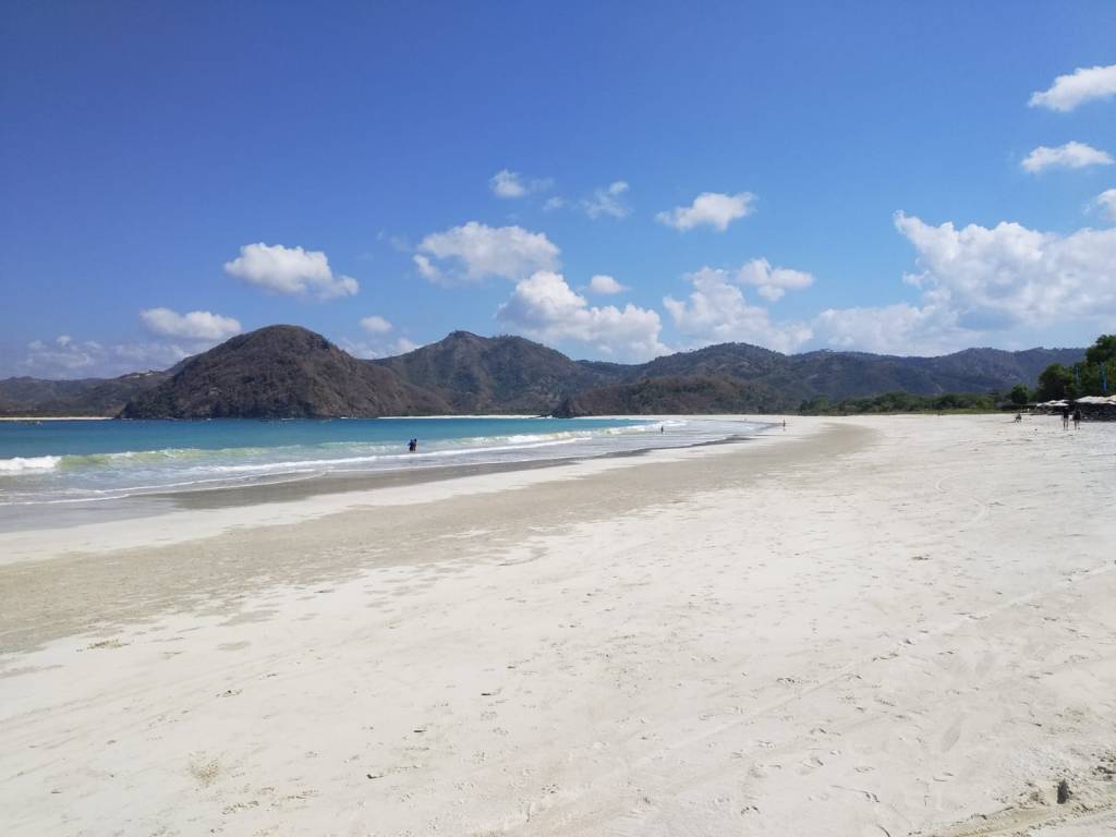 Al día siguiente nos queda una mañana libre, antes de coger por la tarde el avión que nos llevará a Yakarta. De modo que, como tenemos playa a media hora, pedimos un Grab, cogemos toallas y nos vamos a la playa de Pantai Selong Belanak. Simplemente porque es la que más cerca nos pilla. Y resulta ser un lugar precioso, con una extensísima playa de arena blanca y aguas turquesas. Es perfecta para el baño, porque el fondo es de arena. No hay demasiada gente y, además, puedes perderte a lo lejos donde no hay nadie. También hay una zona de chiringuitos llena de escuelas de surf. La playa tiene rachas de olas perfectas para principiantes. El agua está llena de gente aprendiendo a cabalgar las olas.