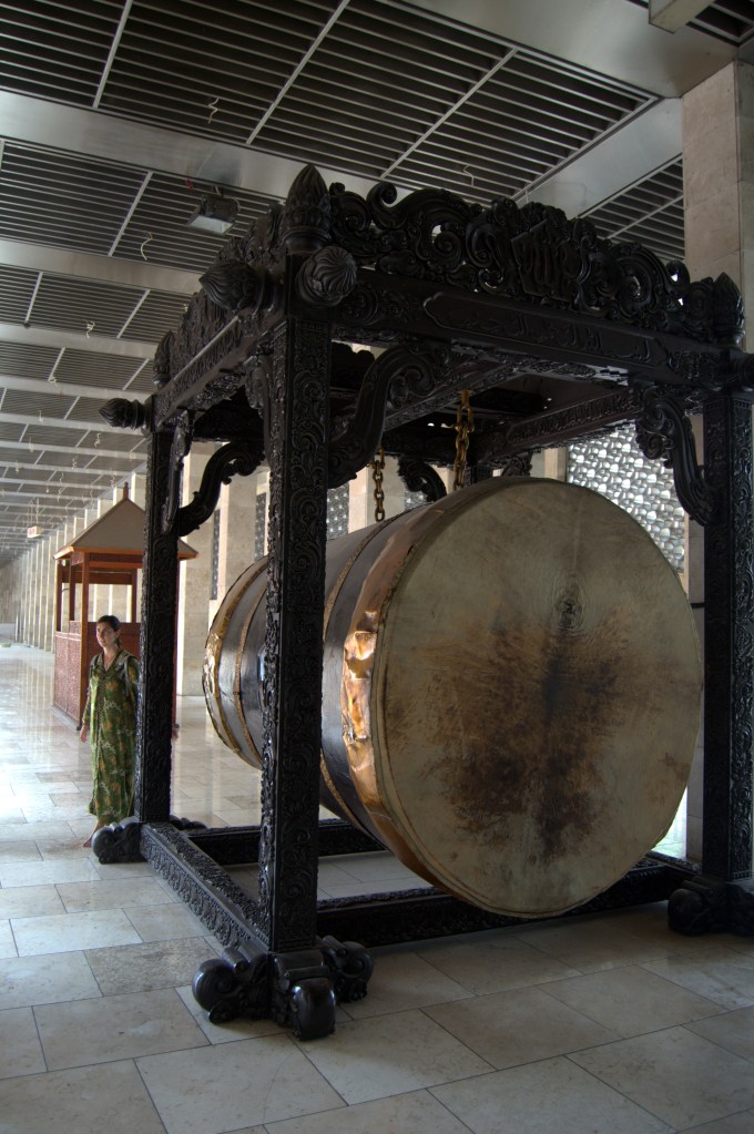 La entrada es gratuita y te prestan una túnica para taparte. Por cierto, durante todo nuestro viaje, en todos los templos que hemos visitado te prestan un sarong para poder taparte las piernas y entrar, así que no caigáis en la trampa de las mujeres que en las inmediaciones tratan de venderte uno diciéndote que lo vas a necesitar (sobre todo en Bali). En la mezquita de Istiqlal una mujer nos acompaña a los dos por el interior y nos explica todo el simbolismo que hay en la construcción de la mezquita, en el número de columnas que sostienen la cúpula, etc., así como otros detalles sobre la forma en que rezan (cuando la visitamos están en pleno rezo) y su significado. Resulta muy interesante que te lo expliquen todo.