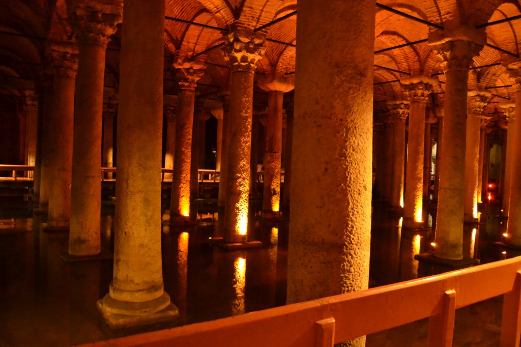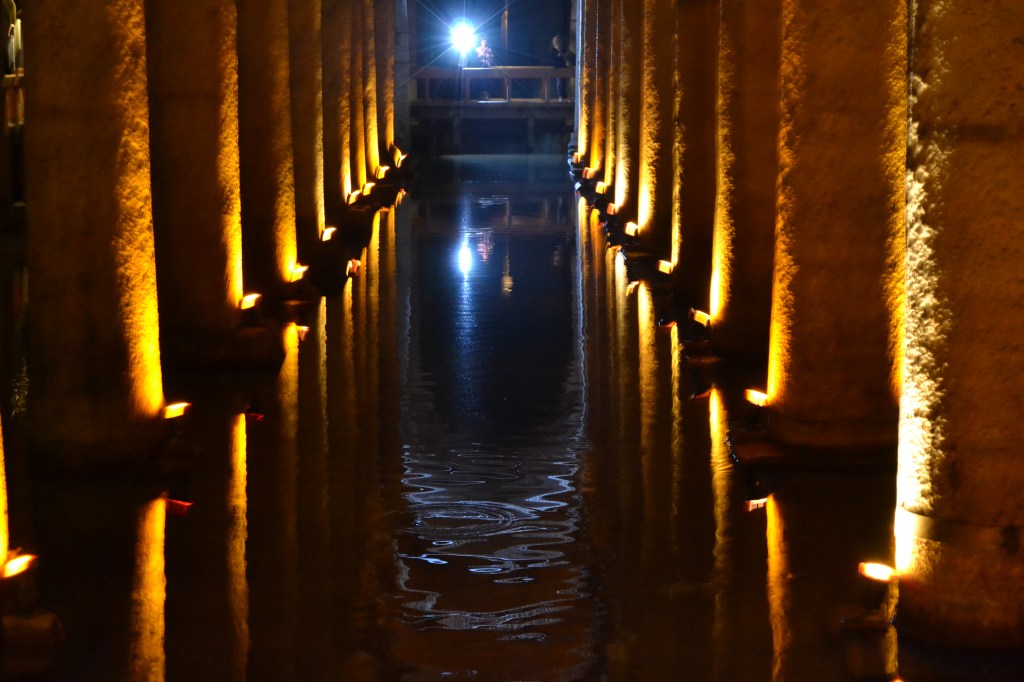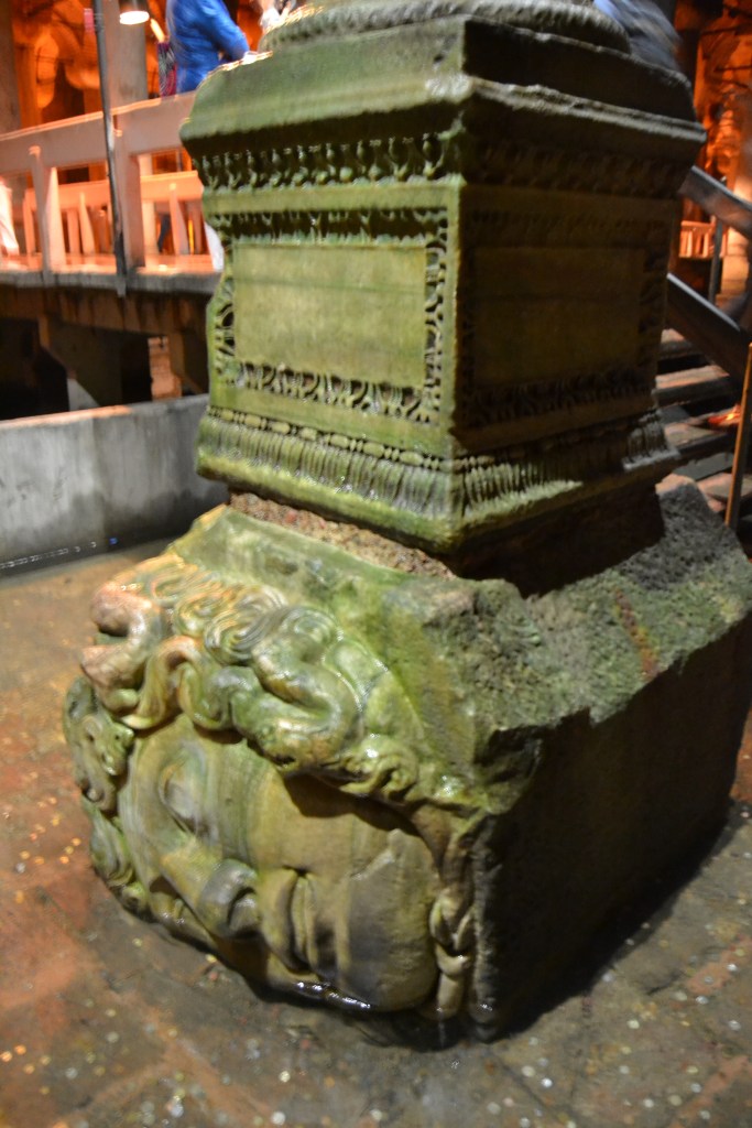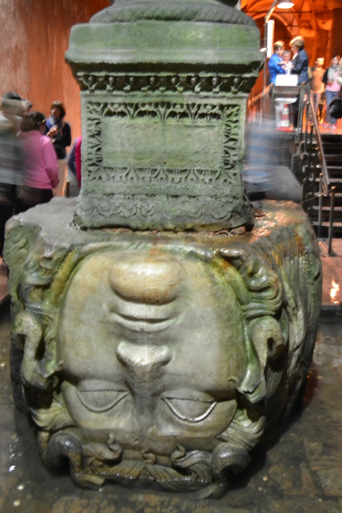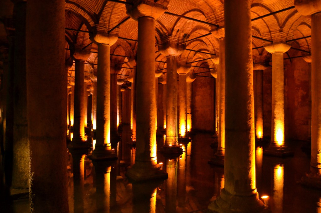 Las Cisternas se construyeron en el subsuelo de una antigua basílica de la que hoy ya no queda nada. Quizás por eso es una sala llena de columnas y cúpulas. Su función, en el siglo VI, era abastecer de agua al palacio, por lo que eran unos depósitos de agua. Hoy en día, podemos pasear sobre el agua por unas pasarelas. La luz tenue, el ondear del agua y los enormes peces de colores que nadan en ella te transportarán a un mundo onírico. Busca también las dos cabezas de Medusa (pero cuidado, no las mires a los ojos). Hay varias teorías, pero parece ser que lo más probable es que las colocaran simplemente para utilizarlas como base de algunas columnas.