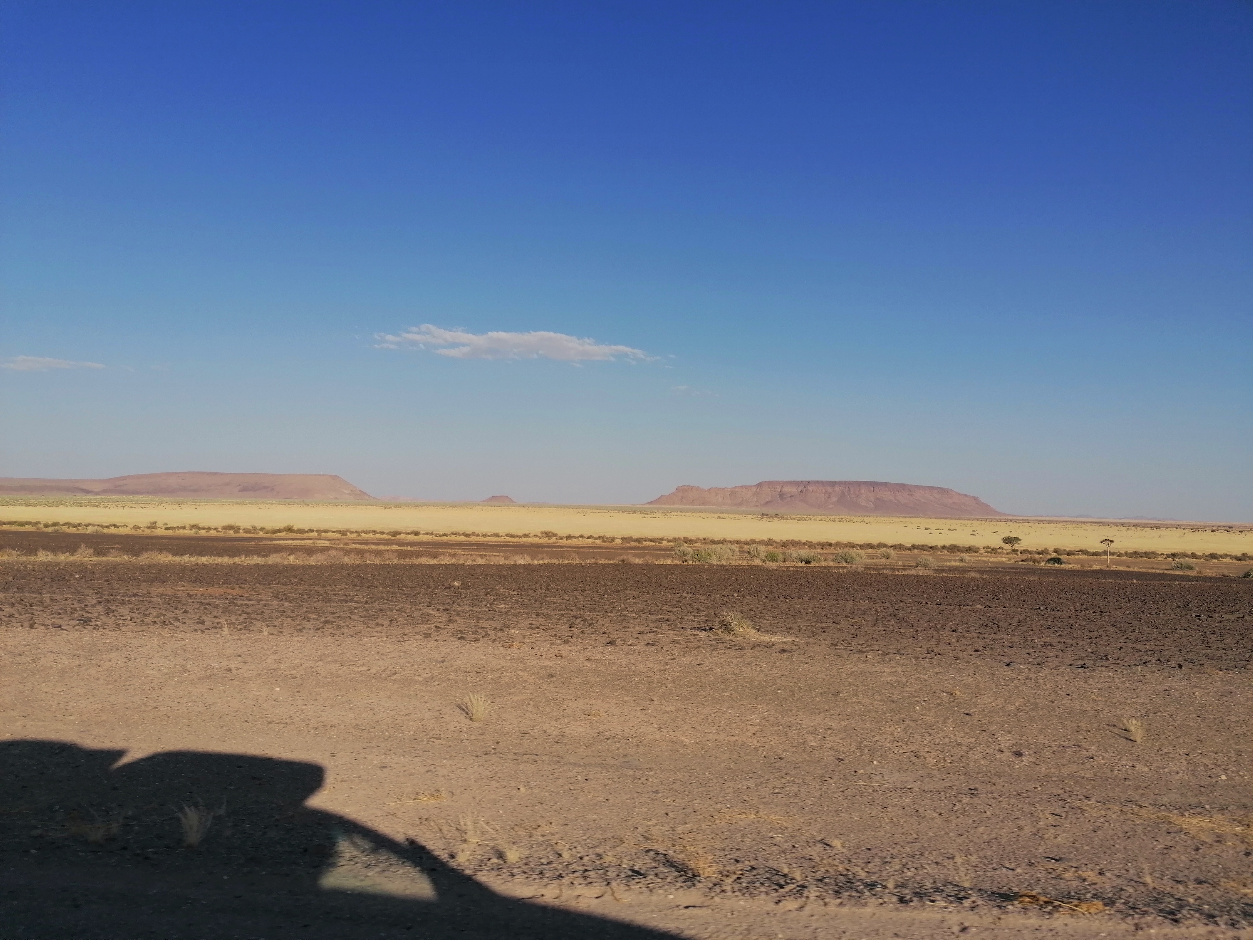 Primero, ¿cómo fue este viaje tan largo hasta el Fish River Canyon? Pues bien, nosotros lo hicimos desde Sesriem y nos llevó casi 8 horas, con la pausa para comer en el camino incluida. La mayor parte del camino son carreteras de grava pero en buenas condiciones (de las que venimos circulando la mayor parte del viaje) pero hubo un punto en el que lo pasamos un poco mal, ya que el GPS nos metió por un camino en muy mal estado que ni siquiera sale en el mapa. Era una de las carreteras F (las de la letra B son las mejores, bajando poco a poco hasta las F, que son las peores) y, aunque el tramo no duró mucho, había que ir muy despacio porque los baches eran constantes, había tramos arenosos y hasta nos tocó atravesar un río (¡con agua, creo que fue el primer río que vimos con agua!) En fin, que es un viaje largo y, a diferencia de otros, este paisaje árido no presenta gran atractivo más allá de las extravagantes montañas con mesetas por sombrero que se recortan constantemente en el horizonte.
