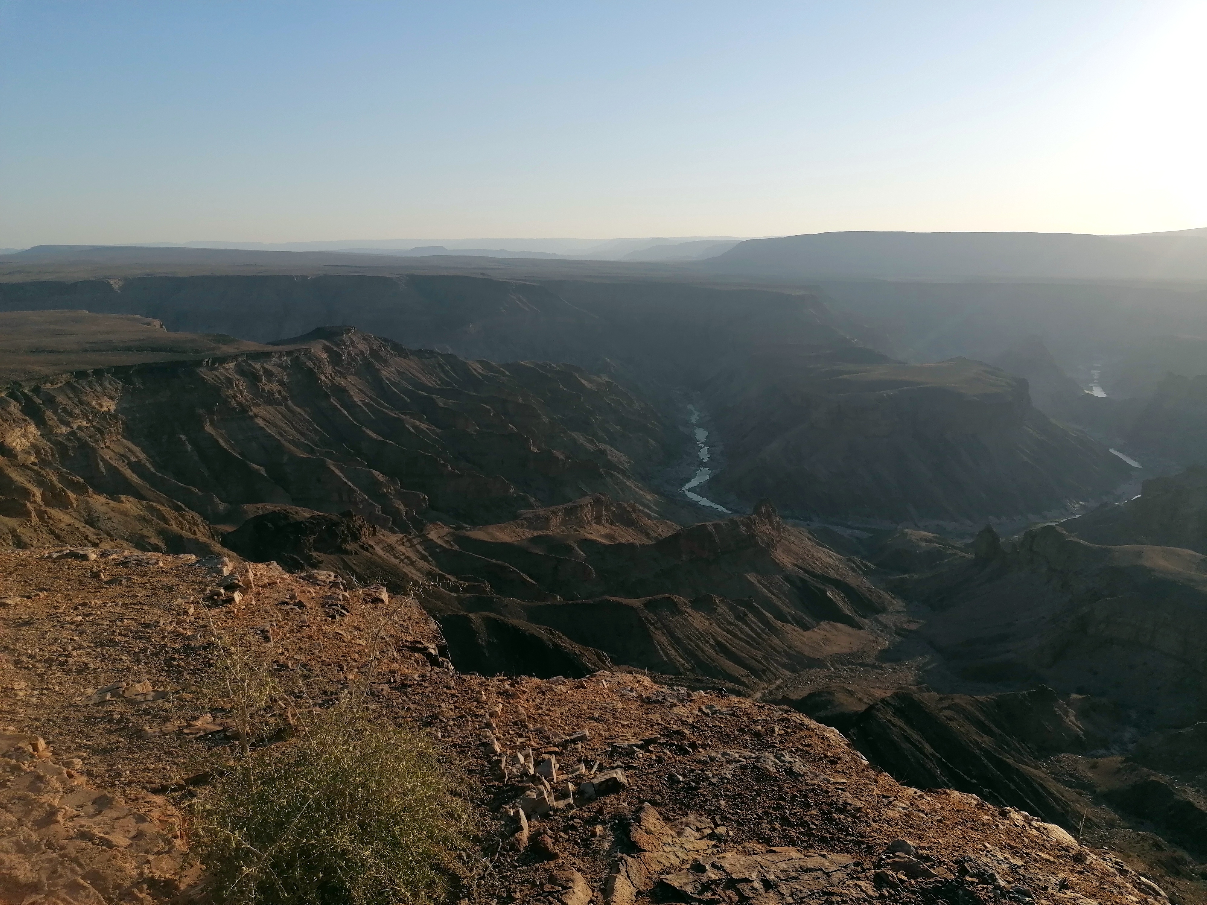 Pero nosotros carecemos del tiempo suficiente como para embarcarnos en cualquiera de estas aventuras, así que nos limitamos a contemplar esta maravilla de la naturaleza desde las alturas. Así pues, tras nuestro largo viaje llegamos a Hobas a eso de las 17:30 y nos fuimos directos al mirador más famoso del cañón, ese meandro que ha sido tan fotografiado. Allí hay unos paneles informativos que te cuentan muchas cosas interesantes sobre el cañón, su formación, su flora (puedes ver muchos Quiver Tree, tan característicos de Namibia), su fauna y su historia. Y, viendo el atardecer, disfrutamos de las vistas.
