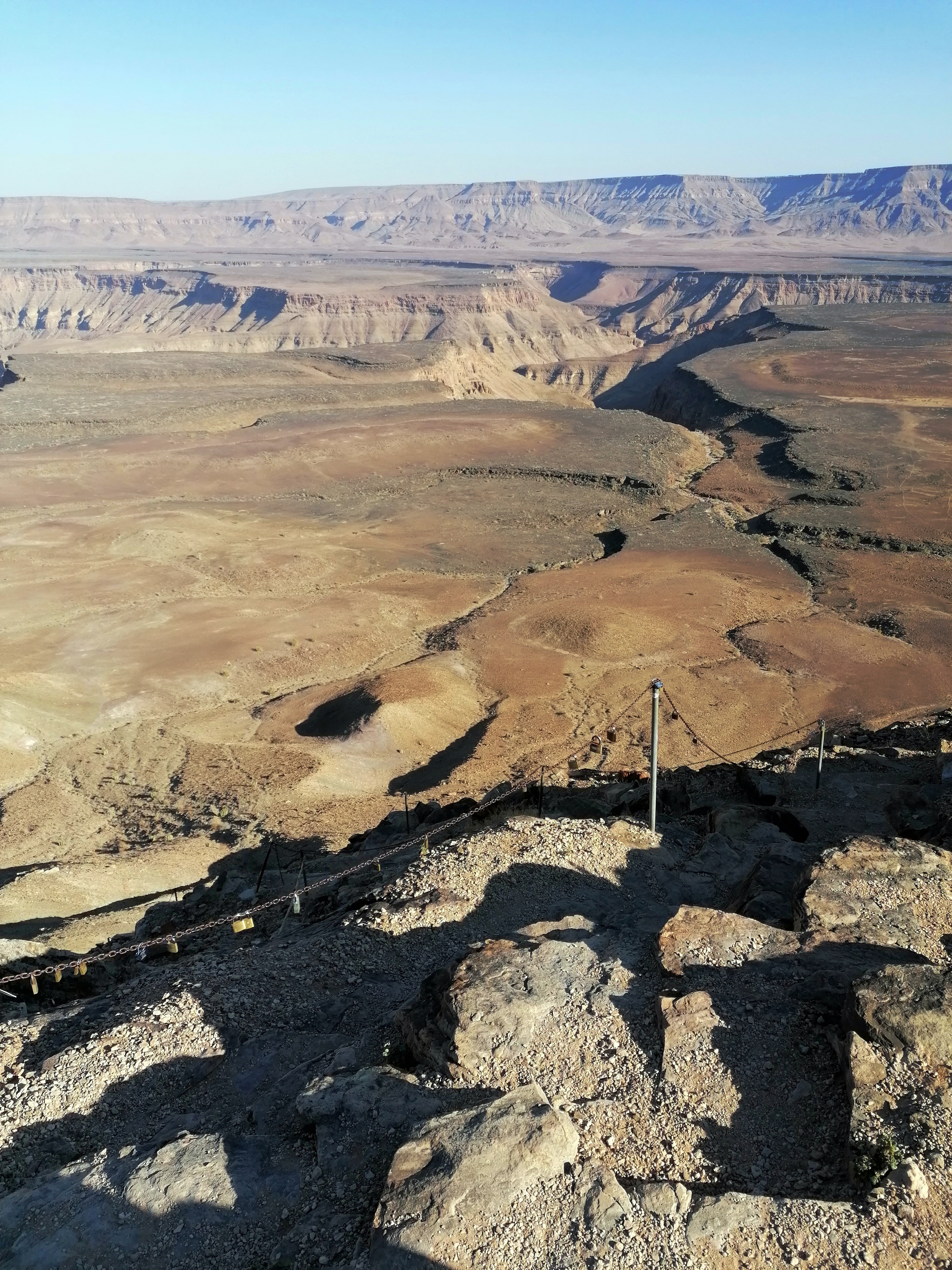 A 10 kilómetros de Hobas encontrarás las vistas más famosas del cañón y el inicio de la ruta senderista que durante 5 días de marcha junto al Fish River (abajo, por la garganta del cañón) te permite ir de Hobas a Ai-Ais. Además, hay un tramo de camino que recorre algunos kilómetros por arriba del cañón que puedes hacer en coche o andando para llegar a otros miradores. Debes tener en cuenta que si no contratas la excursión de 5 días por el cañón, sólo puedes contemplarlo y pasear desde arriba, ya que está prohibido bajar. Por otro lado, si deseas hacer la ruta de senderismo, debes saber que es muy exigente y hasta te piden un certificado médico que indique que estás en buenas condiciones para hacerla. Debió de morir algún turista hace tiempo y decidieron cubrirse las espaldas. La ruta son 80 kilómetros y las temperaturas ahí abajo pueden llegar a alcanzar los 50 grados en el verano namibio.