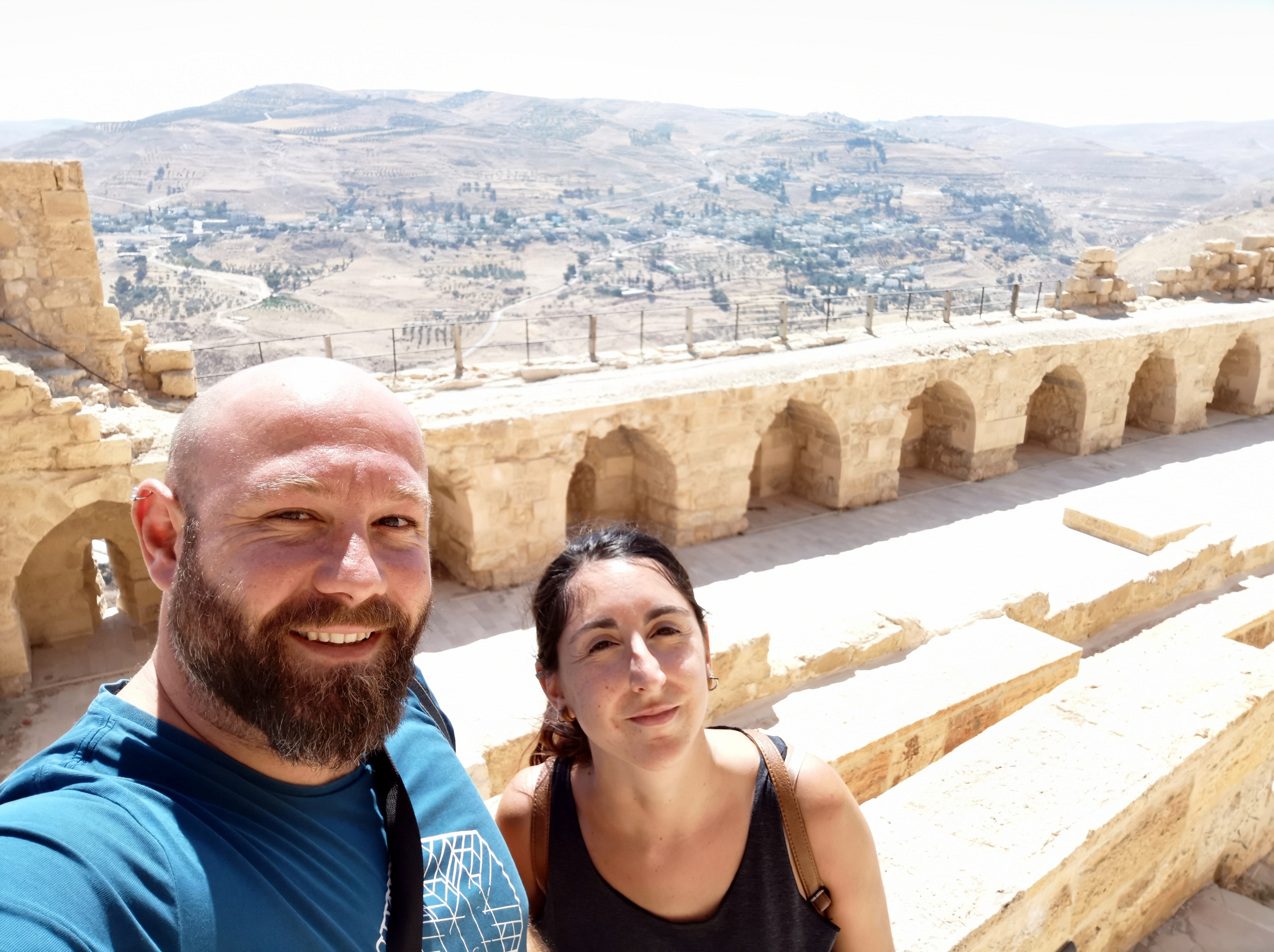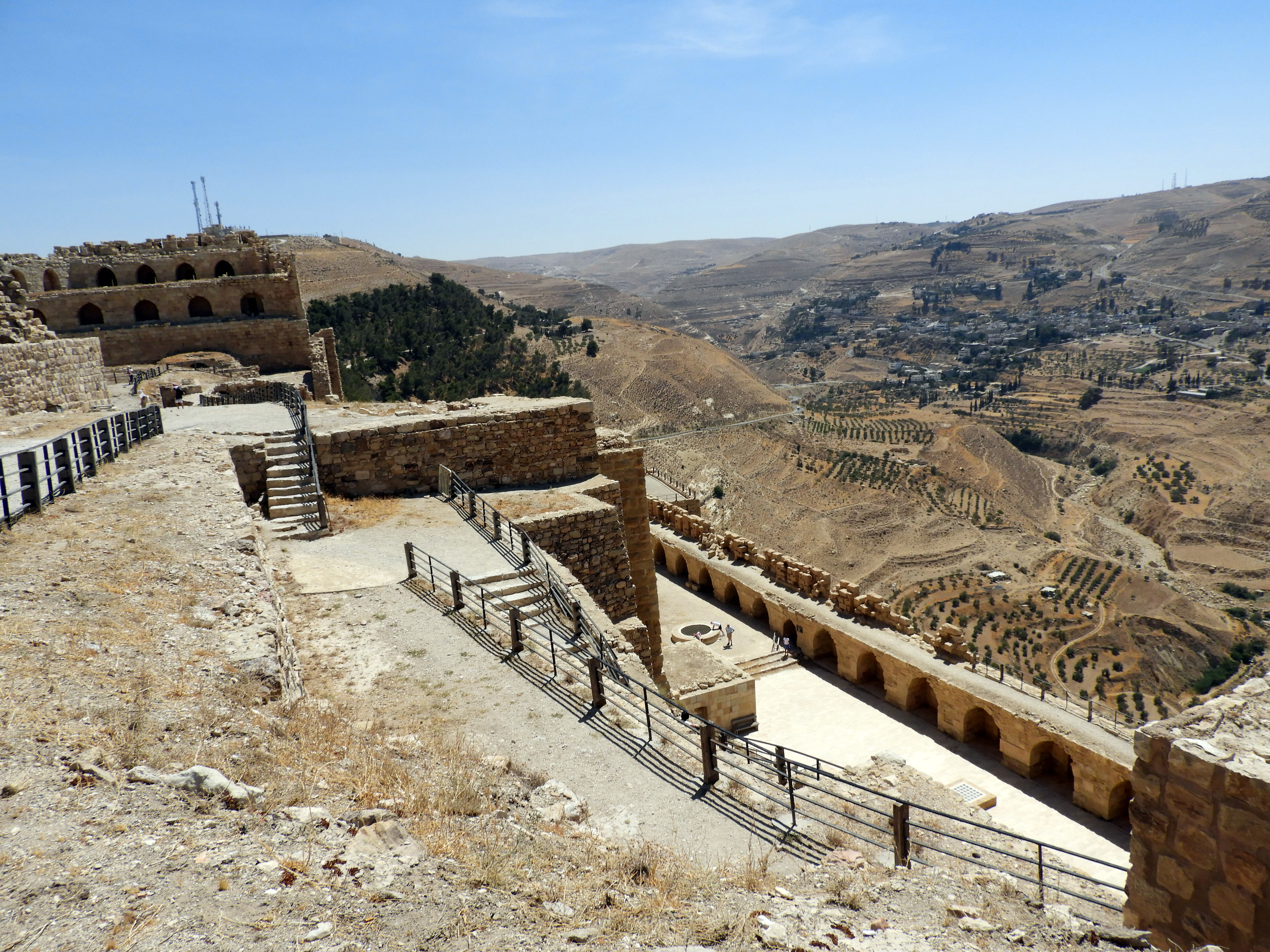 Más adelante en nuestra ruta Madaba-Petra llegamos al impresionante castillo de Al-Karak. Este castillo fue construido por los cruzados hacia el año 1140, aunque más adelante lo tomaron otros como Saladino y los mamelucos. Así que el castillo mezcla el estilo cristiano con el árabe y el bizantino. La entrada también está incluida en el Jordan Pass y de nuevo se echan en falta algunos paneles informativos que te cuenten la historia del castillo. Este se alza en lo alto de una colina de la ciudad en la que se encuentra y su vista desde abajo es imponente. Una vez dentro, puedes perderte un buen rato entre sus recovecos, pues está muy bien conservado y es grande.