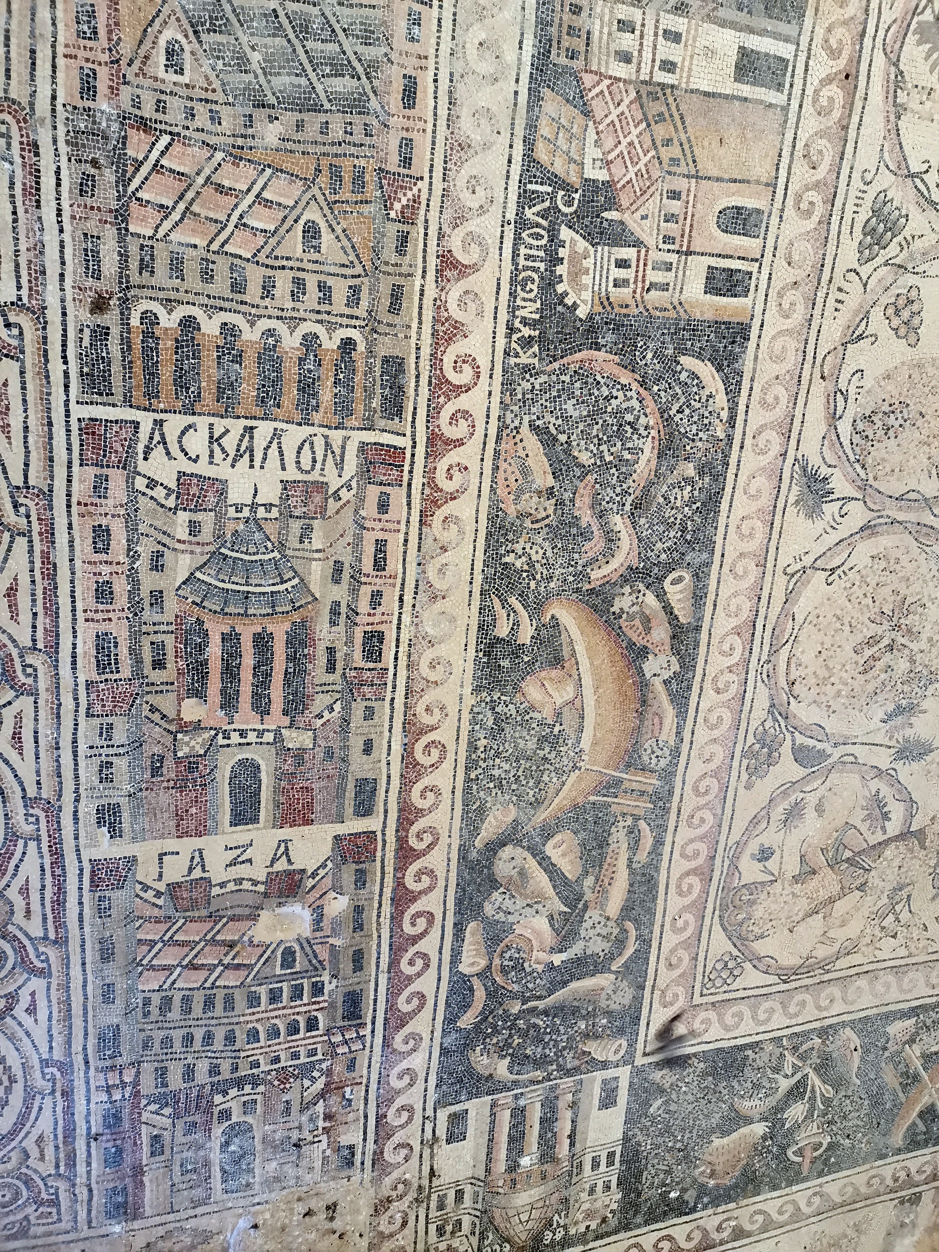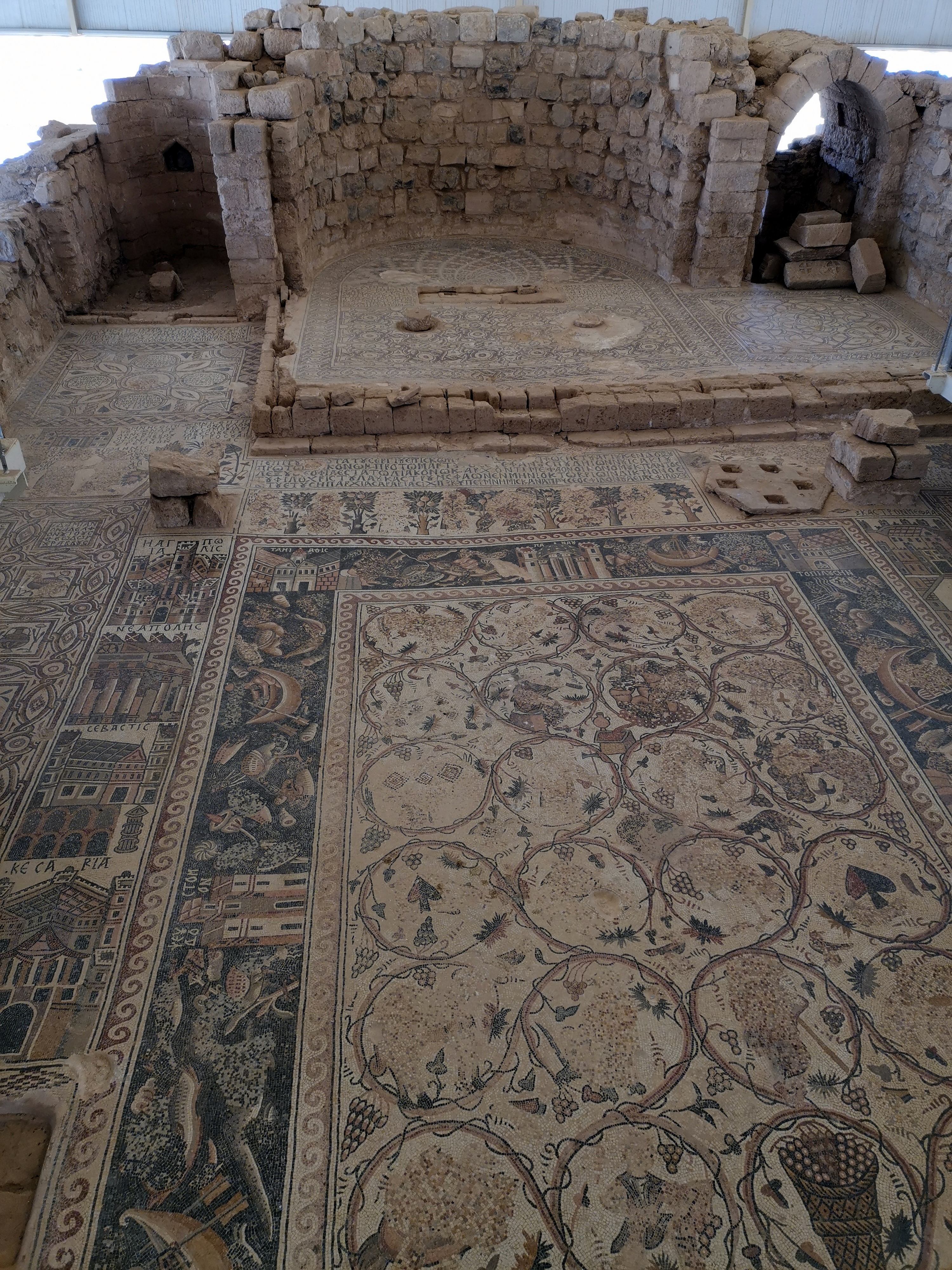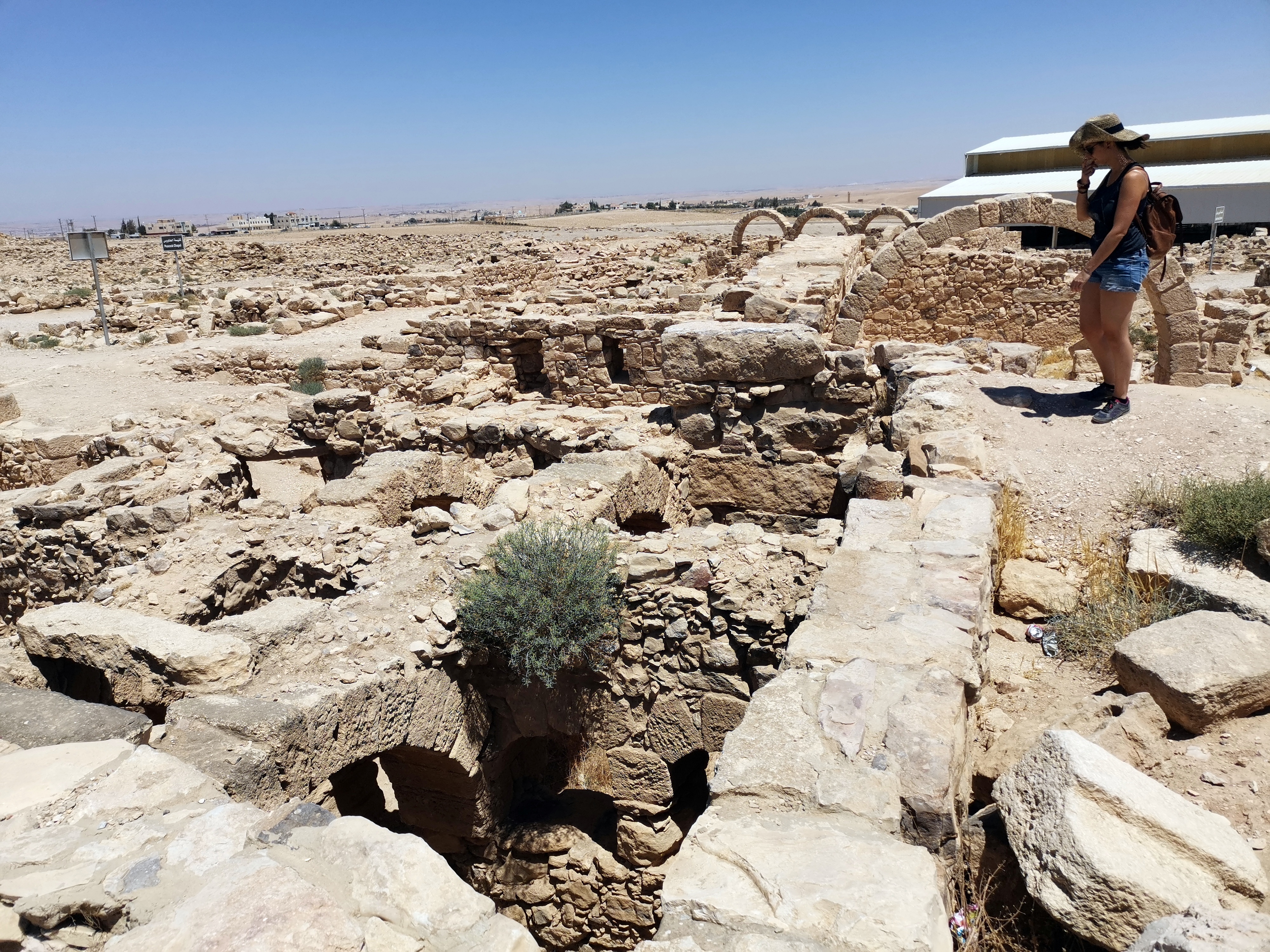 Nuestro primer alto en el camino fue Um er-Rasas. Las ruinas que podemos contemplar allí pertenecen a tres pueblos: el romano, el bizantino y el proto-musulmán. Es un asentamiento bíblico también (Mefat). Aunque todavía no se ha excavado todo el asentamiento, es Patrimonio de la Humanidad. La entrada es gratuita si tienes el Jordan Pass. Nosotros estábamos prácticamente solos cuando lo visitamos. Ni siquiera hay nadie vigilando que no te salgas del camino y te metas por entre las ruinas (no están valladas) y, lo que es una pena, no hay paneles informativos que te cuenten lo que tienes delante o algo de su historia. Lo más bonito de este enclave son sus mosaicos de la Iglesia de San Esteban, que datan del año 785 y se conservan en unas condiciones sorprendentes. En ellos podemos ver plasmadas las ciudades más importantes de la región, así como escenas de caza y pesca.
