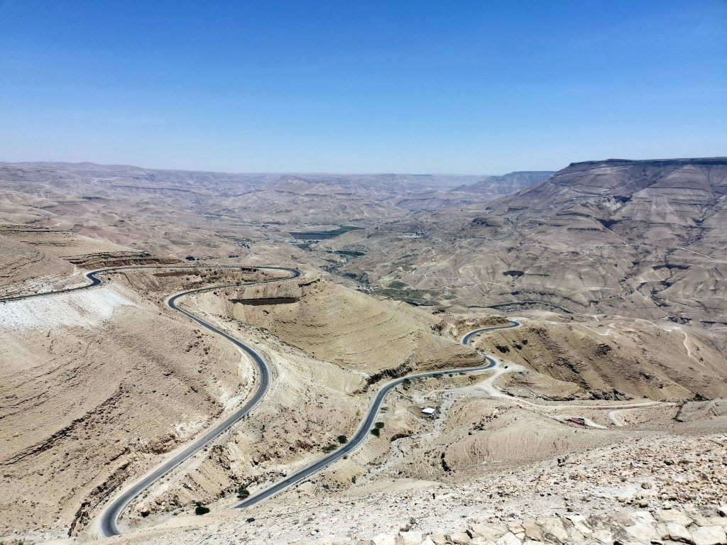 El día que viajamos desde Madaba hasta Petra, como el camino era largo, hicimos un par de paradas. Además, elegimos el camino largo, que es la Carretera del Rey, pues es más bonita y encierra mucha historia. Esta carretera es una ruta de 5000 años de antigüedad que ya los nabateos empleaban como ruta comercial. Unía el comercio de Asia con el de África y fueron muchos los pueblos que transitaron por ella hasta el día de hoy. La carretera serpentea subiendo y bajando cañones desérticos y ofrece bonitas panorámicas. Los romanos, los bizantinos y los cruzados fueron algunos de los que construyeron a su paso, por eso dejaron vestigios como las ruinas y mosaicos de Um er -Rasas y los castillos de Al-Karak y Shobak.
