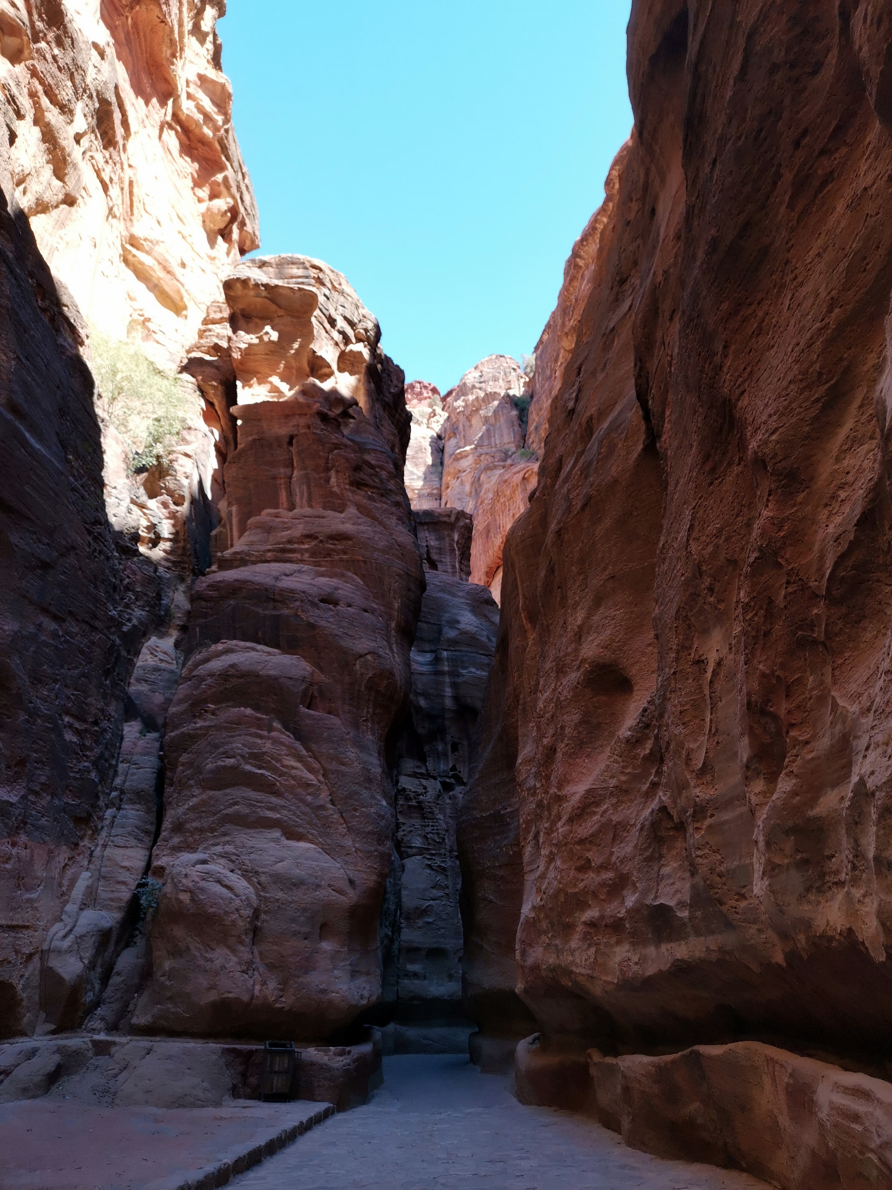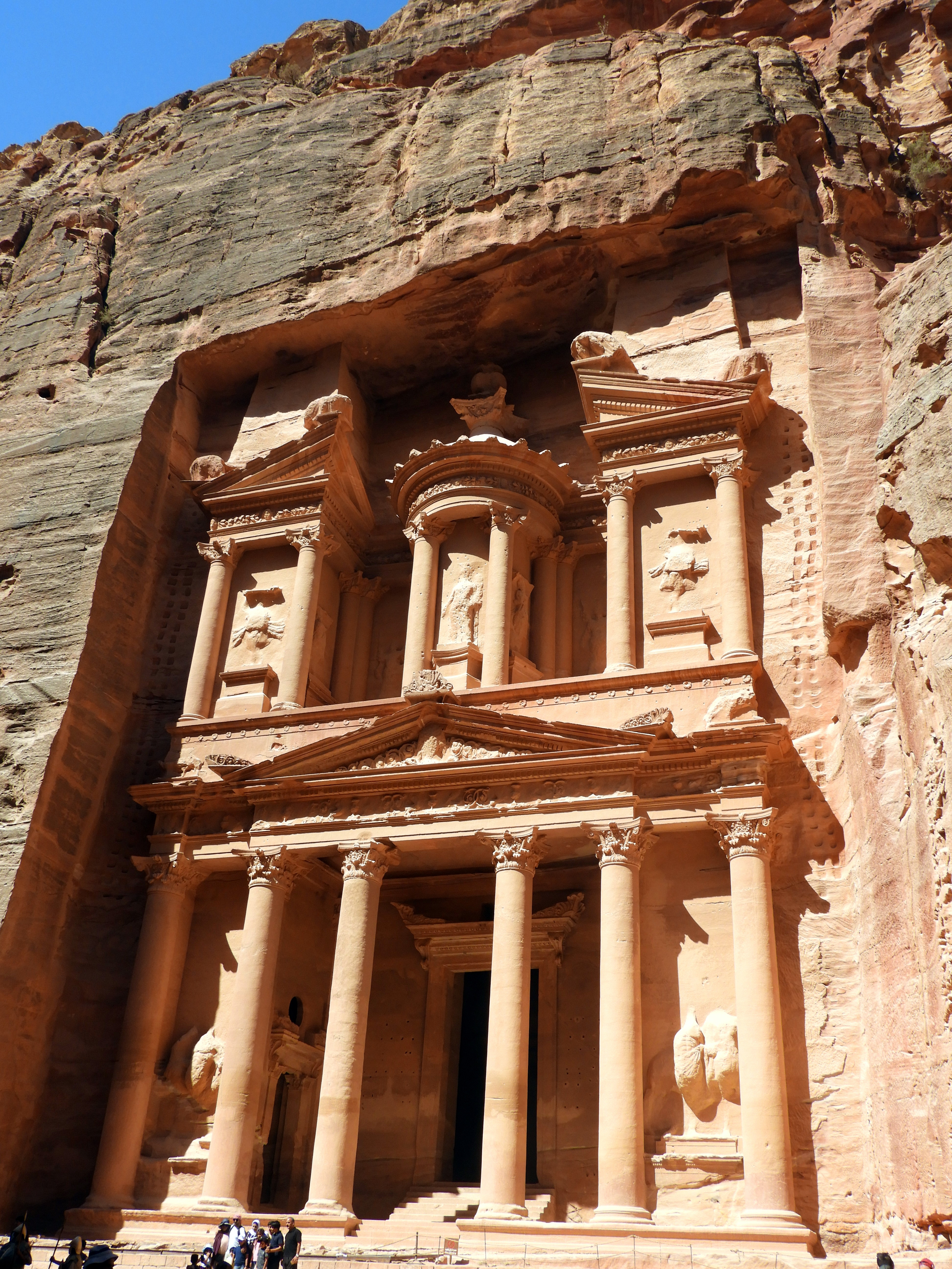 Petra te abre sus puertas a través del Siq, que es un largo e impresionante cañón con rocas de hasta 70 metros de altura. El Siq acaba abriéndose con unas vistas espectaculares, pues te muestra de repente el Tesoro de Petra. La fachada del Tesoro está esculpida en una roca que conforma un patio natural, hoy en día lleno de camellos, jordanos y turistas. Los ecos del ruido de la gente y de los animales suben hacia arriba y se oyen como salidos de una cueva desde lo alto de los precipicios de roca del final del Siq.