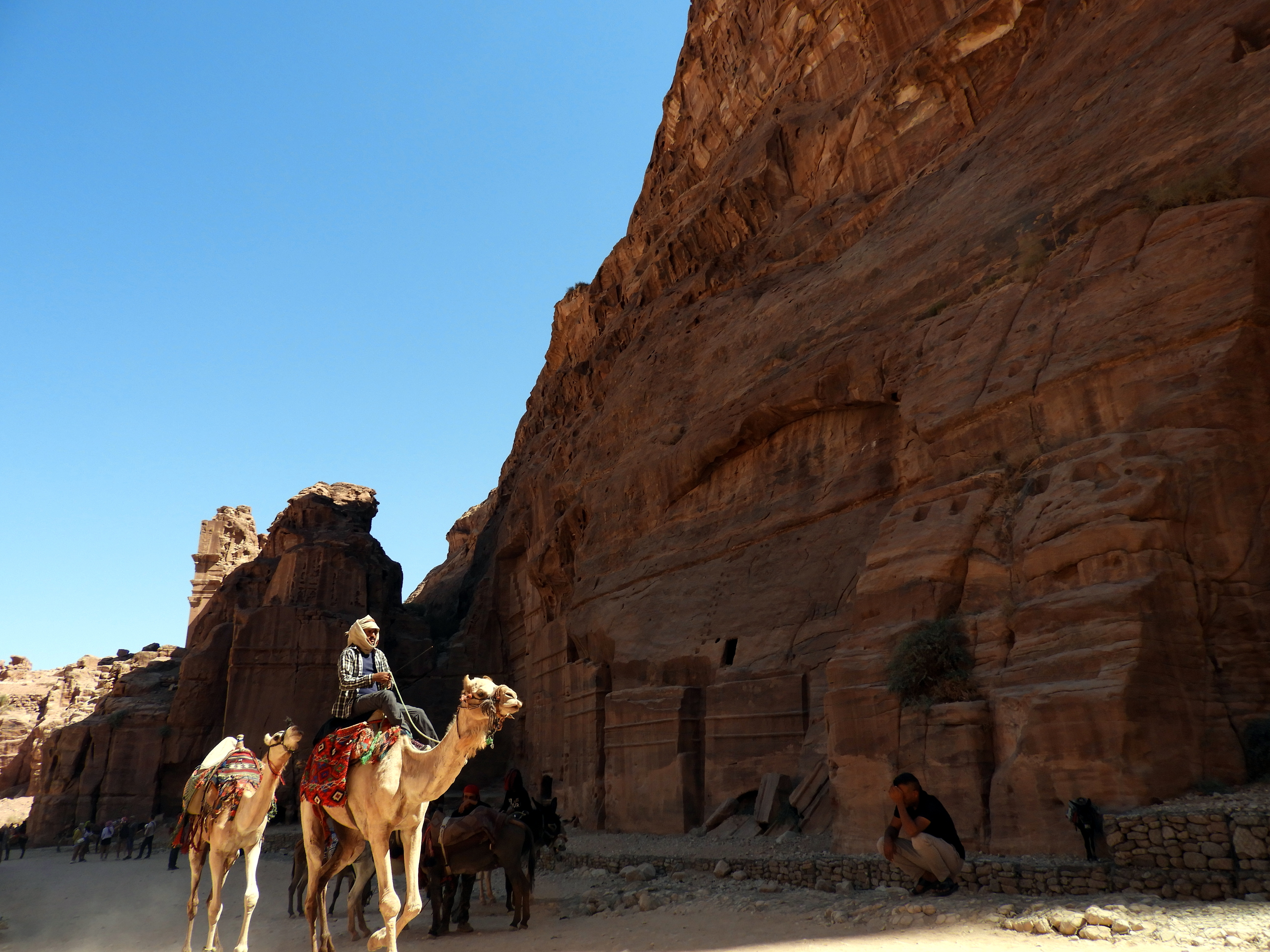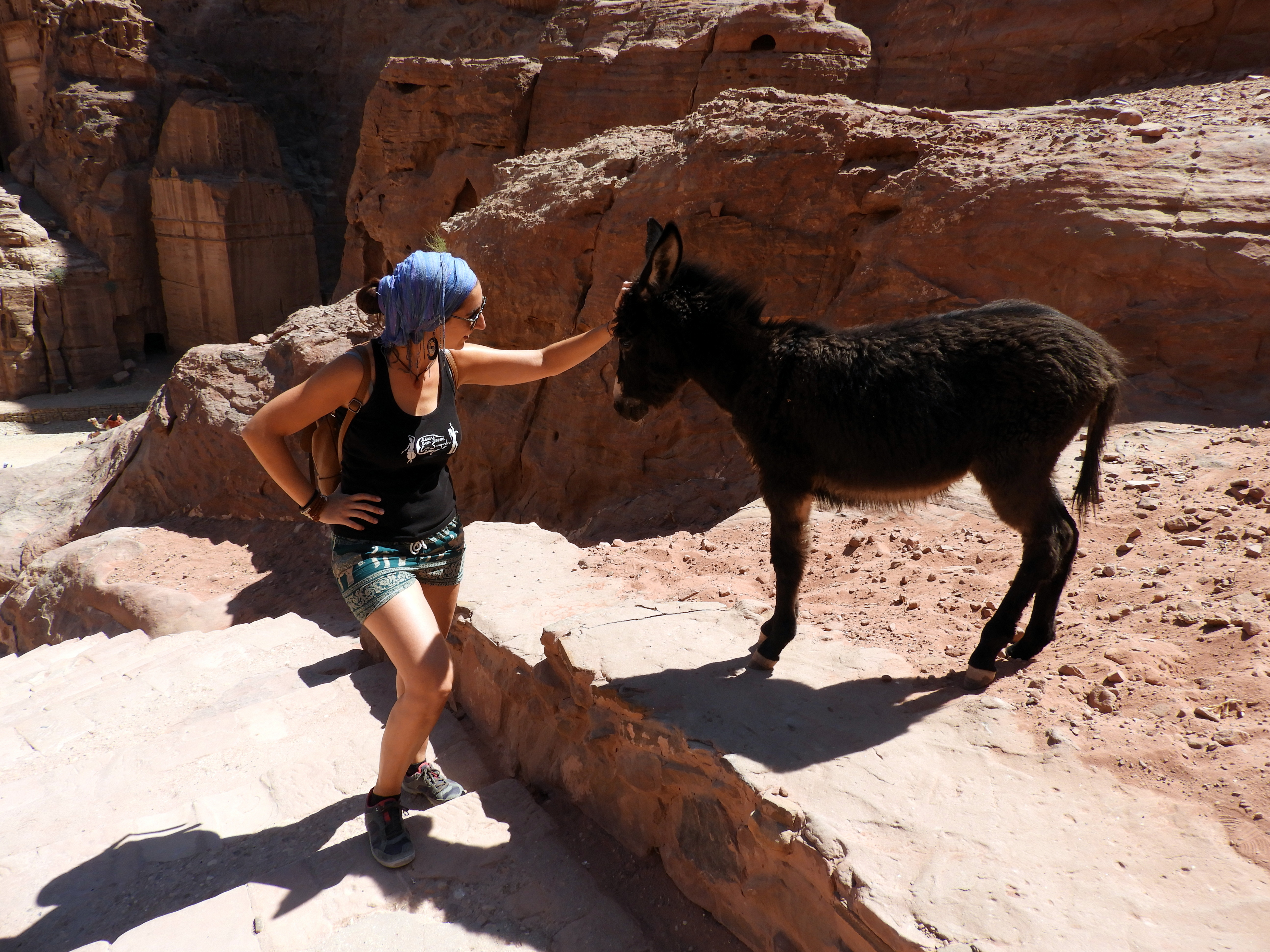 En definitiva, Petra es subir y bajar y subir y bajar… Y, por supuesto, bajo el sol. Hay gente que hace tramos montados en burro, en camello o a caballo, pues hay jordanos que te lo ofrecen por todas partes. Petra está llena de niños montados en burro que te ofrecen su «taxi». Aunque la verdad es que los burritos dan un poco de pena, pues no se les ve muy animados que se diga… Si quieres pasear por Petra a caballo, te lo ofrecen nada más entrar y te dicen que está incluido en el precio de tu entrada. Eso es cierto, pero hemos oído que luego te piden en una propinita… Petra es duro si te lo recorres andando, pero, además de lo mencionado, hay también coches de caballos, pequeños coches eléctricos… En fin, que hoy en día todo el mundo puede acceder al menos a la calle principal de Petra.