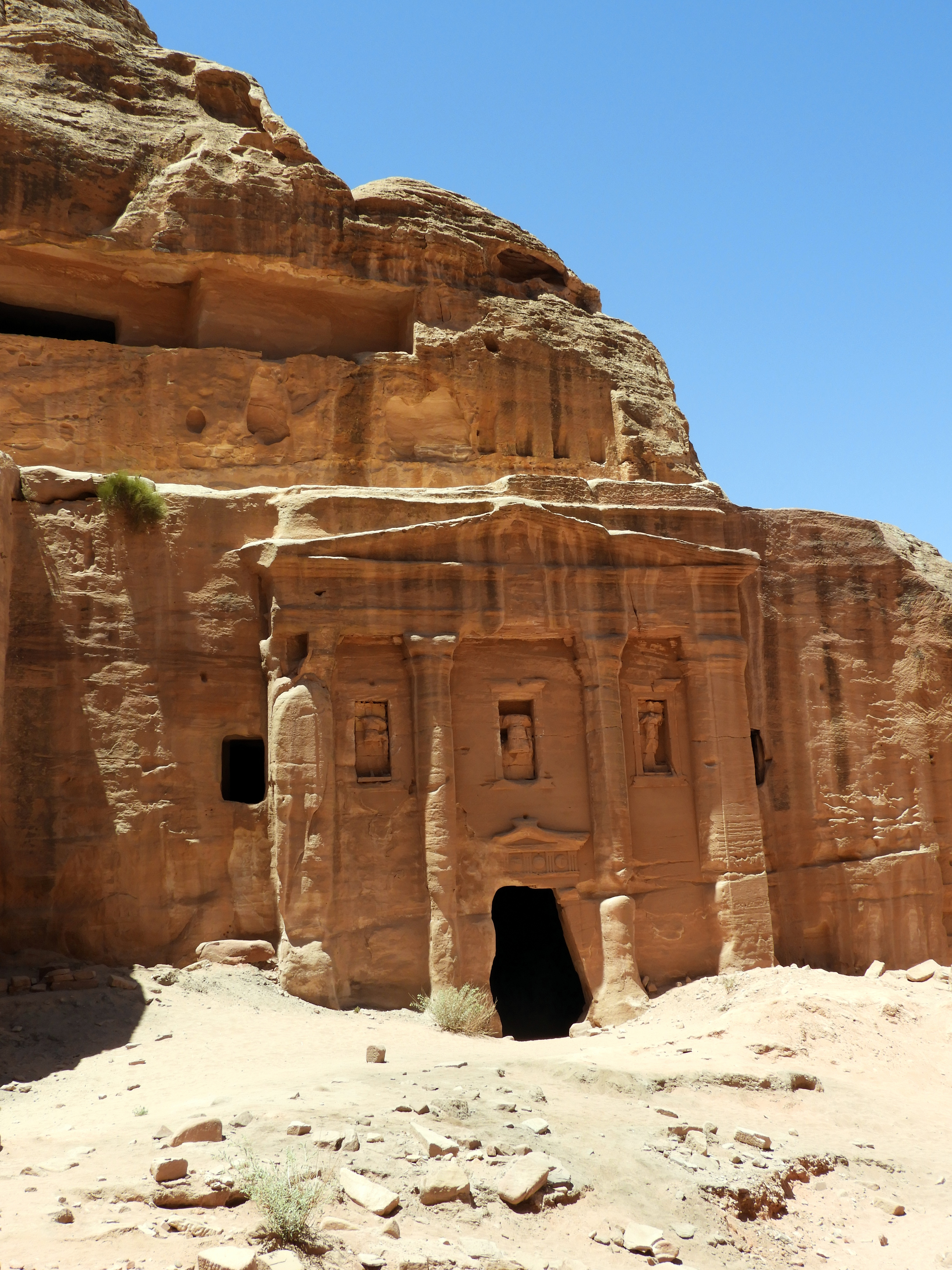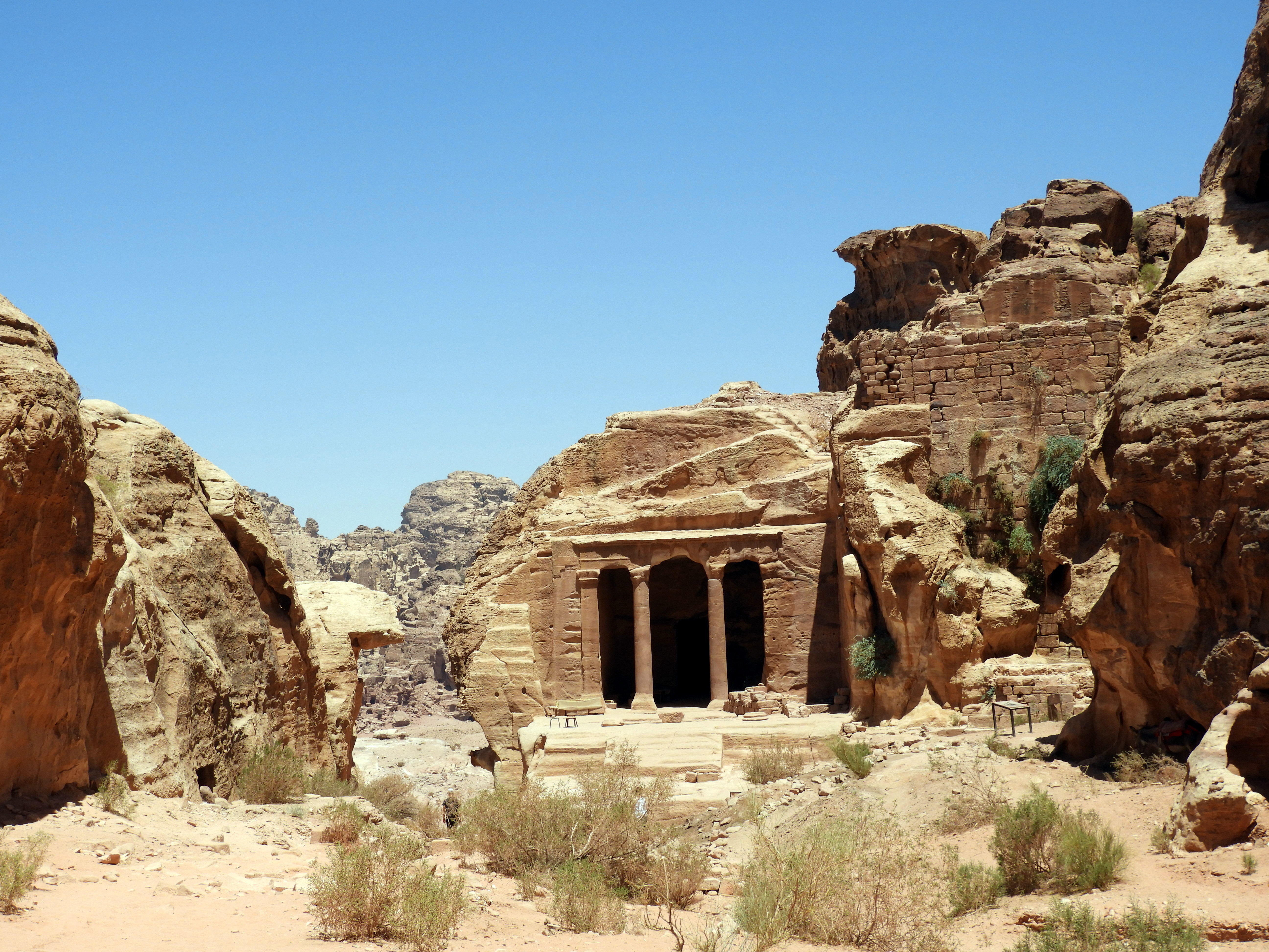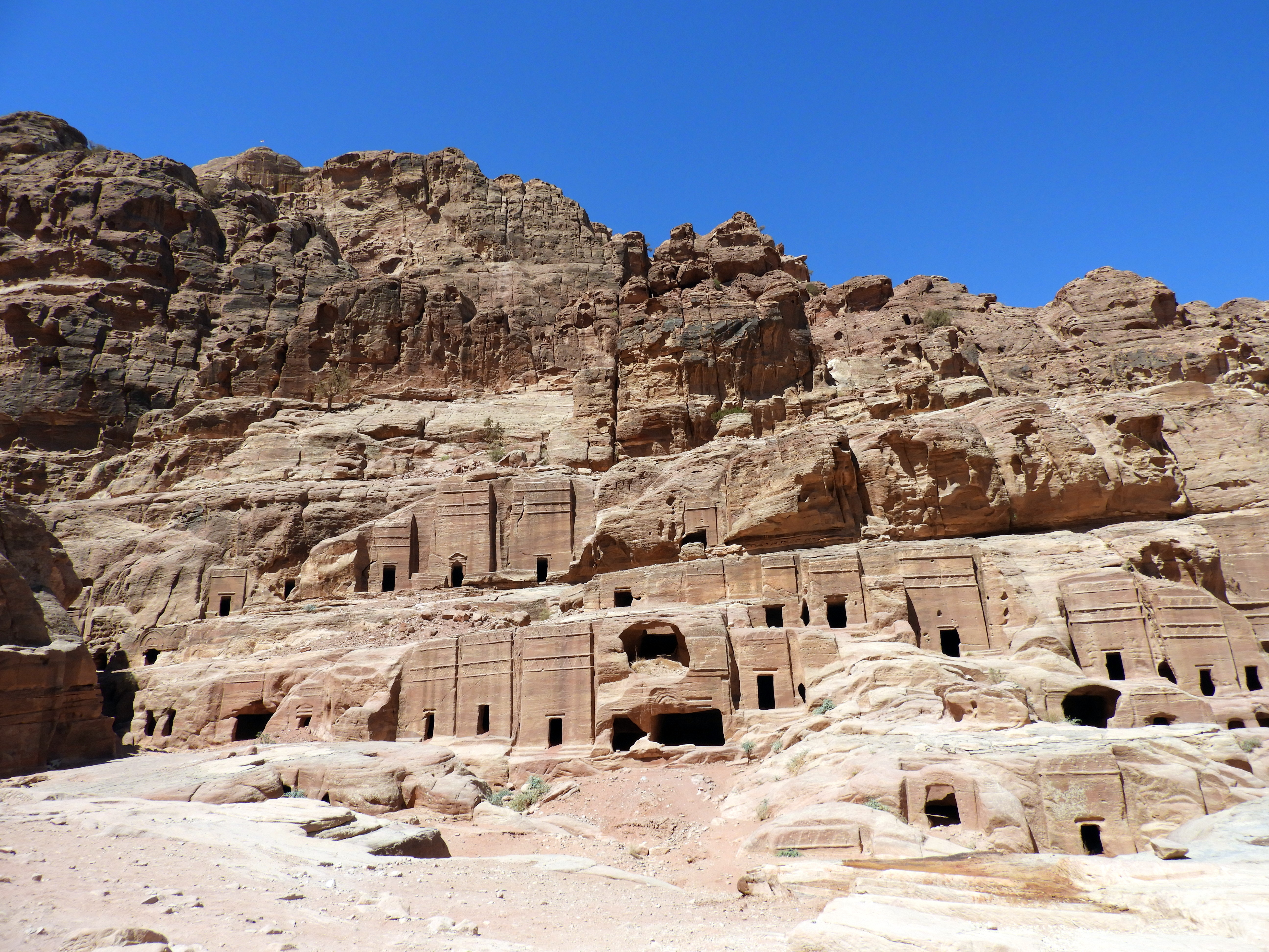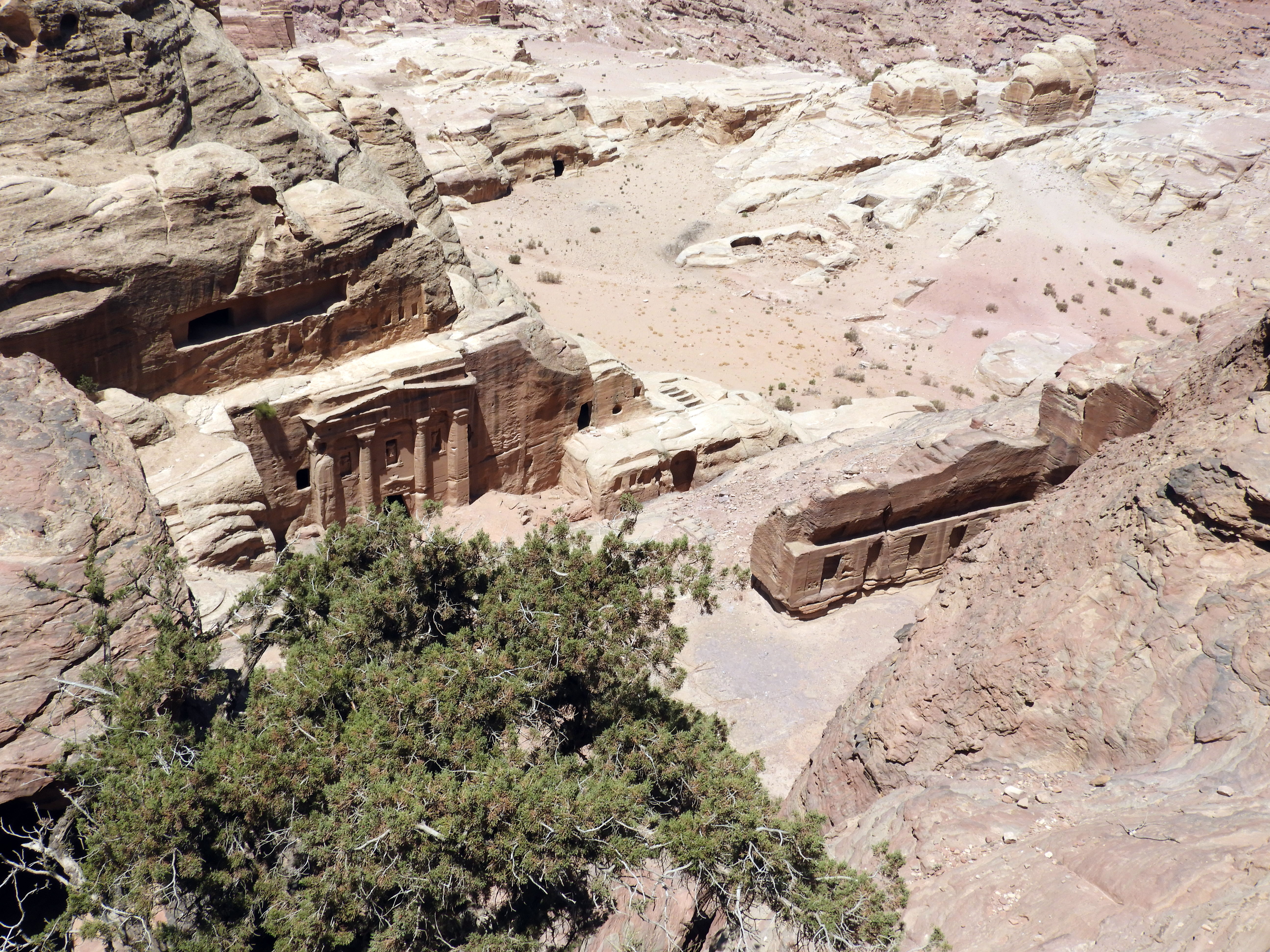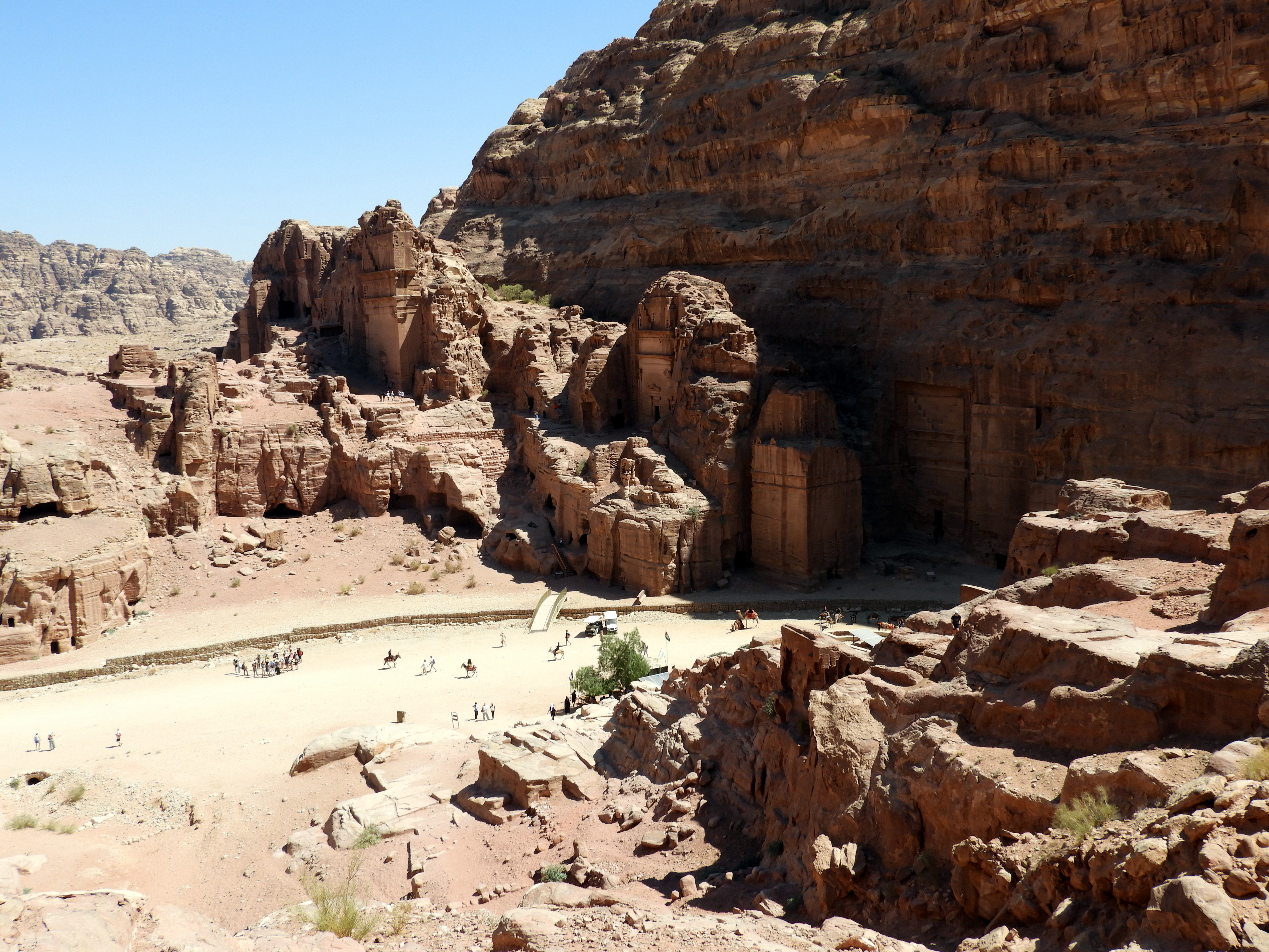 Visto el Tesoro desde abajo, el camino principal sigue y te lleva por la calle de las fachadas. Antes de llegar al teatro, a mano izquierda hay unas escaleras que te suben al altar de los sacrificios. Nosotros tomamos ese desvío y la subida fueron unos 40 minutos. No se ve ningún altar, pero tiene unas vistas panorámicas de Petra muy bonitas y desde allí se puede coger otra senda que recomendamos: Wadi al Farasa Trail. Este camino, muy poco transitado, te pasea por la fuente del león, el triclinium, el Templo Jardín y algunas tumbas más. En total, incluyendo la subida al altar, puede que nos costase unas 3 horas hacerlo. Por supuesto, parando a contemplar las joyas que te ofrece Petra y almorzando a la sombra de algún templo para sobrevivir a la chicharra… Esta senda desemboca en el final del camino principal de Petra. Es decir, donde están los dos restaurantes.