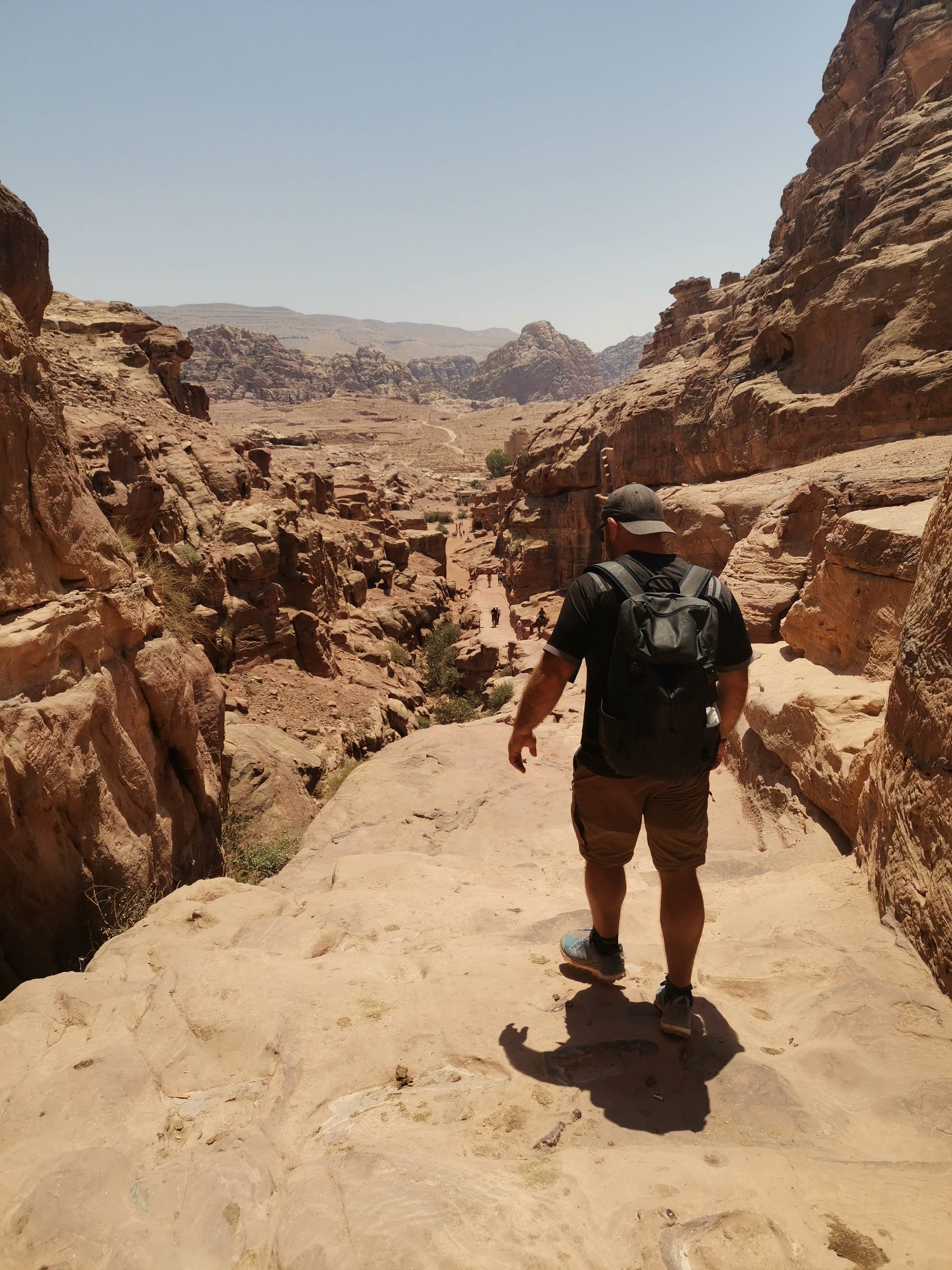 Llegados aquí podría parecer que has acabado con Petra… pero no es así. Si te quedan tiempo y energías no debes dejar de ir al Monasterio (el llamado Deir). Está a las afueras de la ciudad, así que desde los restaurantes, debes coger una senda a la derecha que te llevará escalones arriba hasta él, subiendo la montaña por un pequeño cañón. Merece mucho la pena ir hasta ahí, aunque la subida sea larga. No recordamos con exactitud, pero es posible que nos costase más o menos una hora llegar desde los restaurantes. El Monasterio es una fachada esculpida en la roca que se parece mucho a la del Tesoro. En este caso, la puedes disfrutar sin mucha gente alrededor ni personas ofreciéndote constantemente el subir a ver ningunas vistas. Por otro lado, también hay varios miradores allí a los que merece la pena subir, incluso aunque creas que ya no te queda aliento (puedes reponer fuerzas y líquidos en otro bar que hay aquí). Pues desde ellos, además de disfrutar de la fachada del Monasterio desde las alturas, si te das la vuelta podrás ver lo impresionante de las montañas rocosas de Petra al llegar a su final y dejar paso de nuevo al desierto jordano.