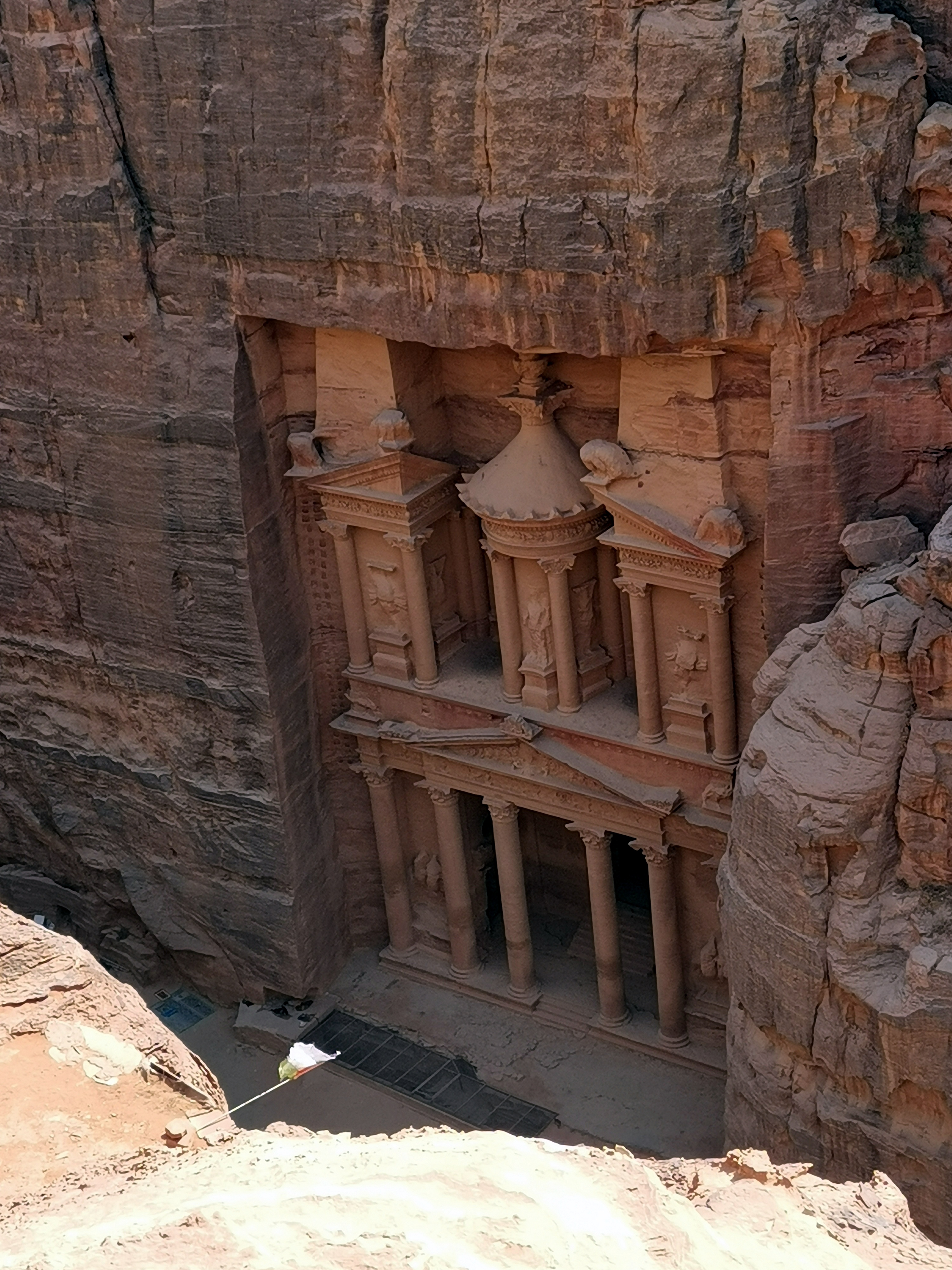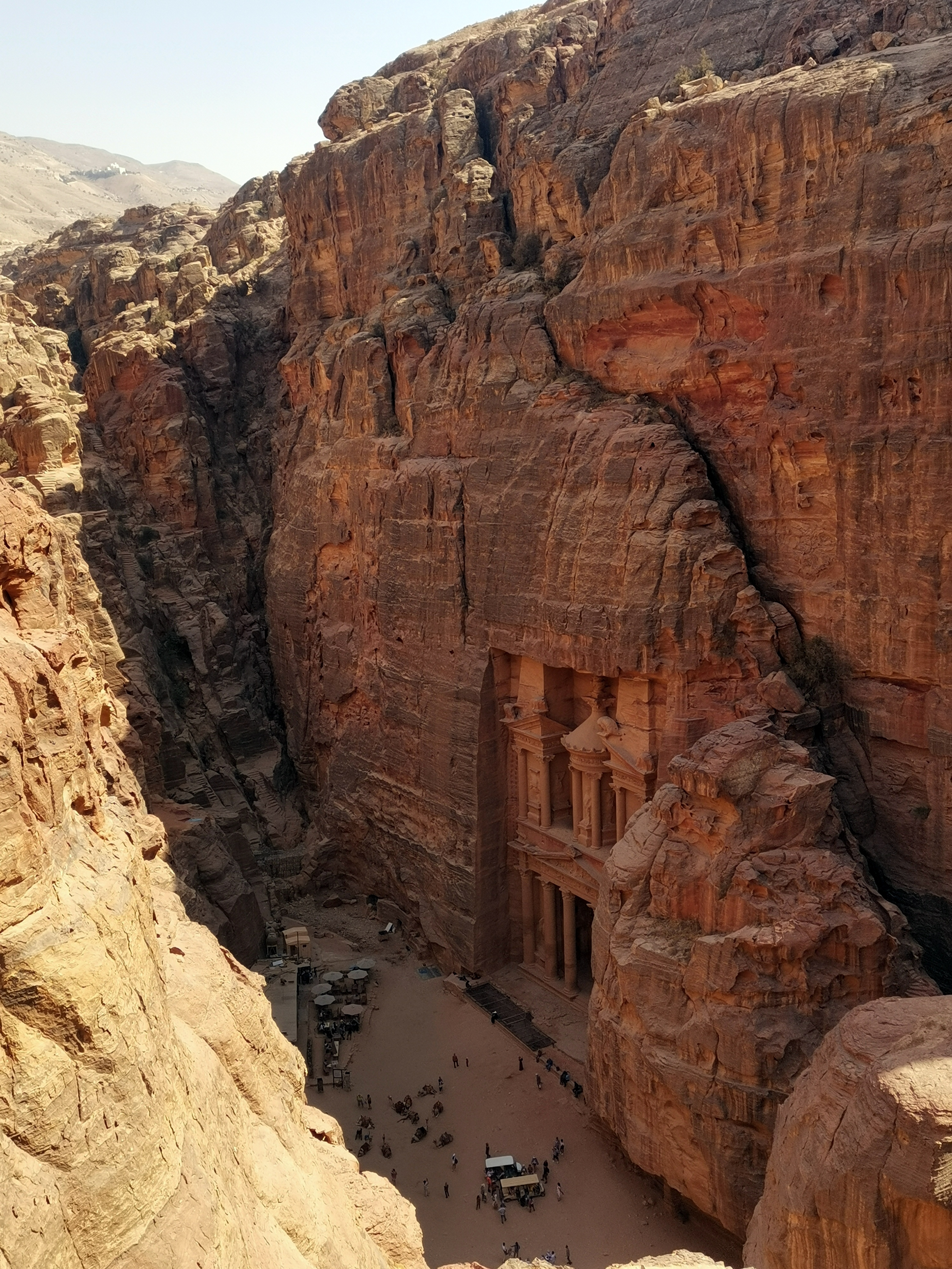 Es posible subir y ver el Tesoro desde arriba (esa típica foto que se hace todo el mundo…), sin embargo, todos los jordanos que están ahí a la caza del turista te dicen que no se puede subir sin un guía y claro, tienes que pagarles… Nosotros nos negamos, porque hay otro camino (mucho más largo, por supuesto) por el que puedes subir tranquilamente a tu aire. Es el camino que está marcado como Al-Khubtha Trail. Lo encontrarás después de pasar las Tumbas Reales, pero antes de llegar a la de Florentino VI, donde hay unas escaleras que suben la roca. Subir hasta llegar al mirador del Tesoro nos costó como una hora, aunque hicimos alguna parada para reponer hidratación y a medio camino hay un puesto con unas vistas preciosas del teatro y del camino principal en el que merece la pena pararse a tomar algo y disfrutar del paisaje. Mejor hacer este camino por la tarde, pues así en algunos tramos la roca te da sombra. Al llegar al final hay también un pequeño puesto donde te puedes tomar algo, pero nosotros lo vimos lleno de gente y nos quedamos fuera. Petra está llena de puestos estratégicamente colocados en los precipicios. Las vistas son preciosas y ponen alfombras para que te sientes al borde de ellos. No obstante…. no hay ningún tipo de quitamiedos y a veces si hay más gente cerca da un poco de respeto ponerse tan al borde.