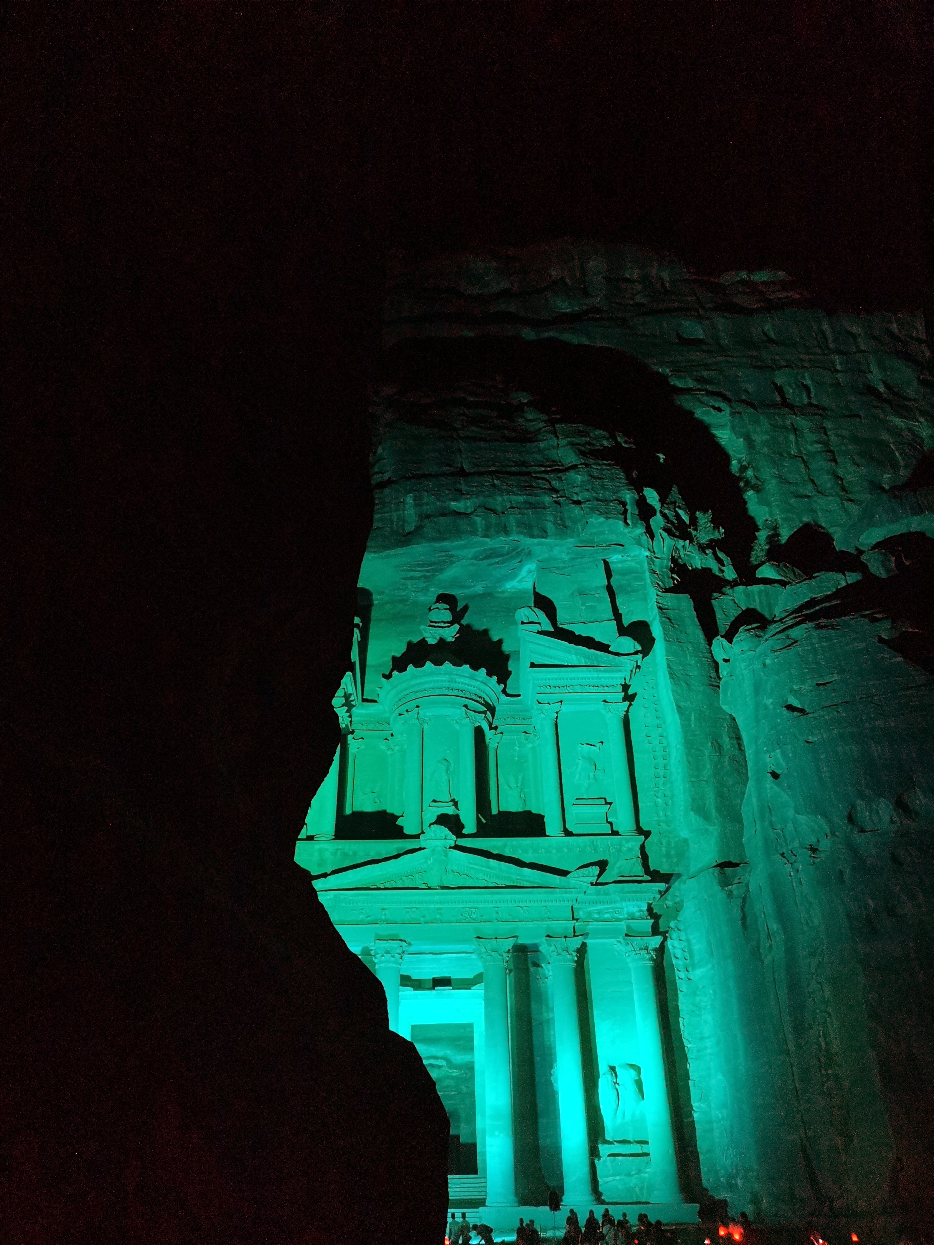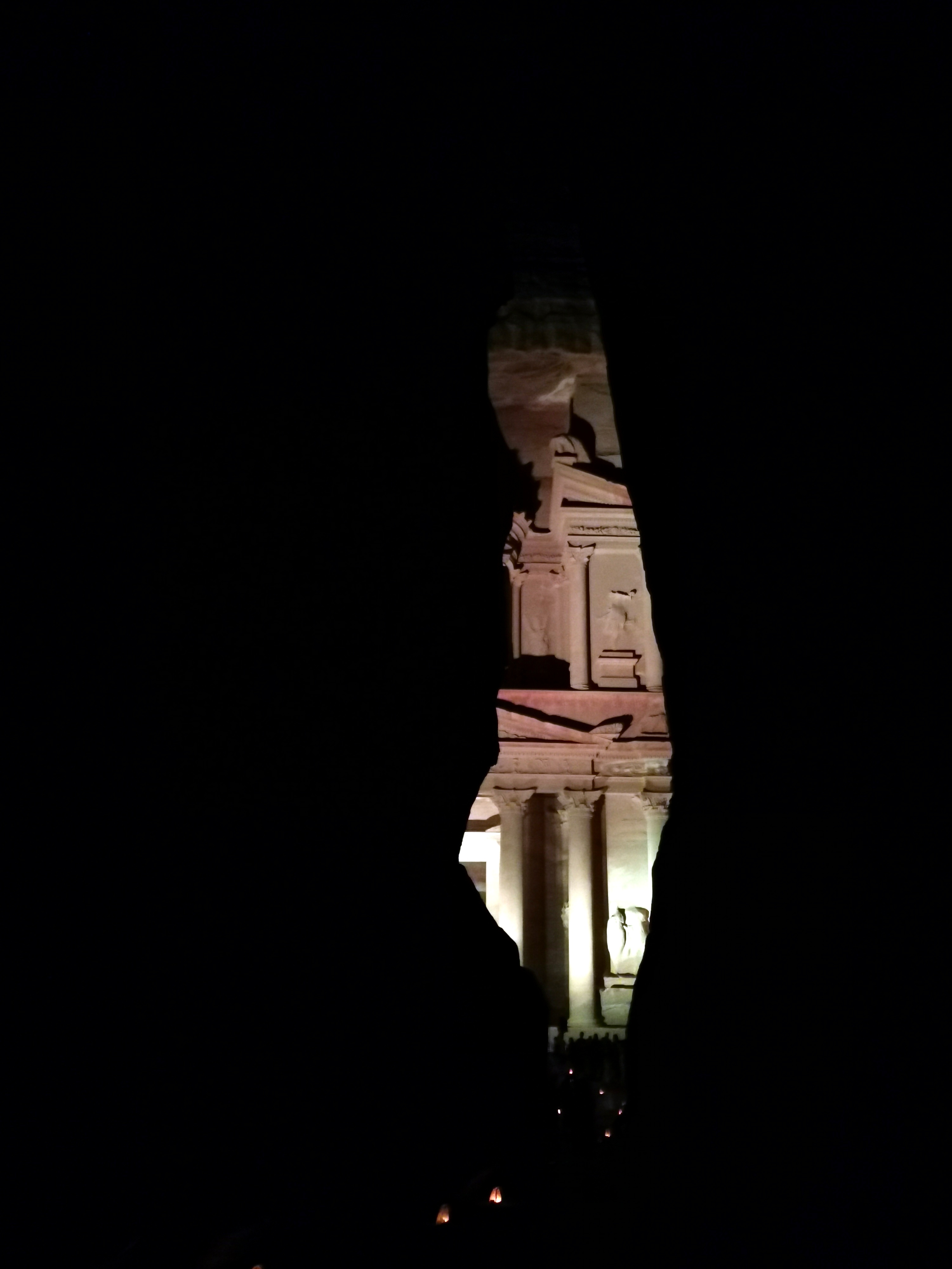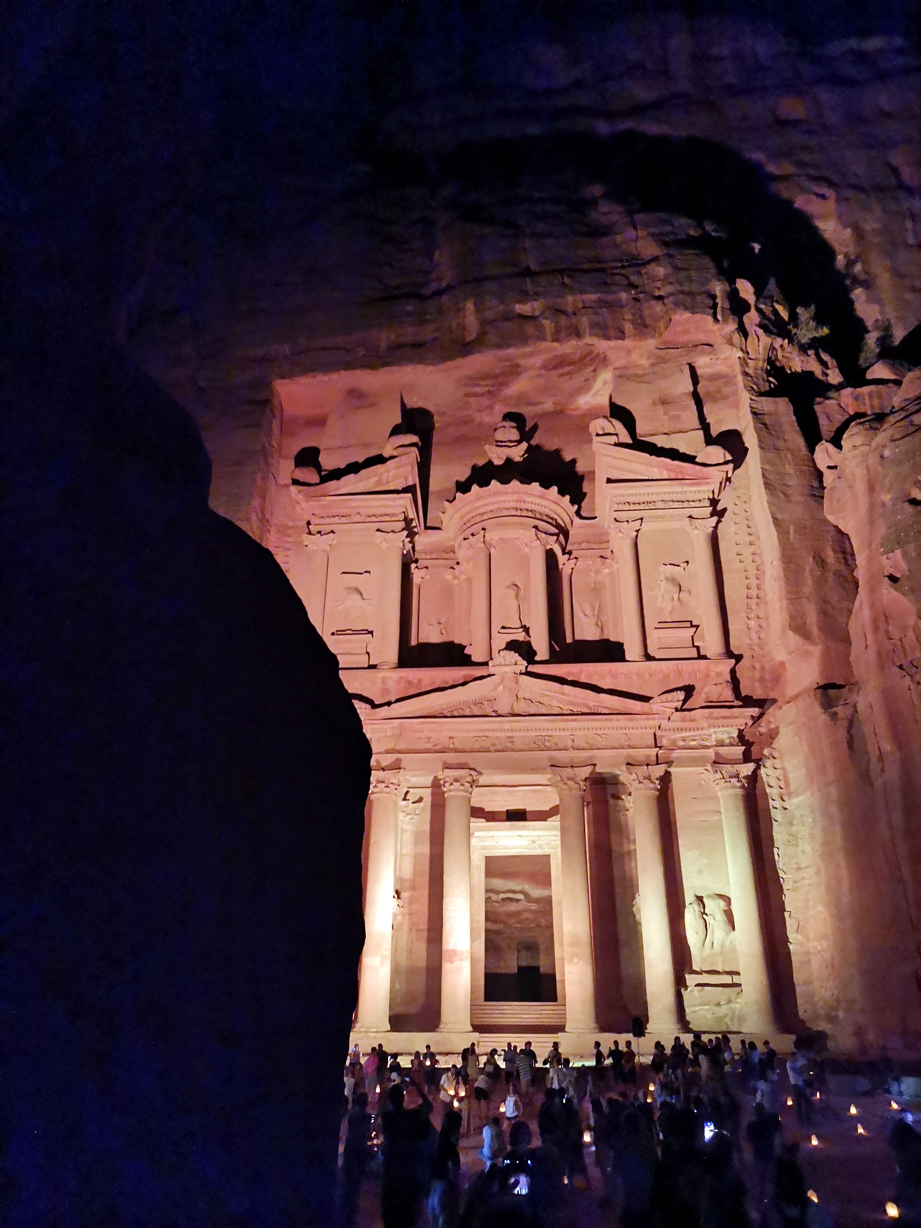 Además de visitar Petra de día, ahora también se puede visitar de noche si estás allí un lunes, un miércoles o un jueves. Esos días hacen el Petra by night. Puedes comprar la entrada allí mismo o seguramente en tu hotel y cuesta 17 JOD. ¿En qué consiste? Entras con todo el mundo de golpe a eso de las 20:30 (mejor ir un poco antes) y andando por un camino decorado con tenues luces de velas atraviesas el Siq y llegas hasta el Tesoro. A las 22:00 se empieza a salir ya. Sería mágico si no estuvieras rodeado de tanta gente. Cuando abren las puertas es muy incómodo porque andas a oscuras por un camino de piedras con tanta gente pegada. Conforme cada uno coge su marcha y se va dispersando es más cómodo. Al llegar al Tesoro hay dispuestos cientos de taburetes. Una vez todos están sentados, te ofrecen un par de espectáculos en los que tocan algunos de sus instrumentos tradicionales y luego iluminan la fachada del Tesoro de colores. Repito: podría ser mágico, con las estrellas, las velas, la belleza del enclave en general… si no fuera por la cantidad de gente que hay y el hecho de que siempre hay personas maleducadas alrededor. En nuestra opinión, si tienes curiosidad por ver este tramo de Petra de noche, hazlo. Pero si no tienes unas ganas especialmente grandes, no merece tanto la pena.