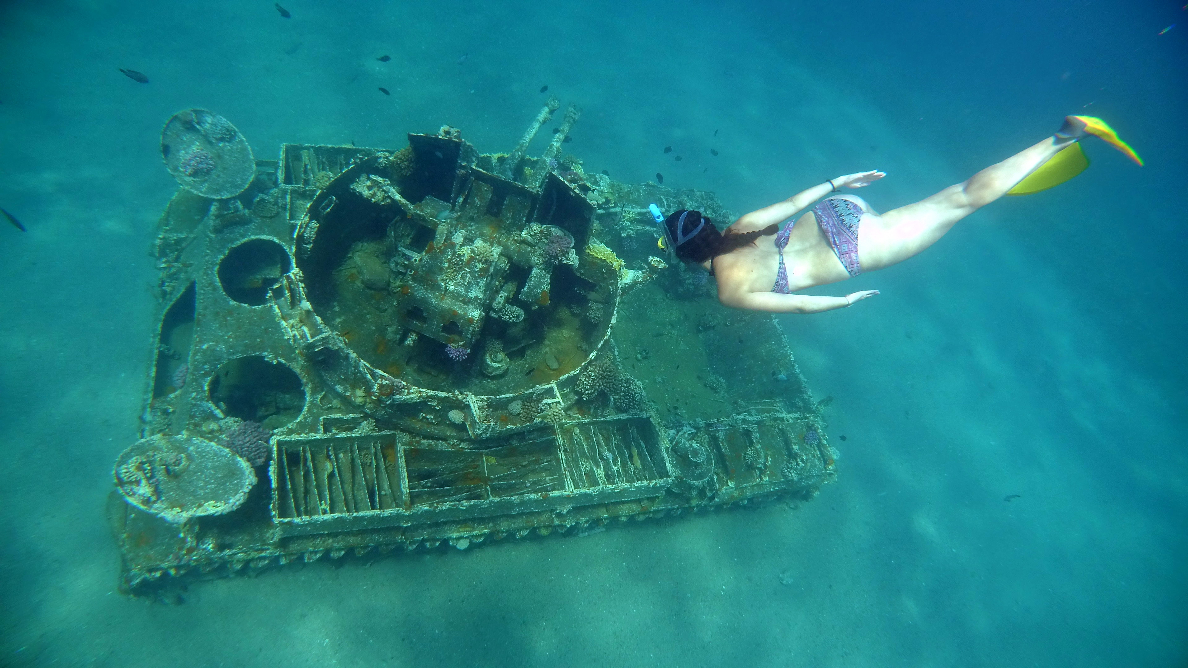En South Beach hay una zona de arrecife de coral a la que llaman los Japanese Gardens que es preciosa. Más abajo en la misma playa, si nadas adentrándote un poco más, puedes ver un tanque hundido y un avión que también sumergieron hace un par de décadas o tres, para que los bichillos submarinos fuesen creando arrecife de coral en ellos. Aunque los veas unos metros por debajo de ti, la experiencia de verlos allí sumergidos es impresionante. Especialmente el avión, que aparece de repente ante ti como una imagen fantasmagórica, tras buscarlo entre el azul interminable durante un rato. Los dueños de los hoteles o de los negocios de submarinismo te explican encantados cómo encontrarlos, así que siguiendo sus instrucciones y buscando un rato los puedes encontrar. Si no, sigue a los buzos que irán por debajo de ti soltando grandes burbujas y buscando lo mismo que tú, pero con guía…