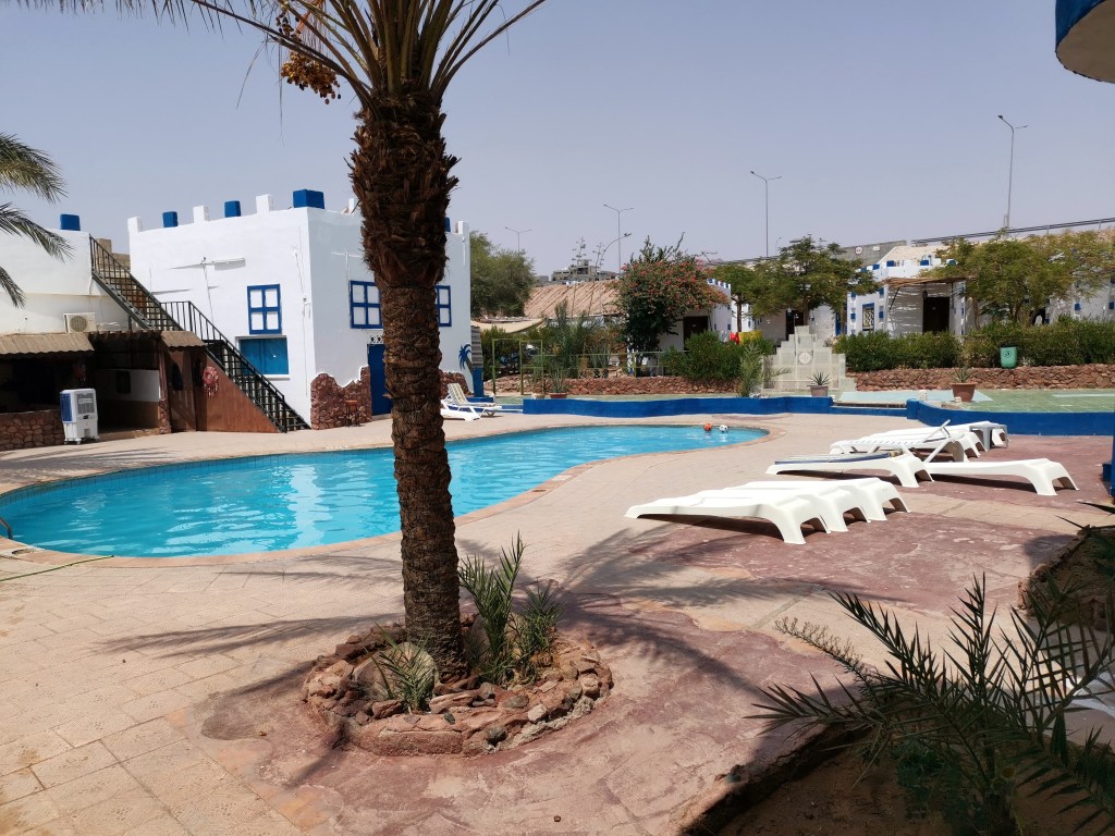 En un principio íbamos a alojarnos en la ciudad de Aqaba, pero luego pensamos que, puesto que lo que nos interesaba era hacer snorkel o buceo, lo mejor iba a ser alojarnos directamente en la playa más interesante para ello: South Beach. Así que cambiamos nuestra reserva de hotel y nos fuimos al Bedouin Moon Village, que era modesto pero estaba frente a la playa y tenía piscina. Y podemos decir que hacer este cambio fue una sabia elección, pues la ciudad tiene poco para ver y realmente pasamos todo el tiempo en el mar.