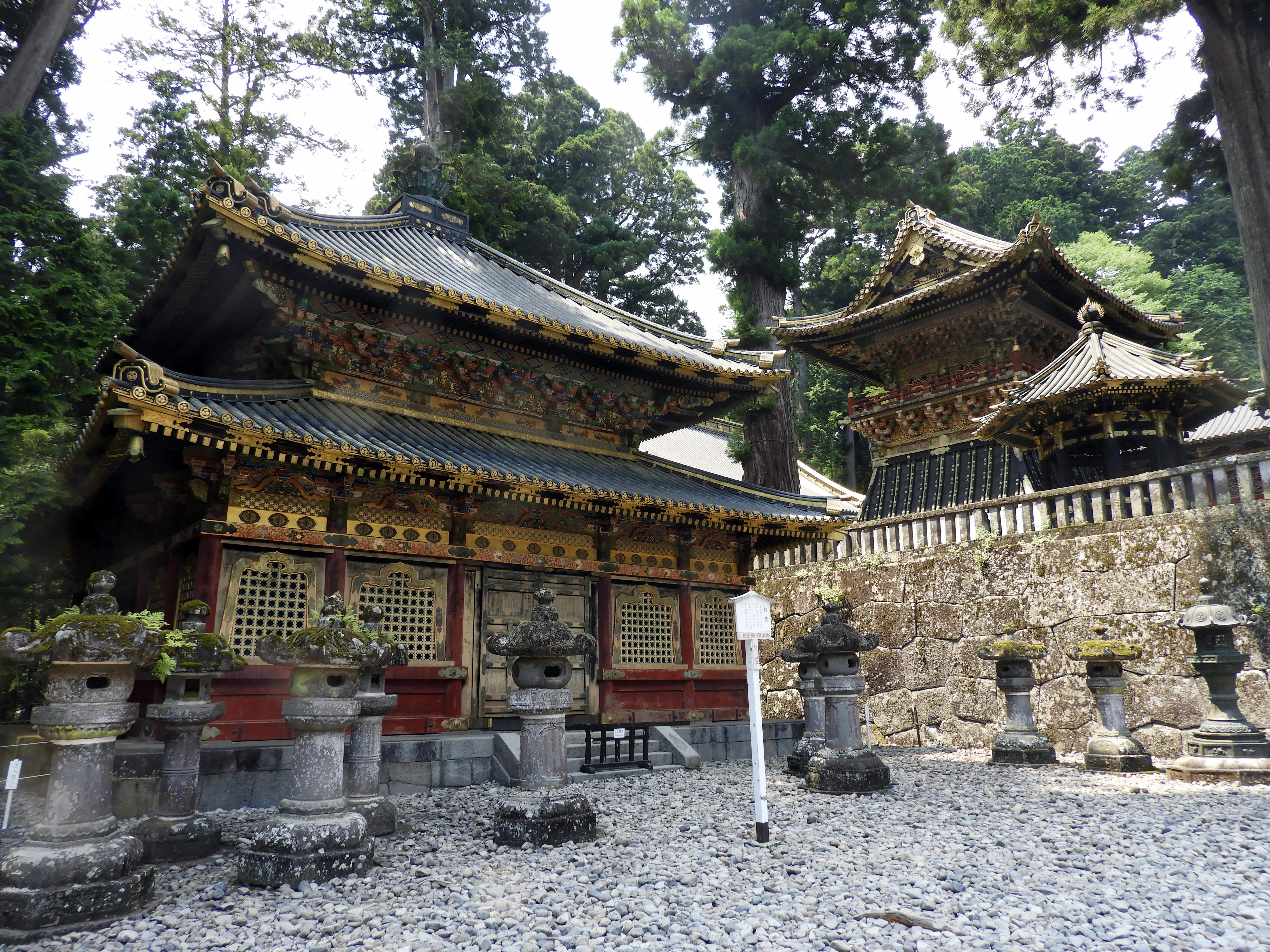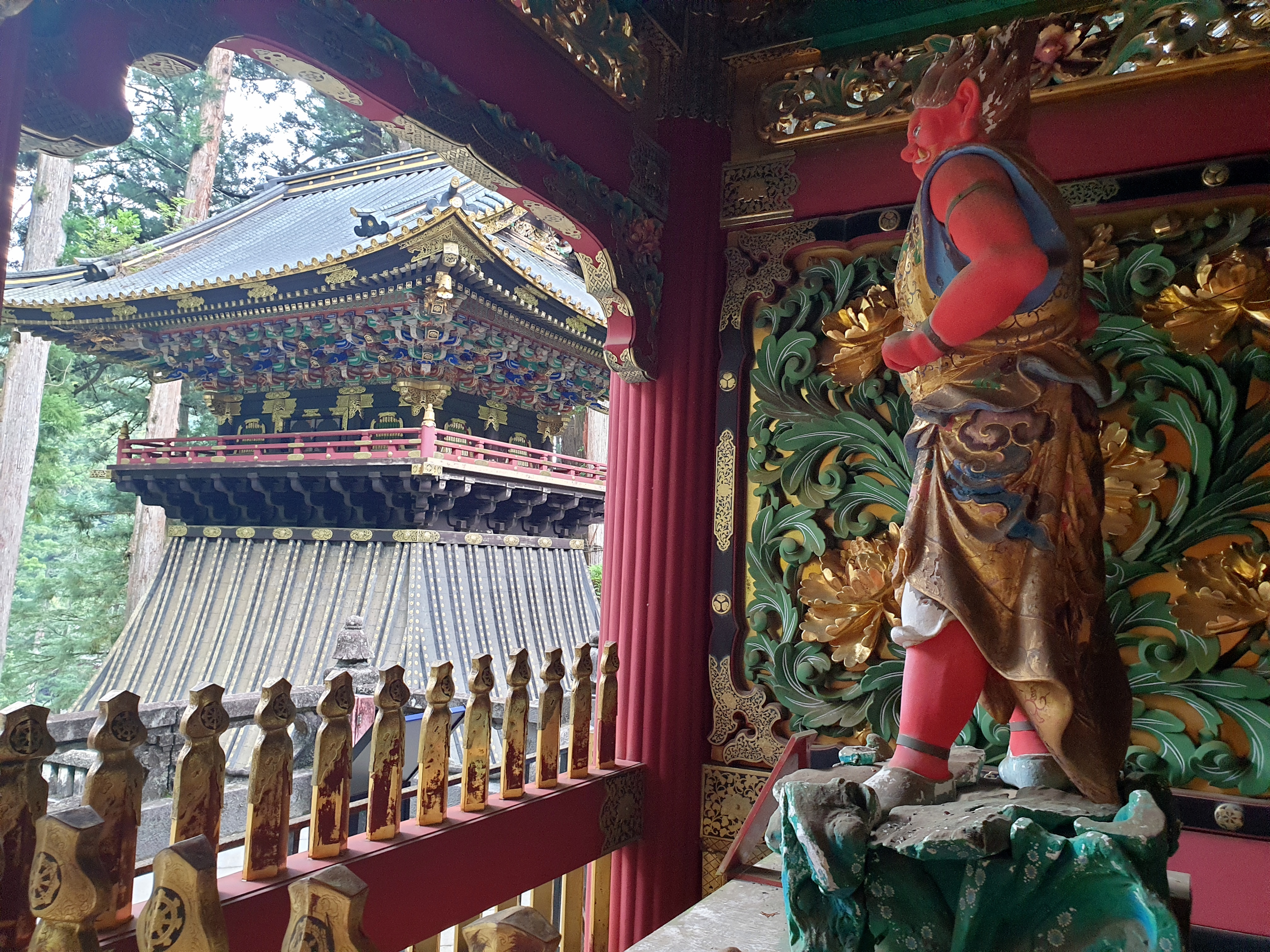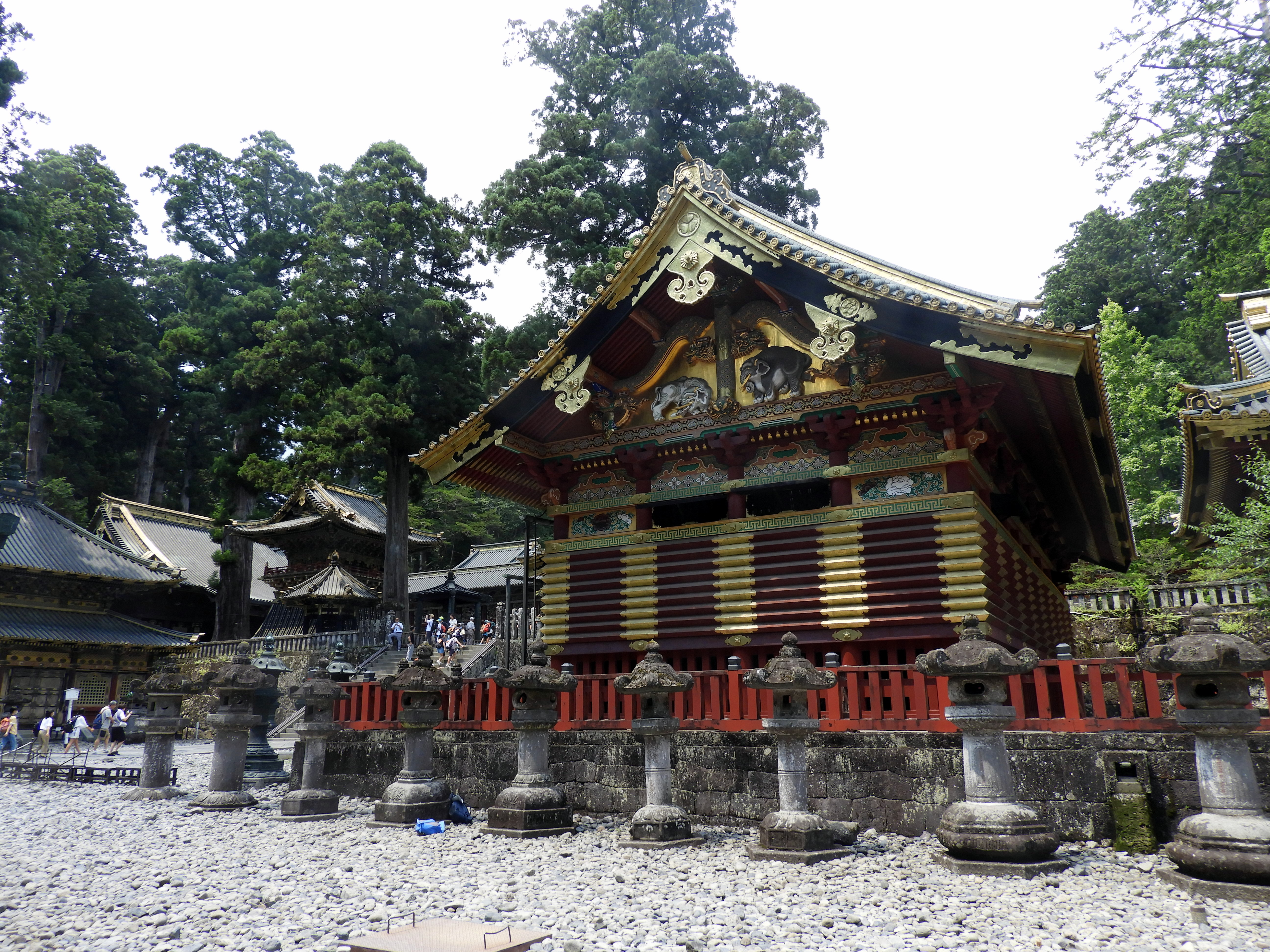 Ir a Nikko, que se encuentra al pie de escarpadas montañas, muy boscosas como todas las que hemos visto por Japón, significa ir para visitar el templo de Toshogu. Este templo, que es precioso en sí, ve acrecentados sus encantos por el lugar que ocupa, en un bosque de imponentes cedros. El lado negativo es que había muchos turistas visitándolo y, entre ellos, varias excursiones de colegios. Aun así, su belleza te capta y puedes dedicarle un buen rato para pasear entre sus distintos edificios y contemplar sus ornamentos de colores.
