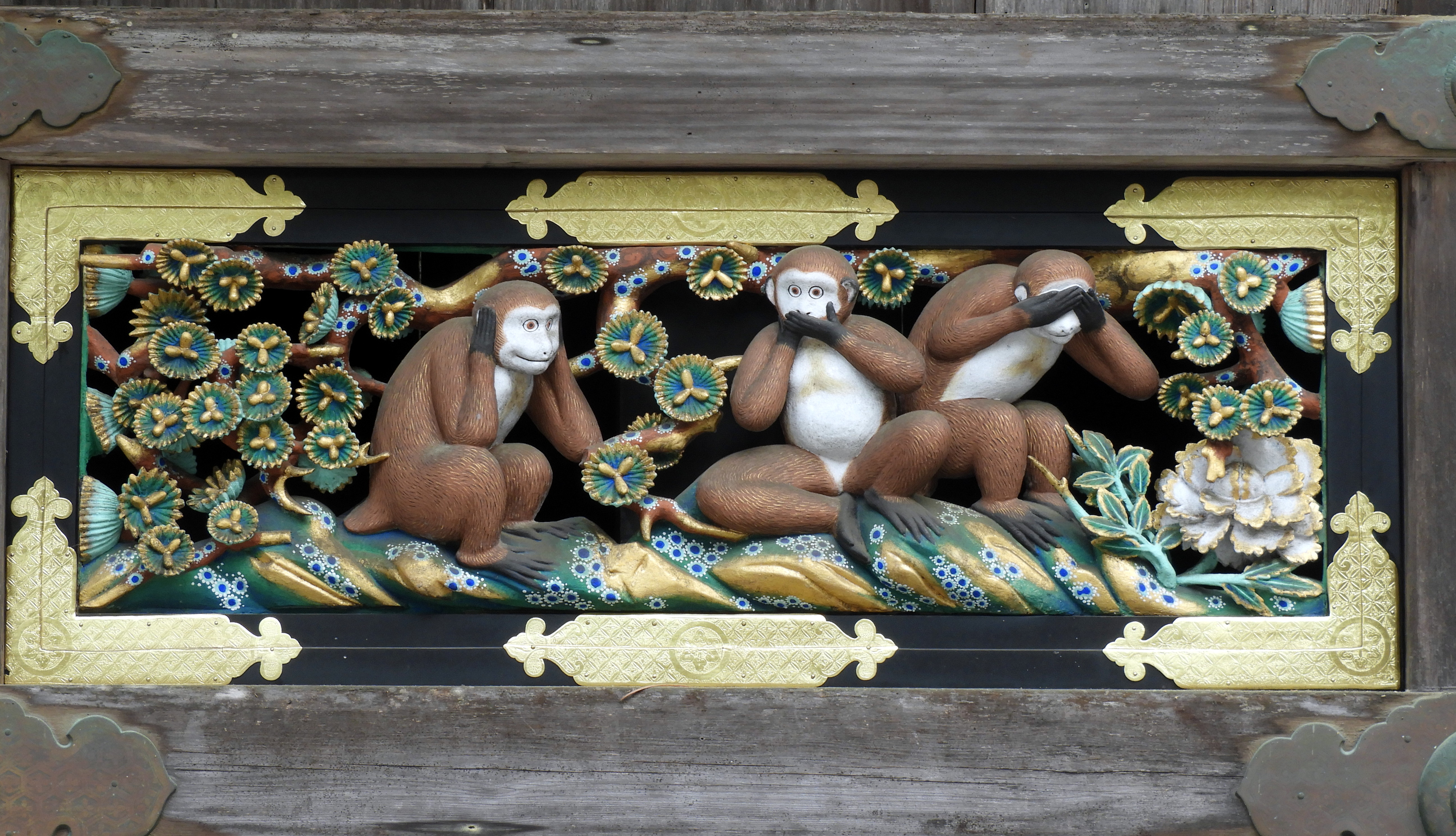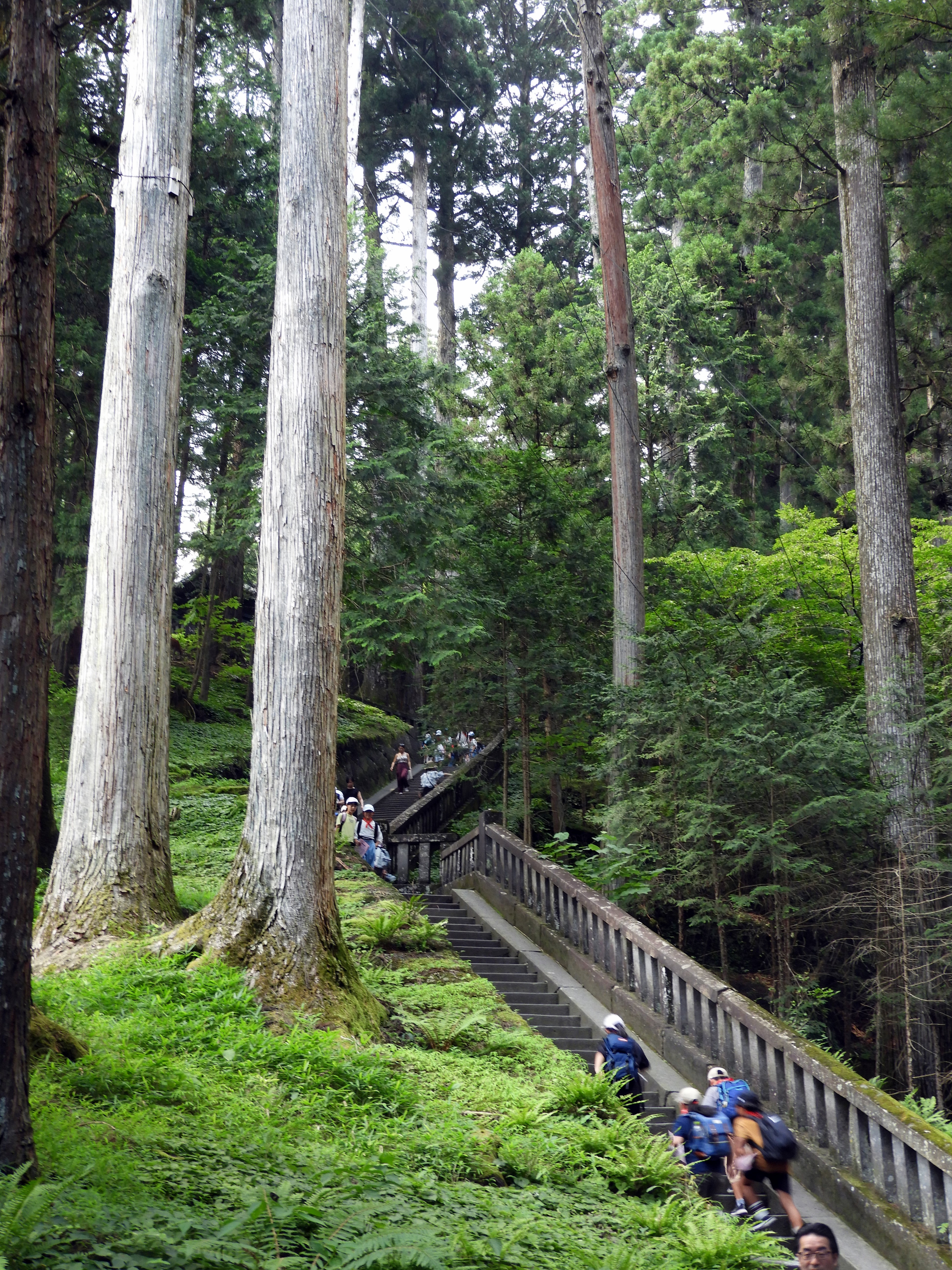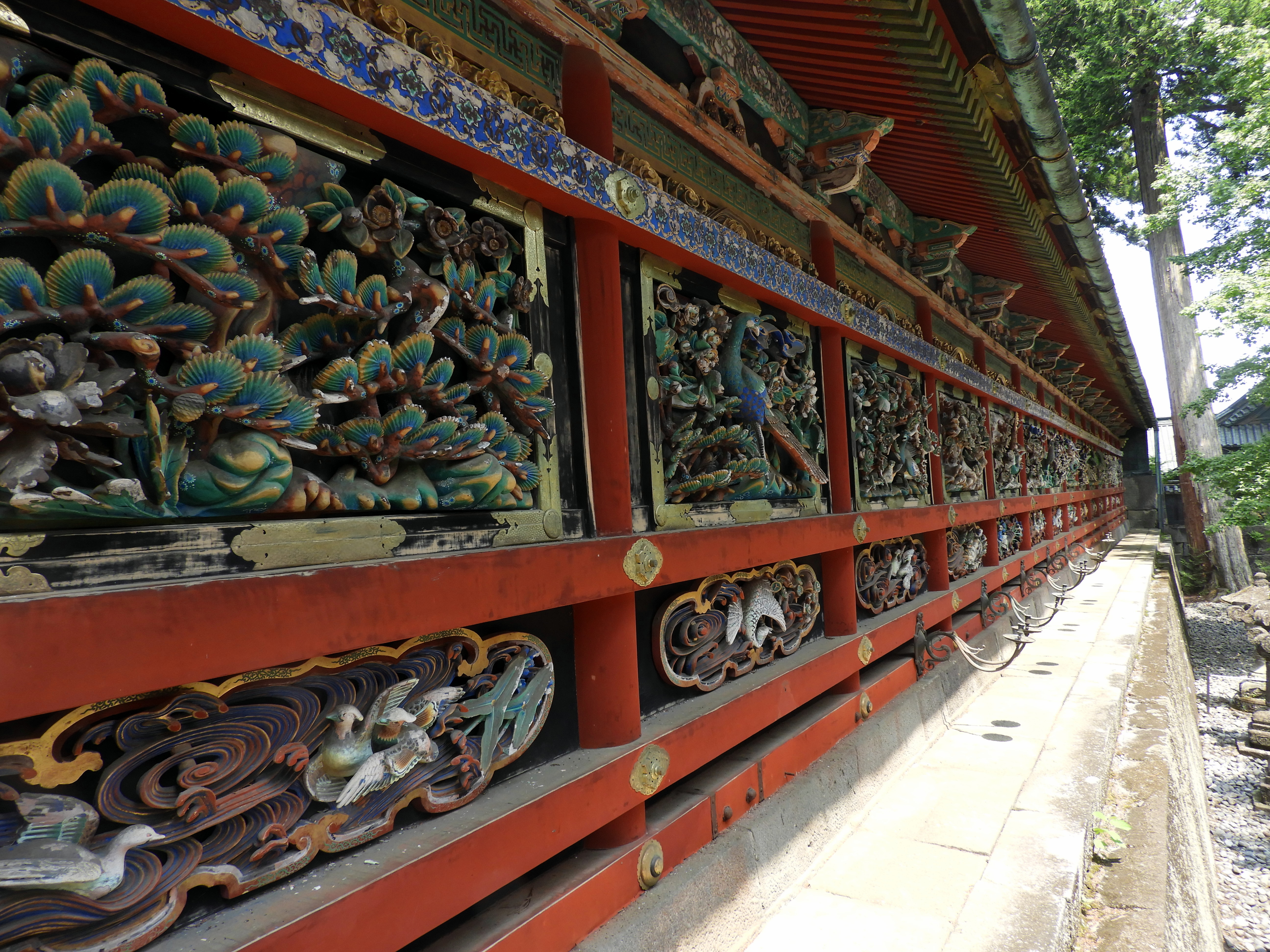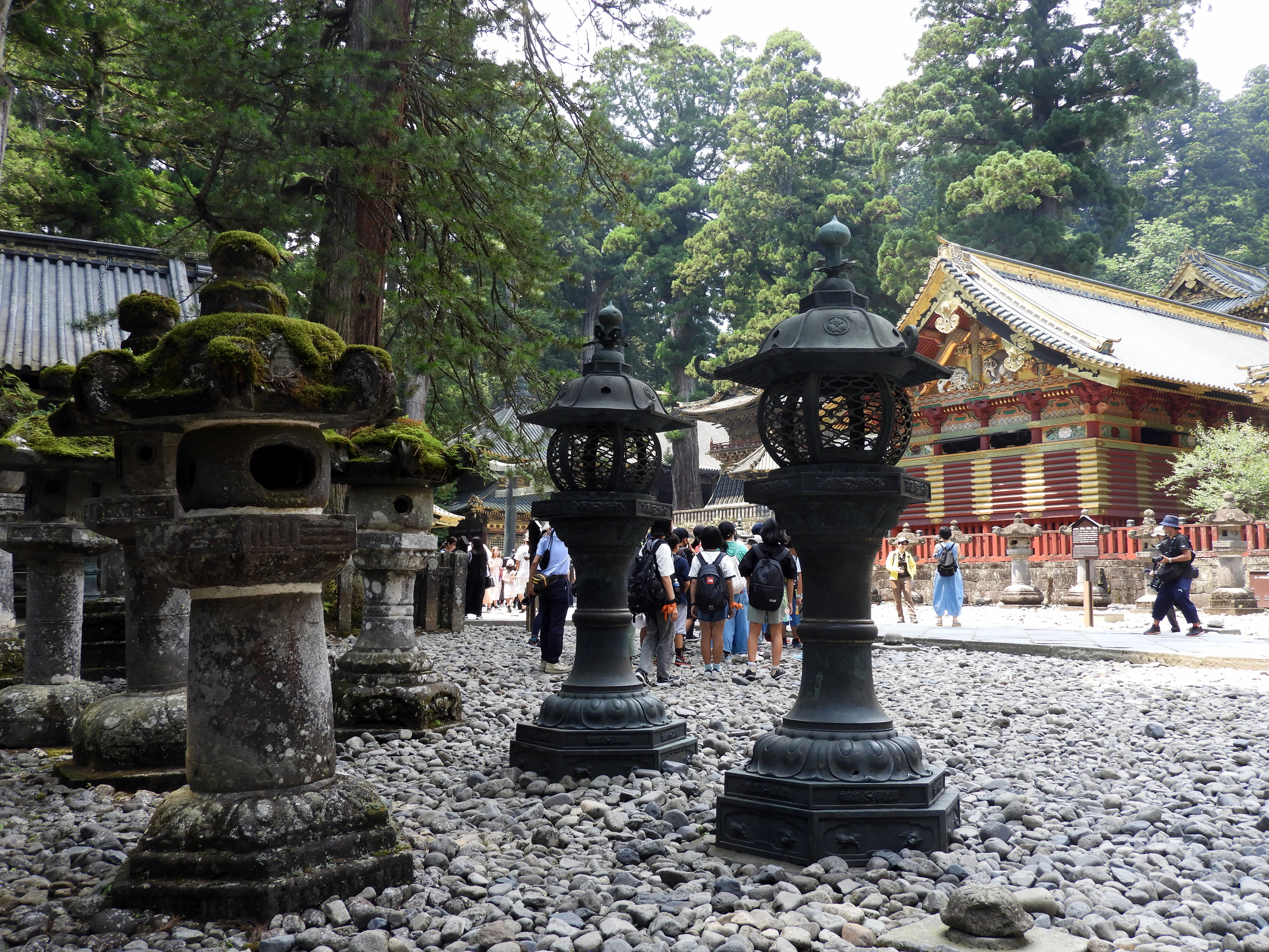 Ir a Nikko, que se encuentra al pie de escarpadas montañas, muy boscosas como todas las que hemos visto por Japón, significa ir para visitar el templo de Toshogu. Este templo, que es precioso en sí, ve acrecentados sus encantos por el lugar que ocupa, en un bosque de imponentes cedros. El lado negativo es que había muchos turistas visitándolo y, entre ellos, varias excursiones de colegios. Aun así, su belleza te capta y puedes dedicarle un buen rato para pasear entre sus distintos edificios y contemplar sus ornamentos de colores.
