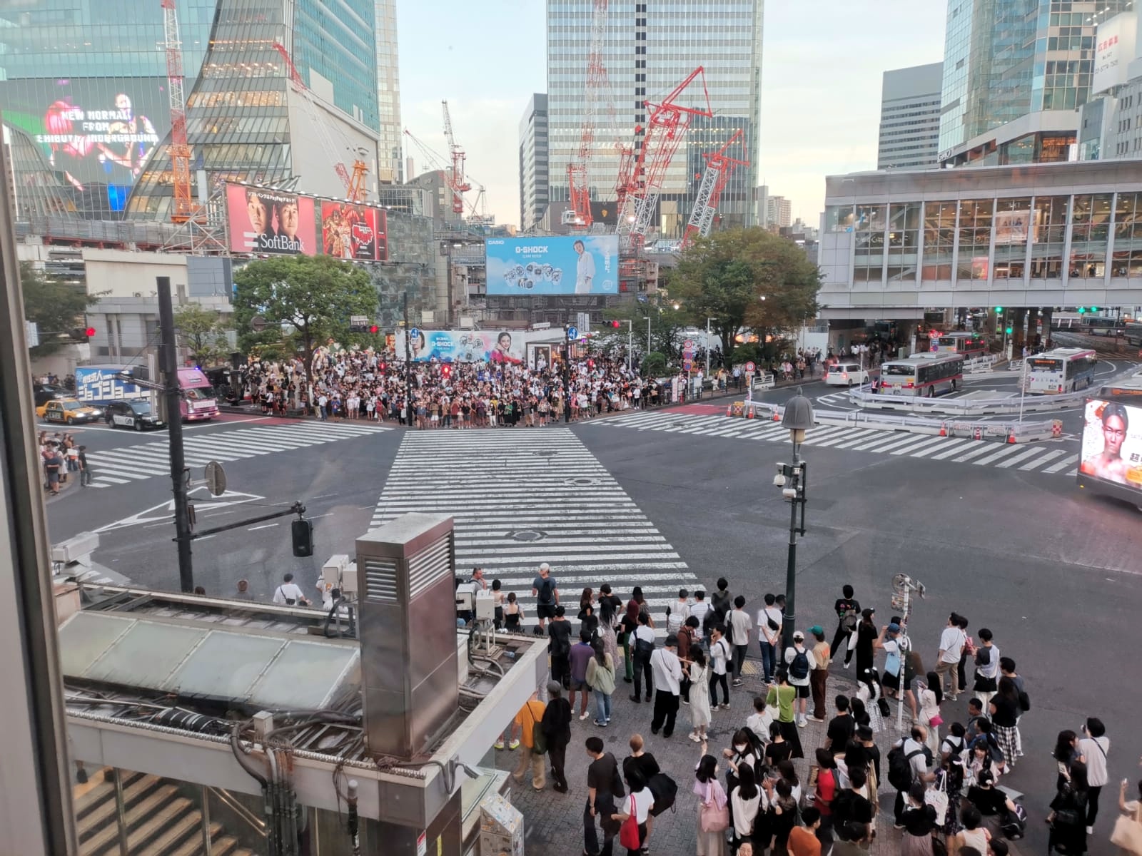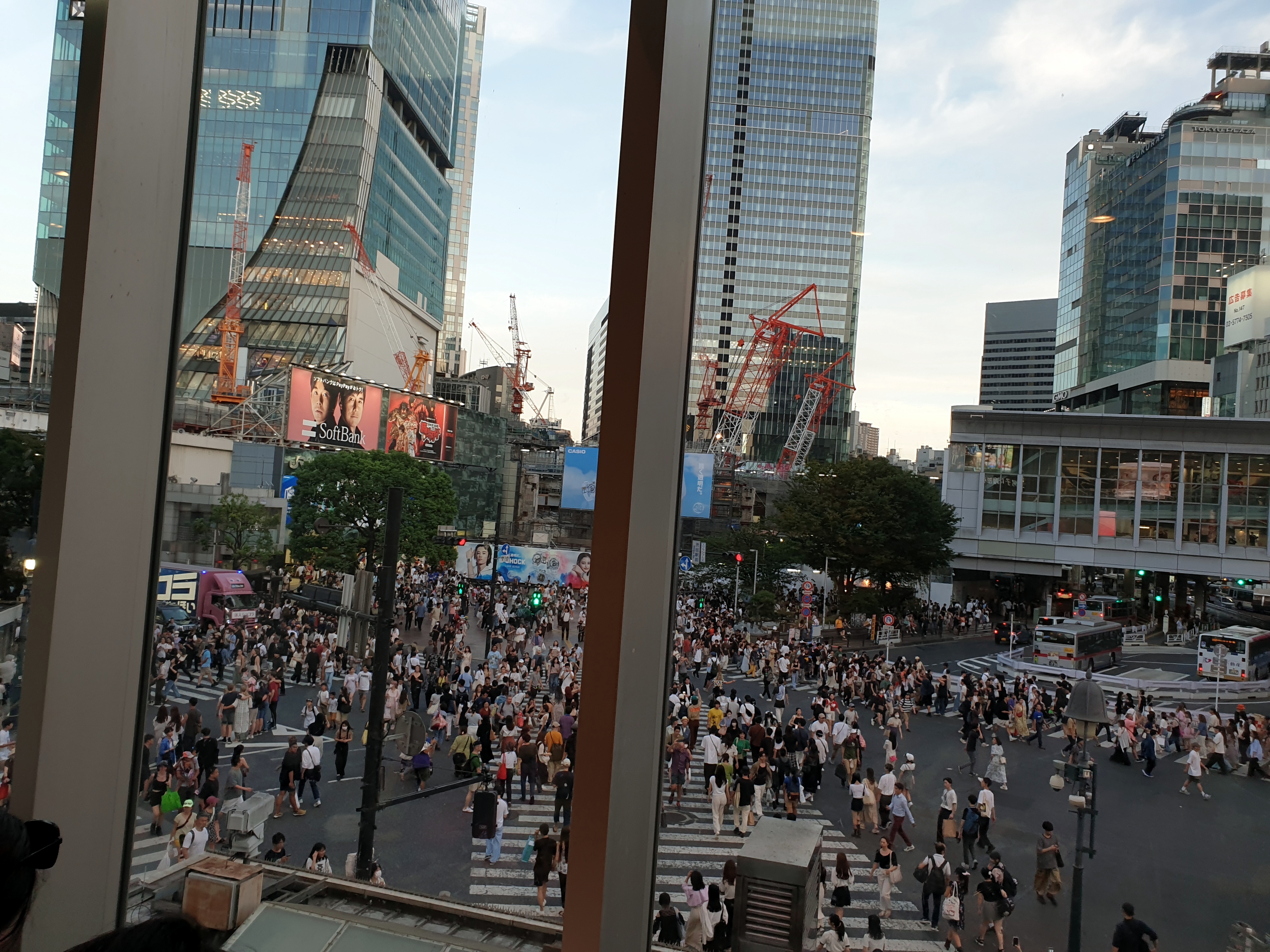 Tras esto, queríamos cerrar la tarde yendo al famoso cruce de peatones de Tokio, así que tomamos de nuevo la avenida de Omotesando y luego nos desviamos por otras calles en dirección a la estación de Shibuya. Tomamos una calle tranquila y peatonal bastante curiosa, llamada Cat Street, con algunas casitas bajas y muchas tiendas de marcas caras. Finalmente llegamos de nuevo a zona de neones de colores. Ahí estaban la estación de metro de Shibuya y el famoso cruce peatonal. Según dicen, hasta 2500 personas pueden cruzar a la vez por este múltiple paso de cebra, que se abre en diagonal y hacia el resto de las esquinas. En realidad, son muchos los cruces de este tipo en Tokio, pero este es el que se ha hecho famoso y ya sabemos cómo es esto de la fama… Se pone el semáforo en verde y una masa de gente se lanza hasta cruzarse en el centro, los turistas se graban cruzándolo… Para ver el espectáculo desde arriba, nosotros (y mucha gente) subimos al primer piso de un Starbucks que hay justo ahí.