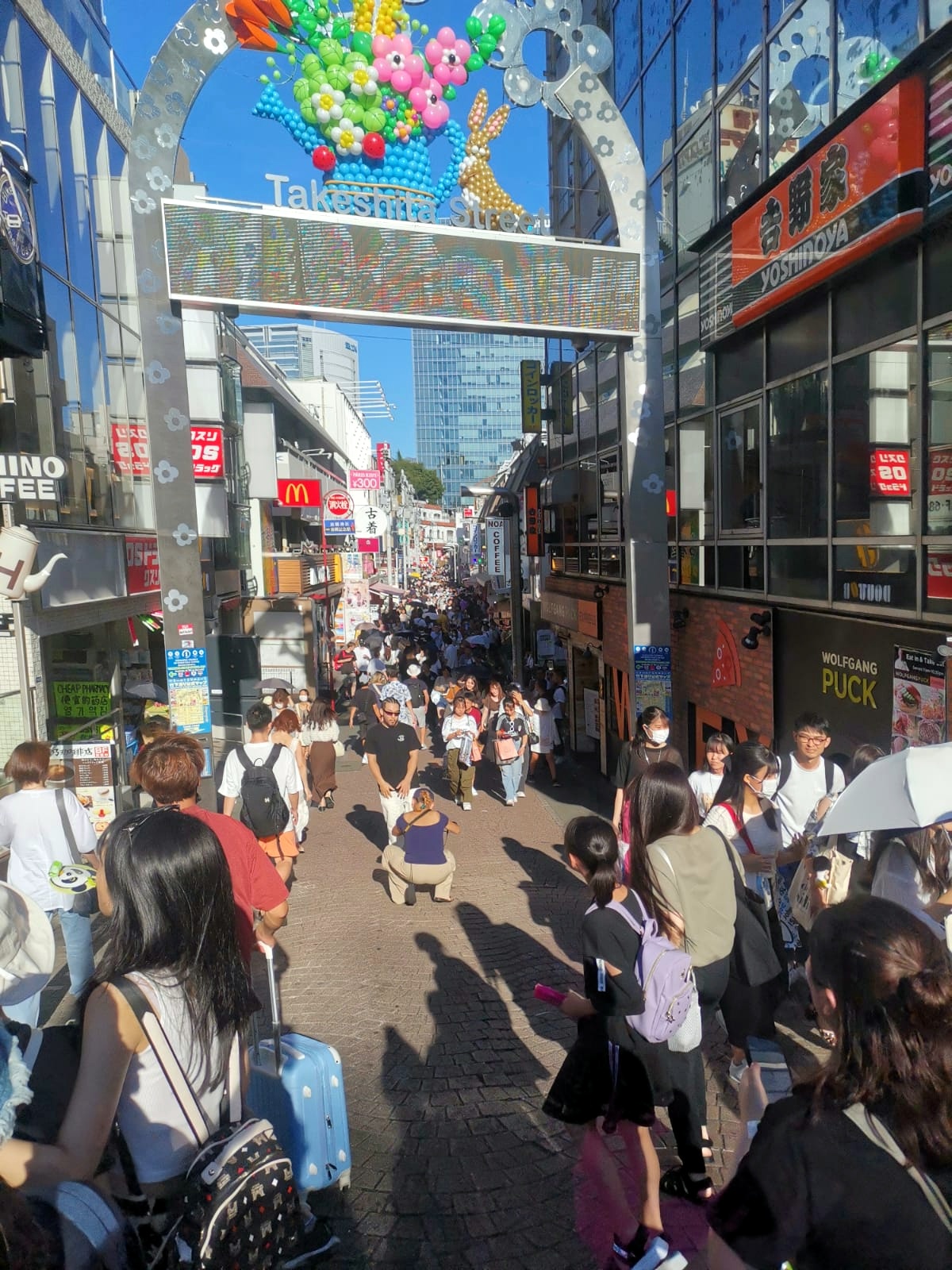Llegamos a Tokio al mediodía y, como en Japón siempre hay que esperar a las 15:00 para hacer el check-in de los hoteles, comimos cerca y lo hicimos luego. Así que nos quedaba una tarde para empezar a conocer esta zona de la capital. Decidimos pasarla por Shibuya, así que fuimos a Harajuku y la calle Takeshita, que es una zona en la que abundan las tiendas de ropa de los más diversos estilos, desde el gótico hasta el colorido decora kei, pasando por el cosplay. Además, podrás encontrar también muchas tiendas de ropa vintage y de segunda mano, tiendas de dulces, de recuerdos, de artículos de manga y ¡hasta una churrería! Por lo que el principal atractivo de esta zona es curiosear el lado más «friki» de Japón y observar a la gente que lo frecuenta.
