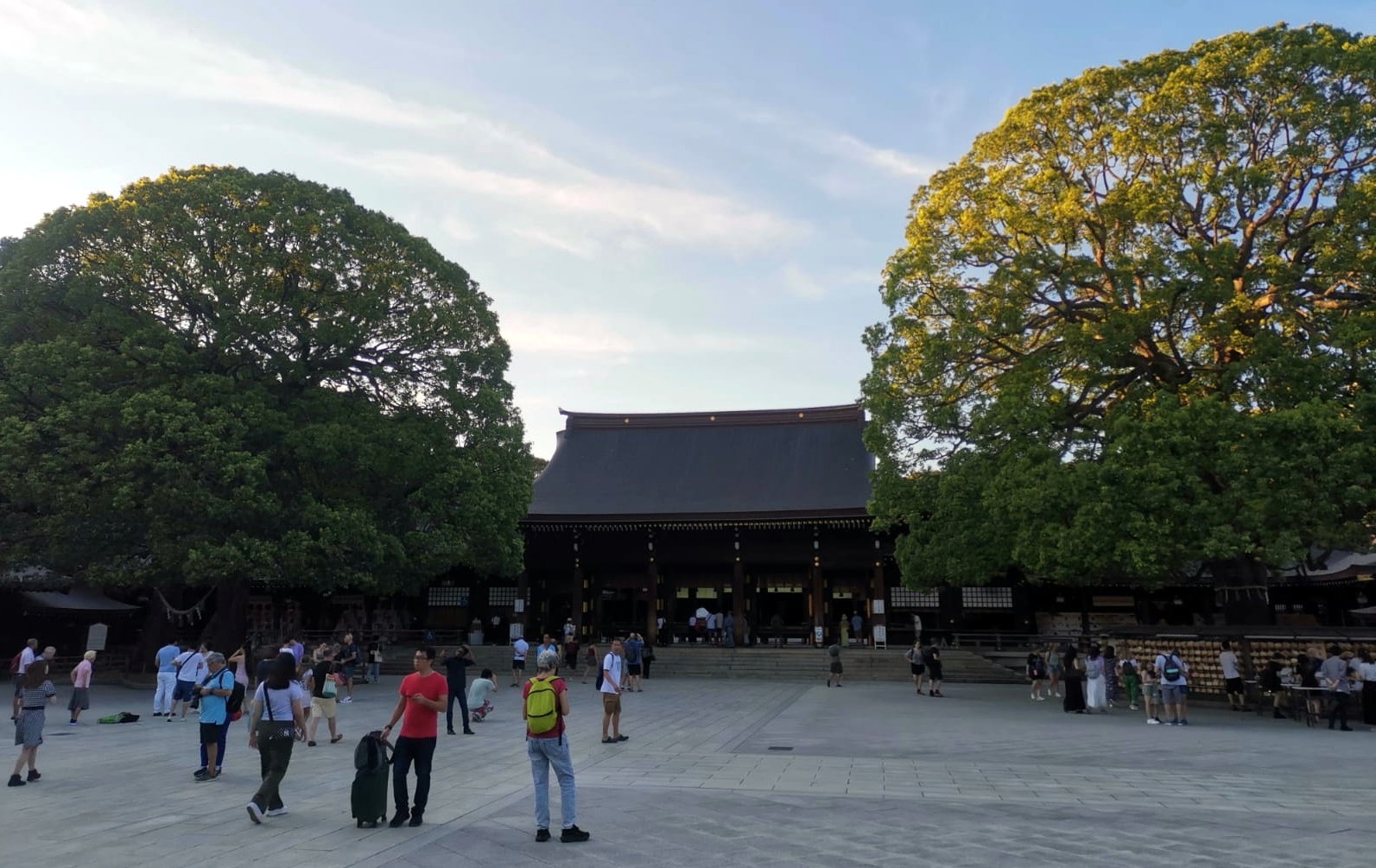 Después de pasar un rato en Takeshita, tomamos la calle de Omotesando para subir al parque Yoyogi. Esta amplia avenida contrasta con el resto de las grandes calles de Tokio, pues, aunque también tiene grandes edificios futuristas, neones y tiendas, tiene árboles que le dan sombra y frescor y, de alguna manera, le conceden un poco de calma. El parque Yoyogi tiene anchos caminos y frondosas zonas de altos árboles, por lo que parece que paseas junto a un bosque en el que no puedes adentrarte. Nosotros tan sólo paseamos un poco por él hasta llegar al templo Meiji Jingu, que era un rincón bonito y tranquilo.