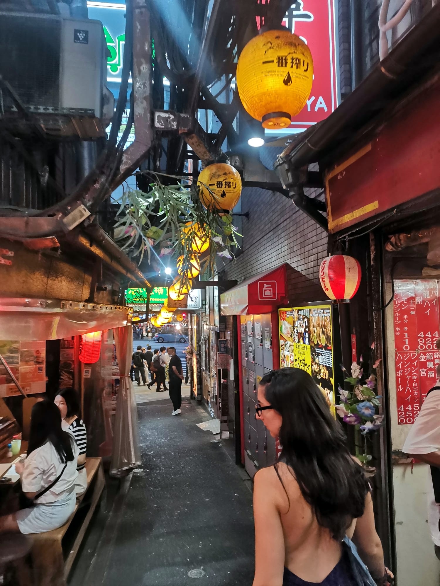 Por lo tanto, tras nuestra breve visita a Odaiba, nos fuimos a conocer Shinjuku. En Shinjuku, que es de nuevo uno de esos barrios tokiotas de neones, ajetreo y colores, callejeamos por el barrio de Kabukicho, que es el barrio rojo de Tokio, y por las calles de Golden Gai, que esconden una curiosa zona de bares. Ambas cosas colindan. Sin embargo, nosotros las visitamos por la tarde, cuando en realidad el momento más interesante para vivirlas debe de ser de noche. Los callejones escondidos de Golden Gai parecen una zona de fiesta de minúsculos baretos algo pintorescos enclaustrados en casuchas sucias que parecen chabolas de un barrio pobre. Sólo por entrar, en la mayoría te piden ya que pagues una tasa, así que, entre eso y que casi todo estaba todavía cerrado y medio vacío porque era muy pronto, nosotros no entramos a ningún bar, pero es una zona interesante para ir a curiosearla.