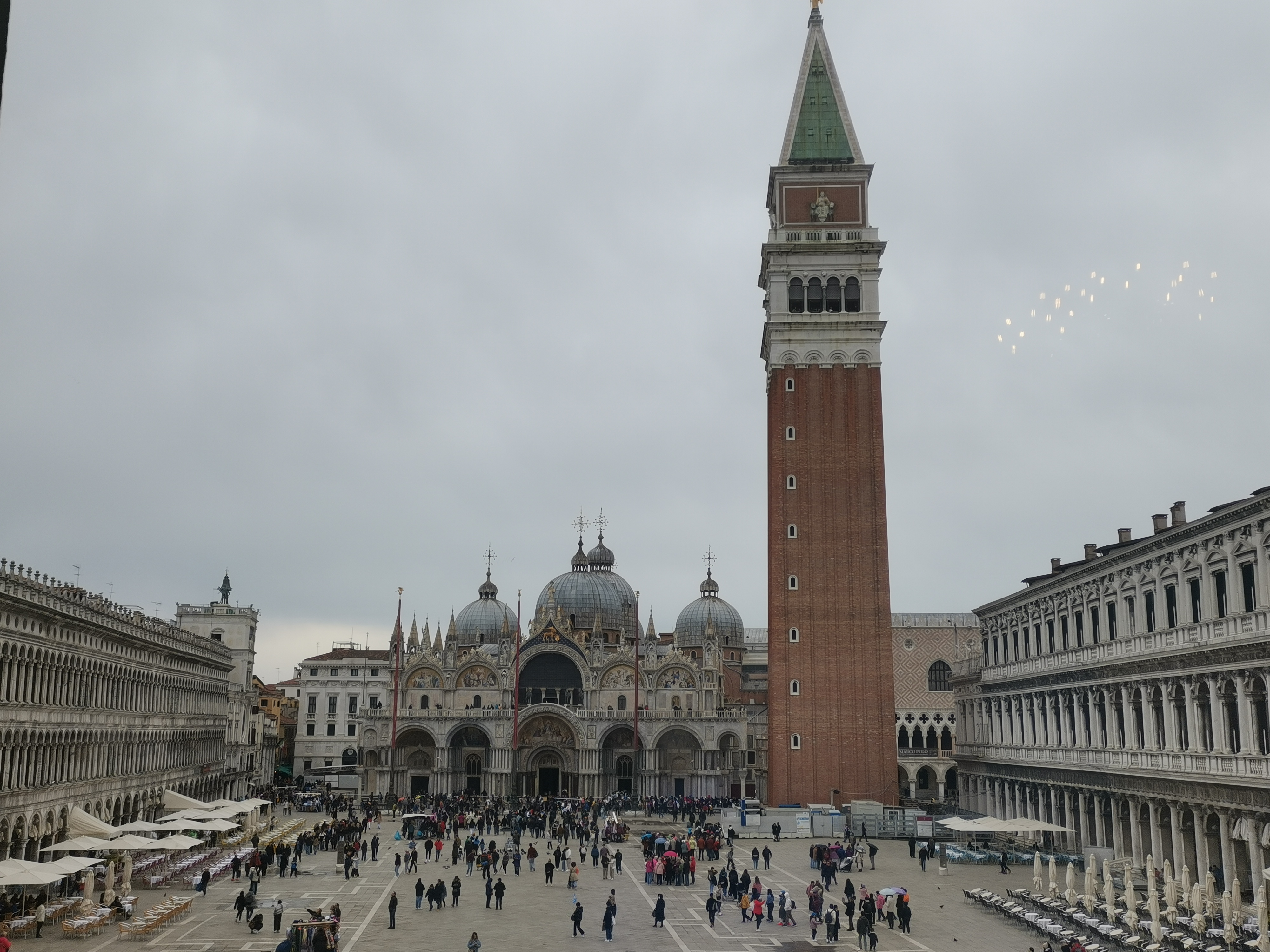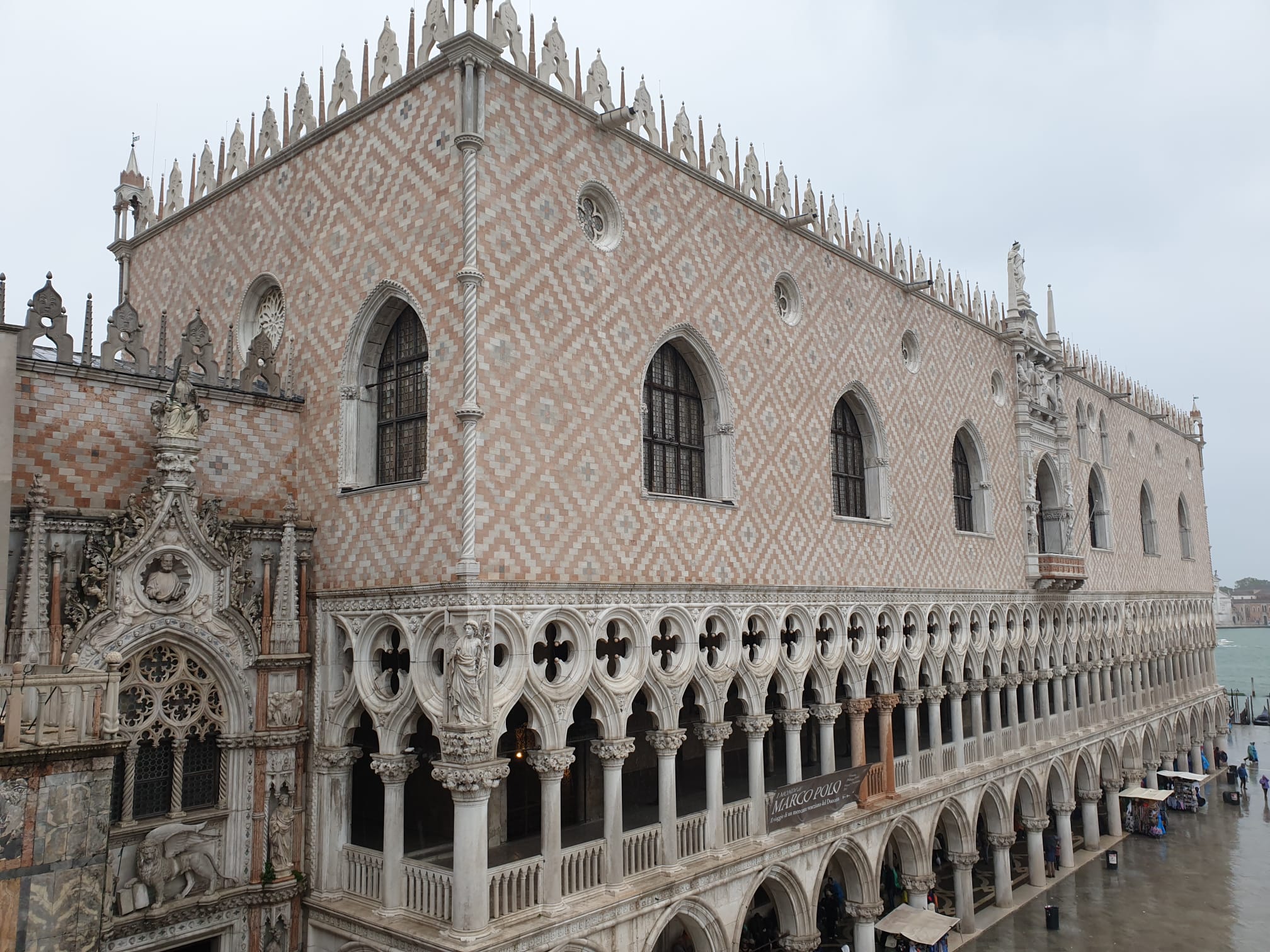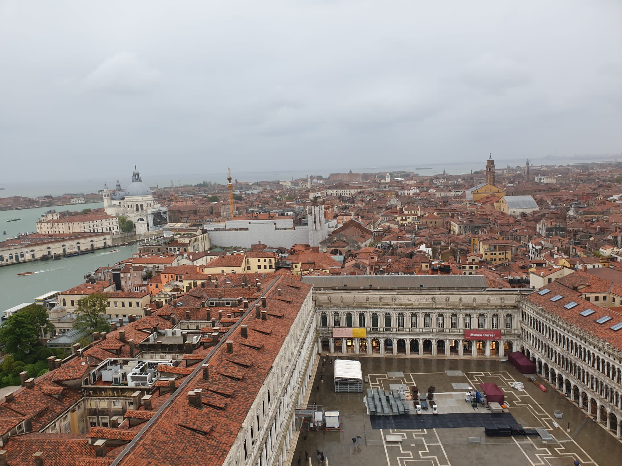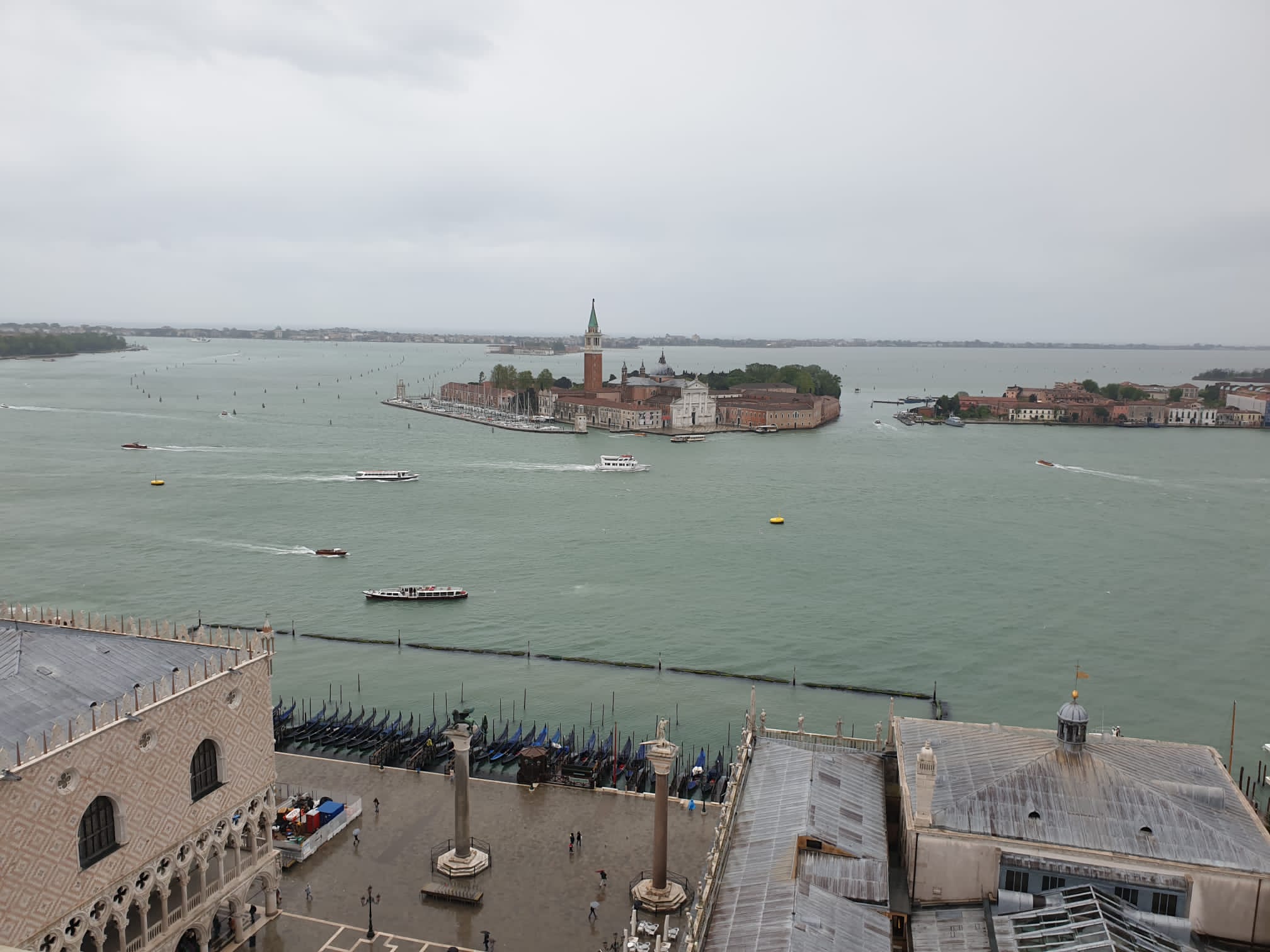 Después de haber visitado la basílica, yo subí al Campanile, mientras Jorge daba un paseo por los soportales de la plaza, para visitar alguna exposición más de la Biennale. El tiempo era tan malo que no había ni siquiera fila para subir y, además, avisaban de que quien subiera, lo hacía por su cuenta y riesgo. No obstante, confié en que si estaba abierto era por alguna razón y subí. Efectivamente, arriba soplaba tanto viento que por alguno de los costados de la torre costaba asomarse. Sobre todo, porque el viento traía un poco de lluvia. Sin embargo, aunque hay ventanas, la torre está lo suficientemente cerrada como para que no haya ningún peligro a pesar del viento. Así que, aunque la meteorología no invitaba a disfrutar durante mucho rato de las vistas, estas sin duda merecían la pena. Desde tan arriba se pueden ver todo Venecia y el mar de la laguna de Venecia. Lo que me llamó la atención es que no hubiera ni rastro de ningún canal… Viendo las fotos, ¿quién diría que se trata de Venecia? ¡Los propios edificios los tapan y los borran de la vista desde esa perspectiva! Para todos aquellos a quienes, como a mí, les encante adoptar vistas de pájaro de todos los lugares a los que viajan, aunque solo sea por un momentito, creo que merece la pena pagar la entrada y subir al Campanile para ver Venecia.