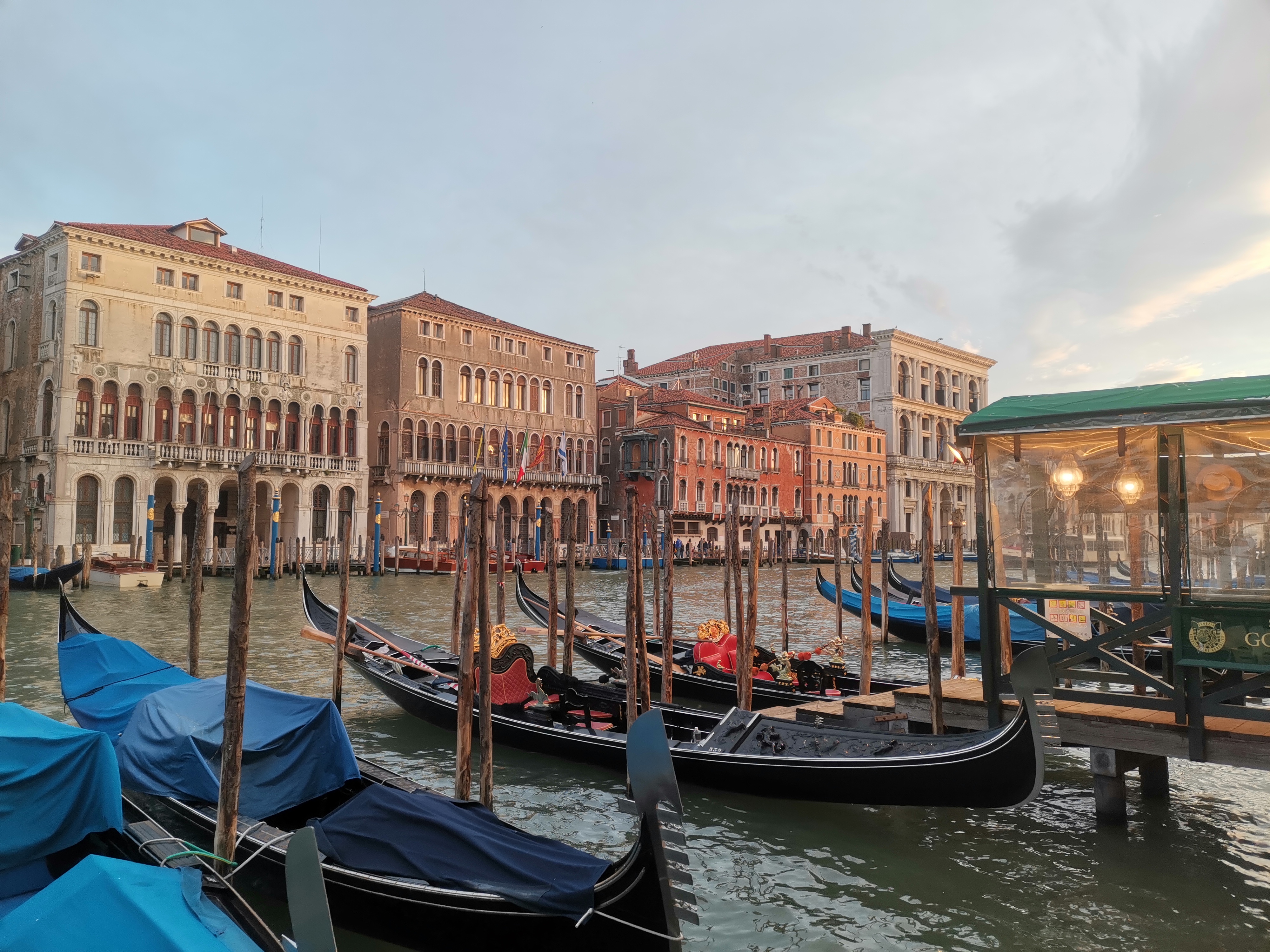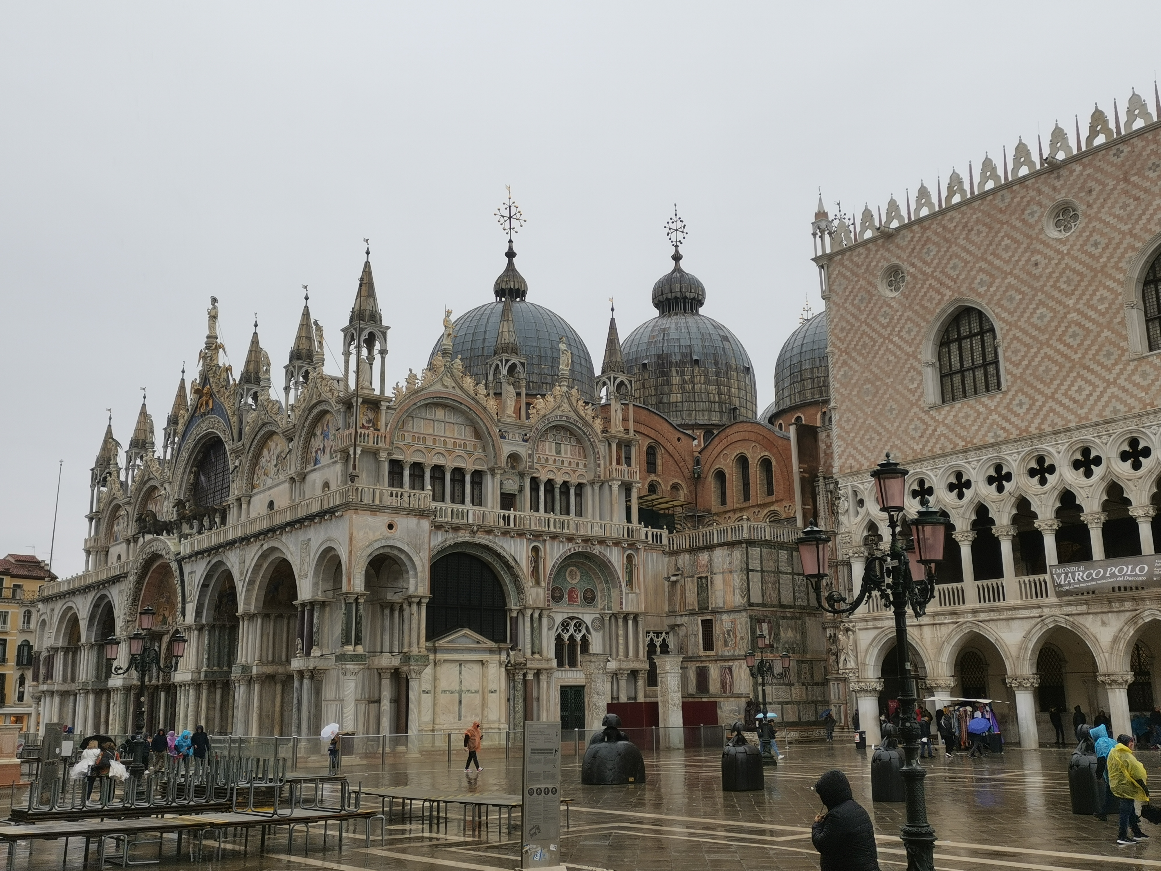 Afortunadamente, por la mañana todavía no llovía. Así que, junto a la estación de Santa Lucía, cerca de donde nos había dejado el autobús al entrar en Venecia, tomamos un vaporetto que nos llevó lenta, tranquilamente, hasta la Plaza de San Marcos. El paseo, bajo un cielo gris y chispeante, fue igualmente precioso, ya que cruzas despacio toda la ciudad, por el canal principal. Además, tuvimos la suerte de poder sentarnos afuera en la parte de delante y disfrutar de las vistas como si se tratase de un tour, pues hay que tener en cuenta que el vaporetto es transporte público urbano y que es muy posible que te toque compartirlo con mucha gente y viajar de pie.