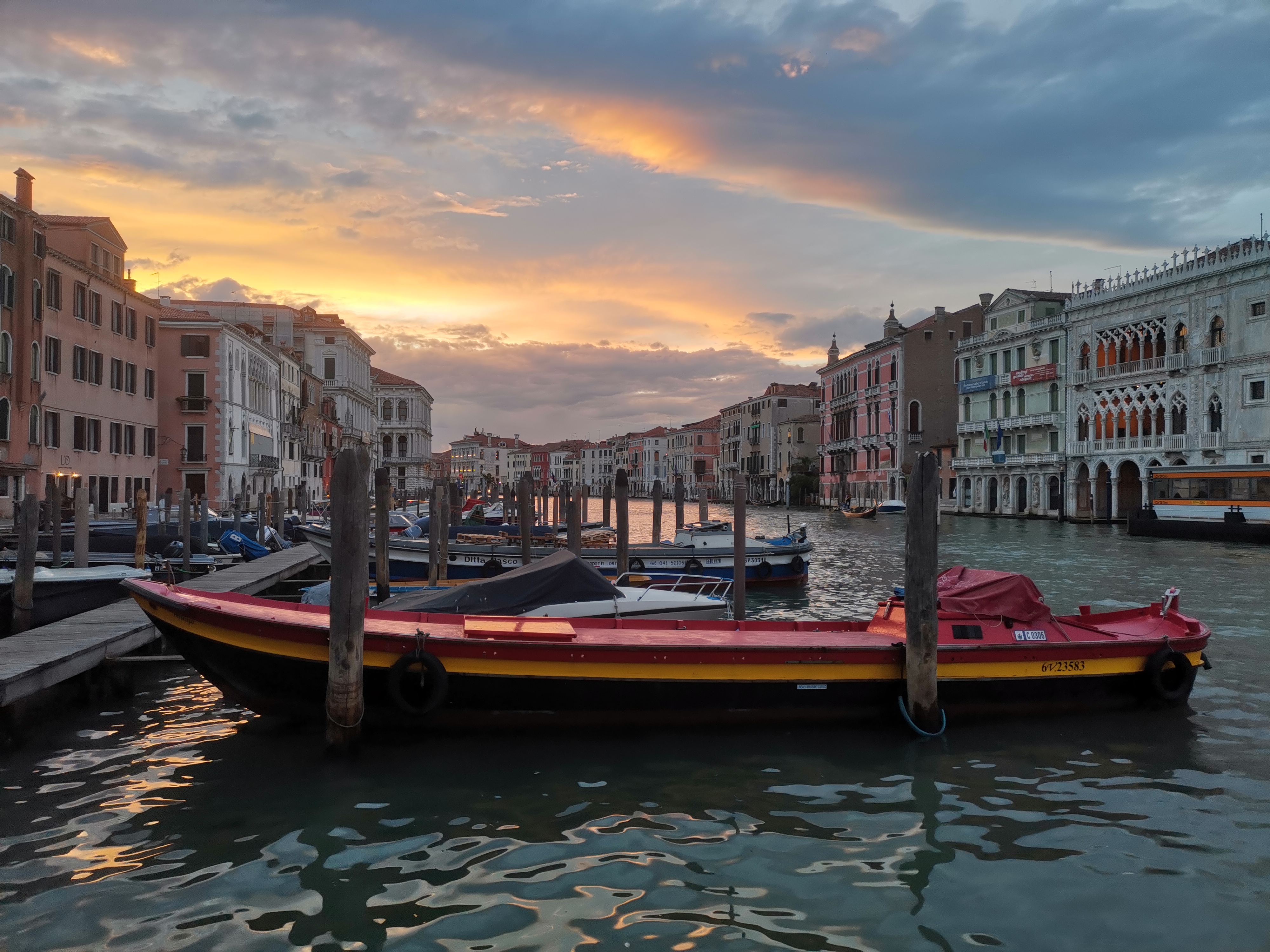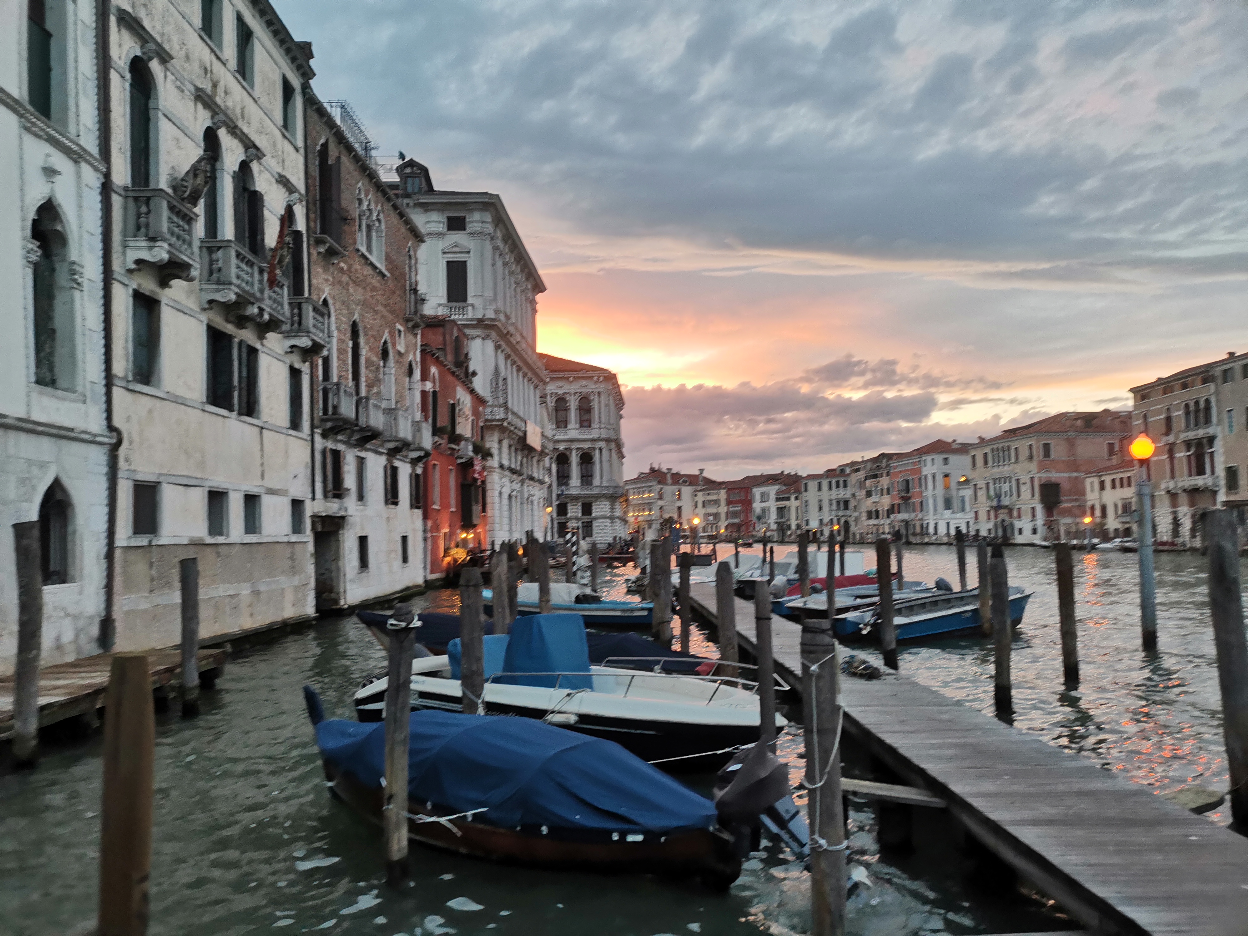 A esas horas, en seguida comenzó a acompañarnos el atardecer y, con los suaves colores terrosos y rosados de las nubes, de los reflejos del agua de los canales y de los viejos palazzos, nuestros pasos acabaron en el Puente de Rialto. Una vez allí, decidimos no cruzar al otro lado del canal principal, que nos llevaría ya a la zona de la Plaza de San Marco y la parte más alejada para nosotros de la ciudad, sino que decidimos desandar el camino para cenar en alguno de los restaurantes que habíamos visto, bien de precio, en el barrio de Santa Croce.