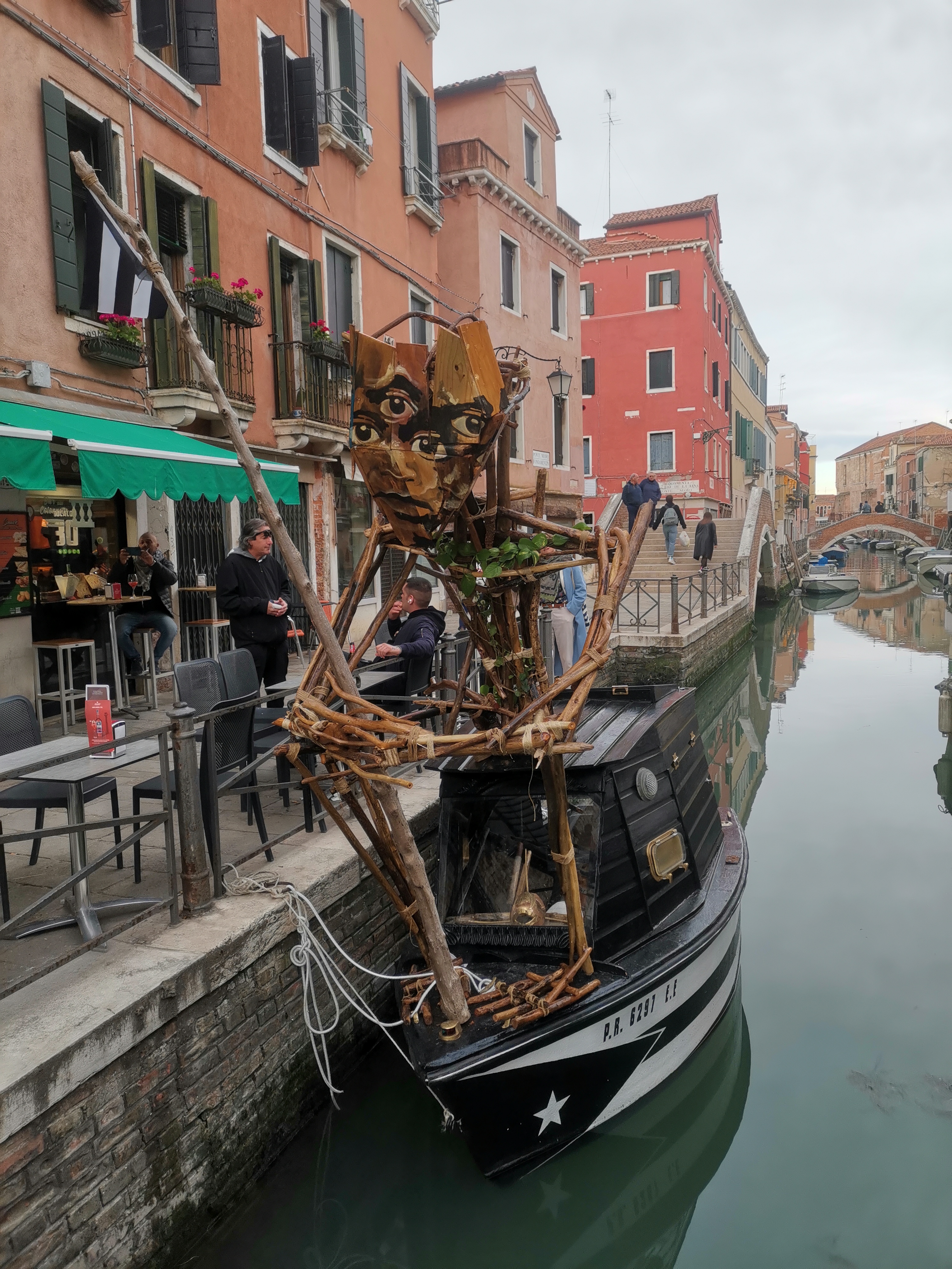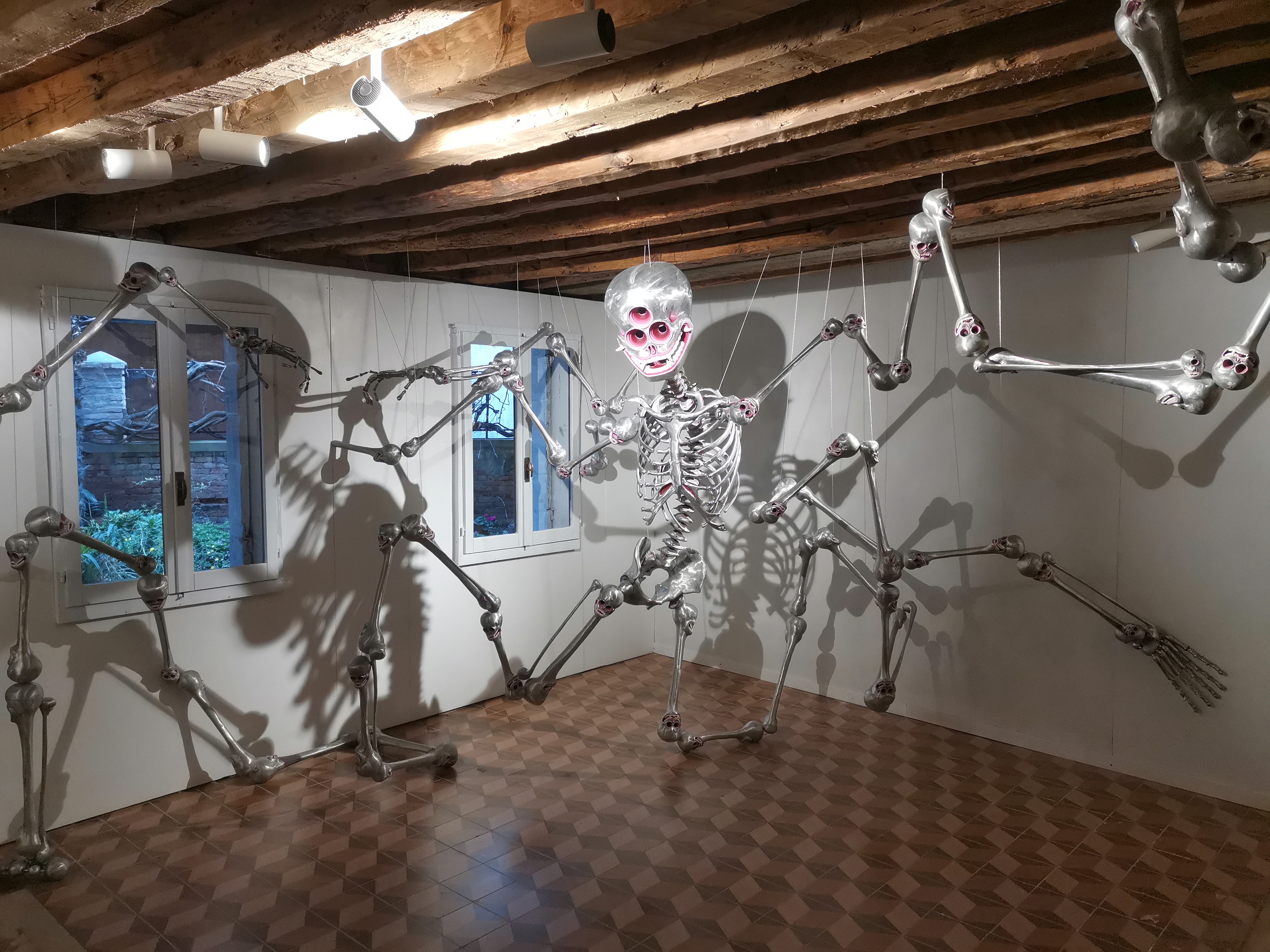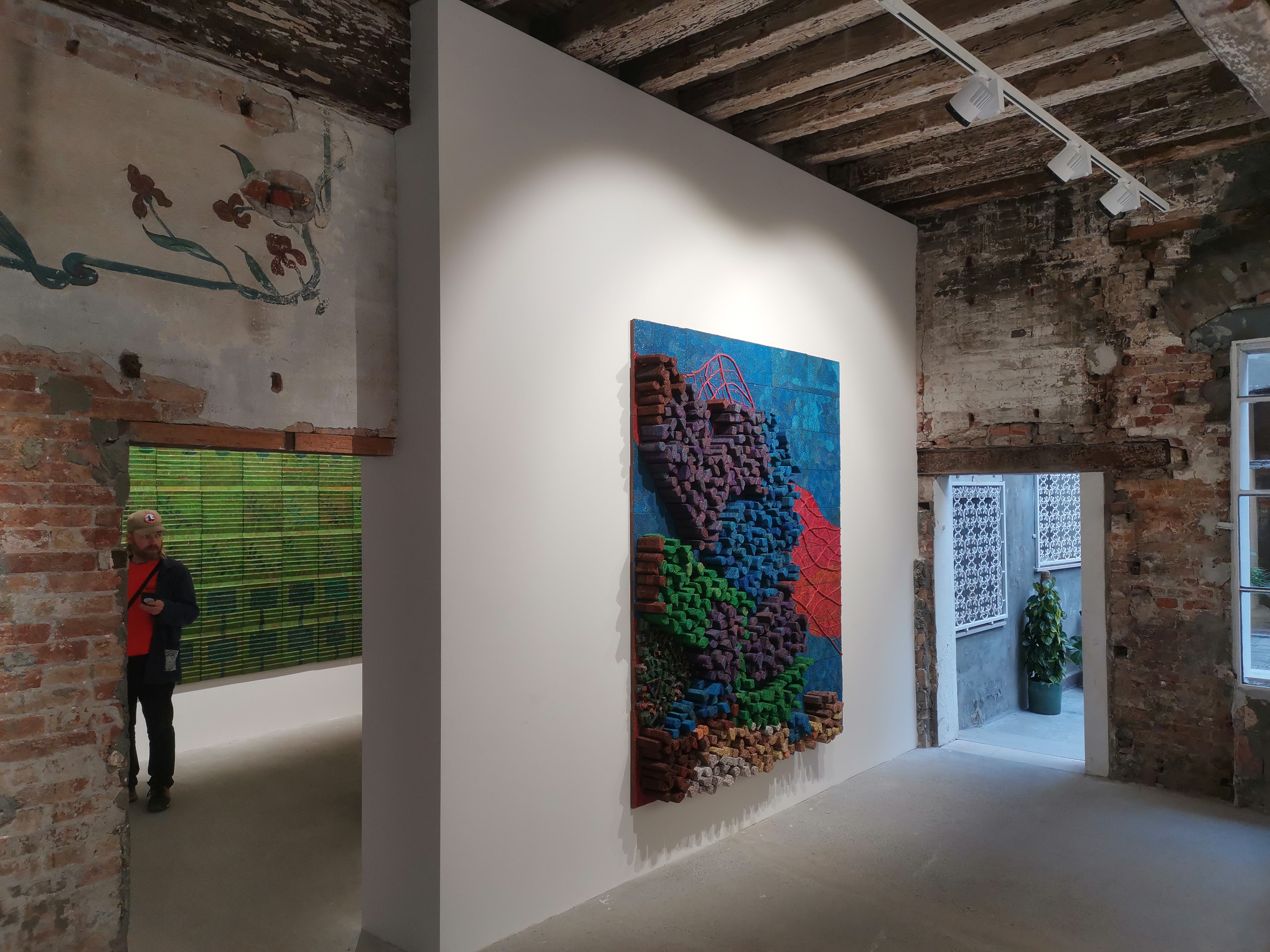 Afortunadamente, la tarde en que volvimos de las islas, nos pusimos a pasear y descubrimos que ¡era la Biennale de Venecia! Así que la ciudad estaba sembrada de pequeñas exposiciones de arte contemporáneo de artistas internacionales con entrada gratuita. Esta grata sorpresa nos permitió disfrutar de una combinación de un paseo por las calles de Venecia y por las exposiciones de un arte actual, por desgracia muy centrado en la guerra y en los abusos de poder (es lo que nos rodea hoy en día), pero muy interesante. Además, estas pequeñas exposiciones en muchos casos estaban alojadas en viejos palazzos, lo que nos permitía ir viendo también el interior de algunos edificios, sus patios… Así pasamos la tarde entretenidos y, tras una deliciosa cena de pizzas en el Rossopomodoro (restaurante con buena relación calidad/precio en el centro de Venecia y que tiene otro restaurante en la estación de tren que es más barato…), dimos un último paseo nocturno muy agradable para volver a la estación de autobuses y, de allí, a Mestre.