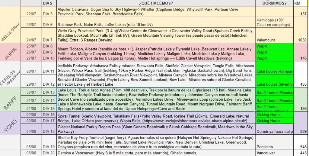 A continuación podéis ver un poco en una hoja de cálculo lo que teníamos planteado en nuestra idea inicial, por desgracia, los incendios que asolaron la zona de Jasper en el verano de 2024, nos hicieron dar un pequeño rodeo y tener que modificar los días del 7 al 10.